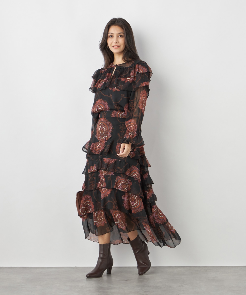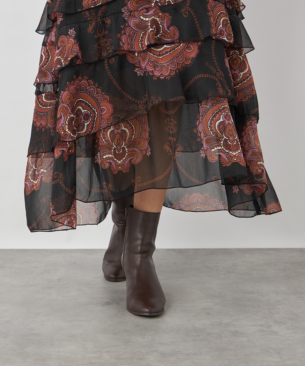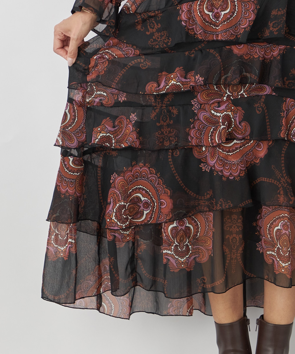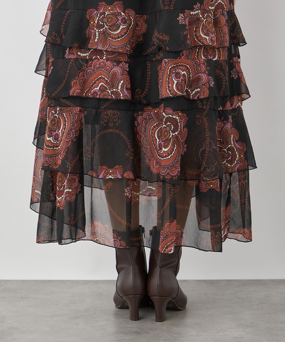 広がりすぎないシルエットに仕上げたことで、たっぷりのフリルデザインでもすっきりと穿きこなせます。大人っぽくエレガントな印象のロング丈を採用。後ろウエストにゴムが入り、フィット感良く身に着けられます。ざっくりとしたニットとのコーディネートがおすすめです。同素材のブラウスもございます。
