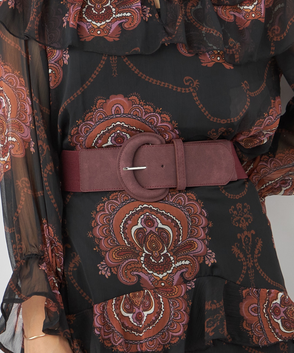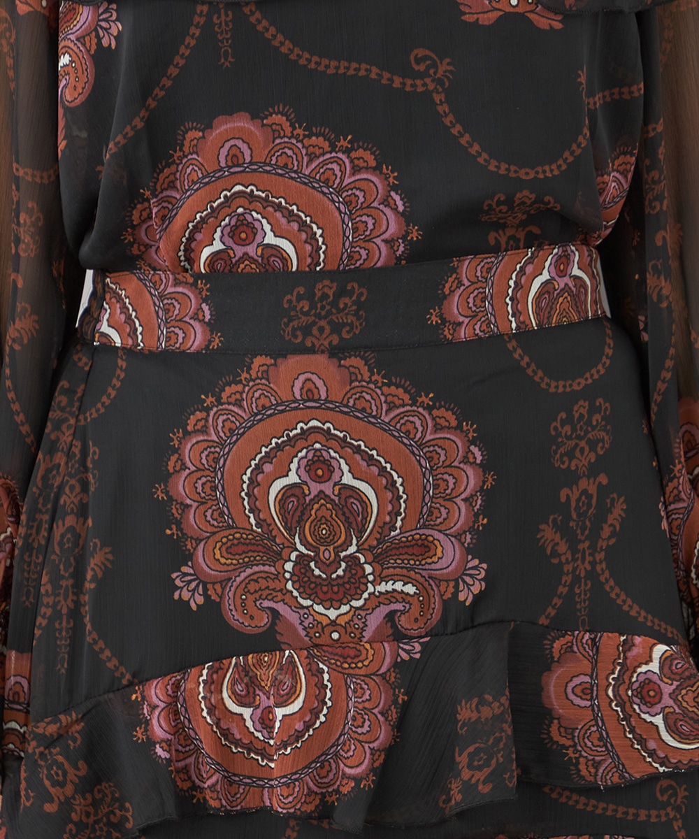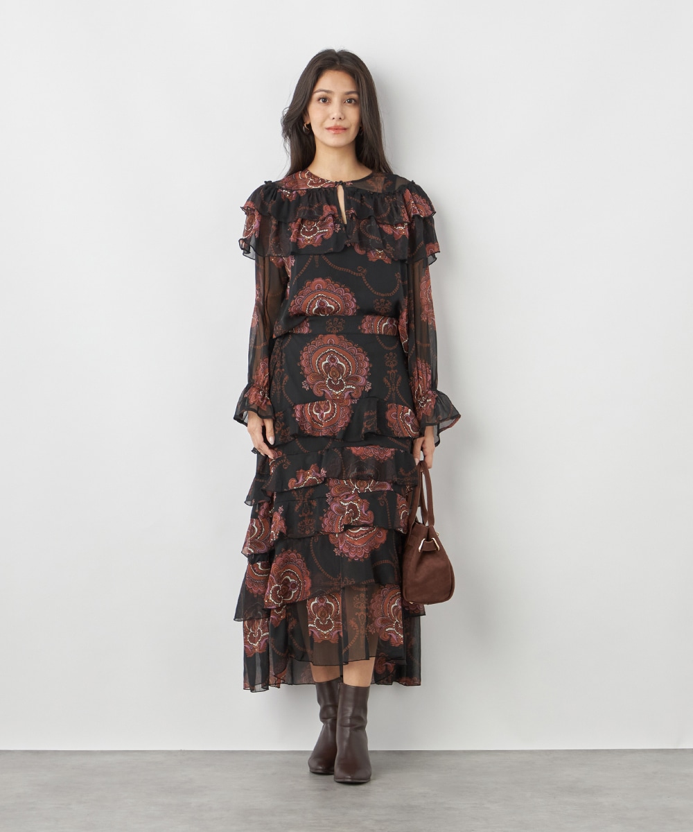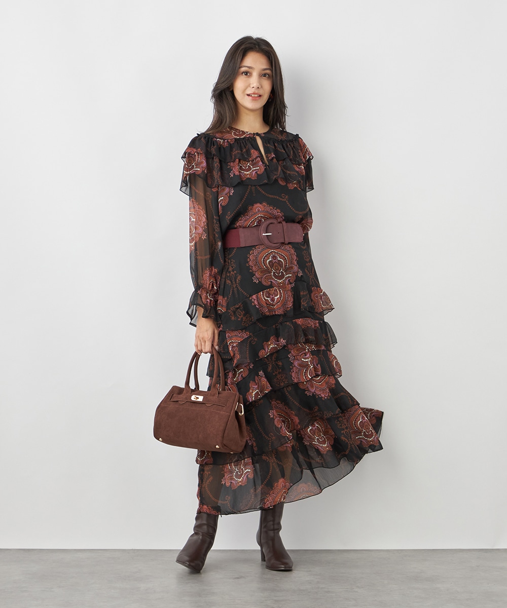 広がりすぎないシルエットに仕上げたことで、たっぷりのフリルデザインでもすっきりと穿きこなせます。大人っぽくエレガントな印象のロング丈を採用。後ろウエストにゴムが入り、フィット感良く身に着けられます。ざっくりとしたニットとのコーディネートがおすすめです。同素材のブラウスもございます。
