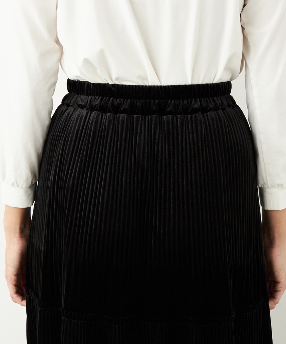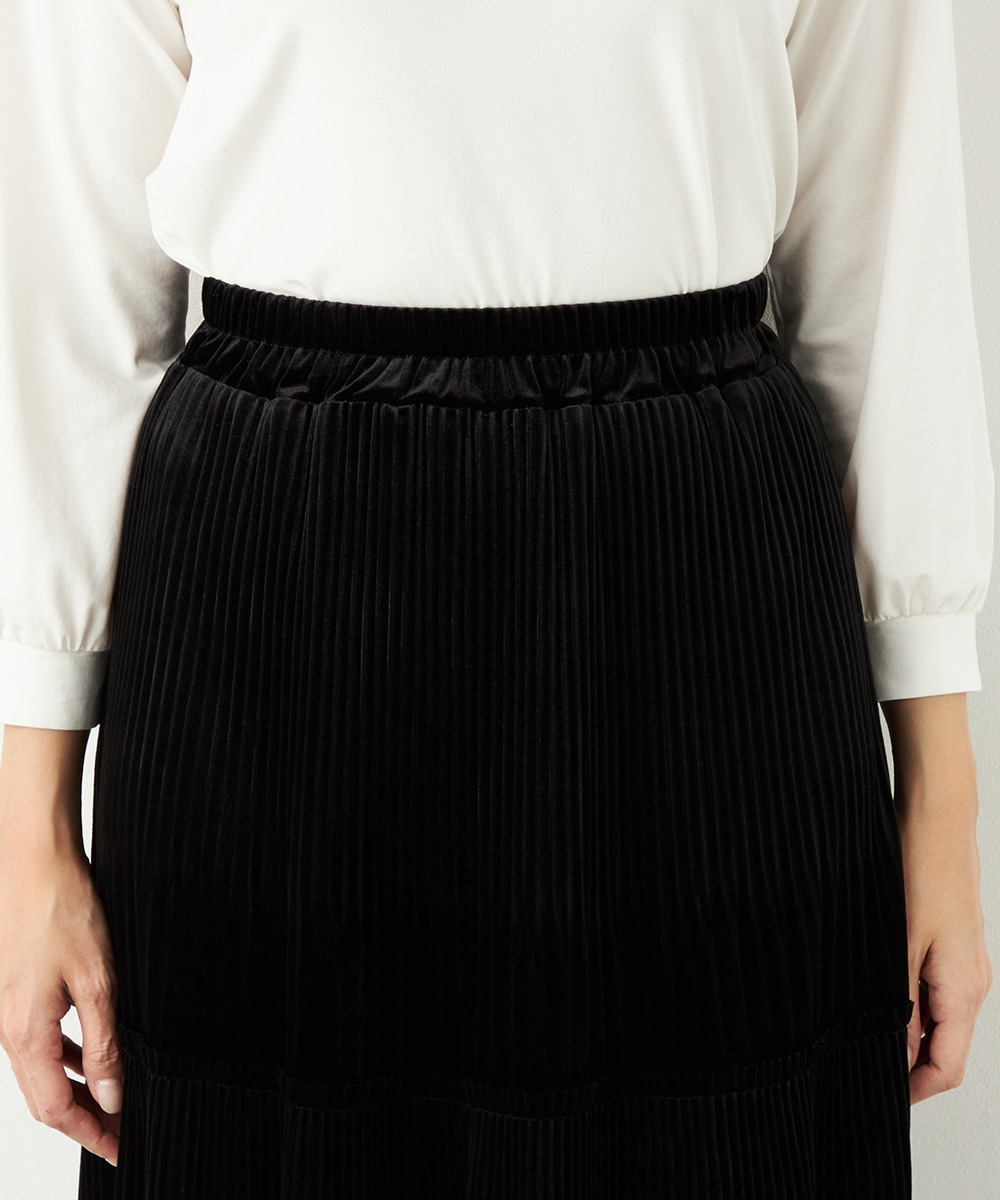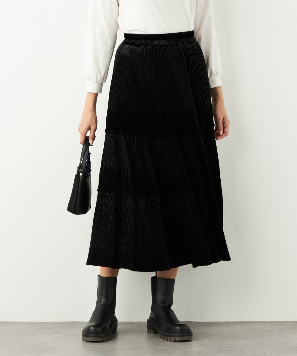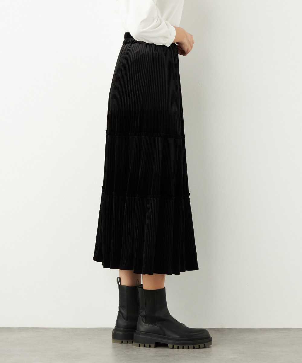 ベーシックカラーの無地ながらも華やかな仕上がりです。ガーリー感あふれるティアードシルエットを採用。細かなプリーツを施してクラシカルな雰囲気もプラスしています。長めの着丈で大人っぽく上品に穿きこなせ、幅広いシーンで重宝する1枚です。ウエストは総ゴム仕様でフィット感良く着用できます。