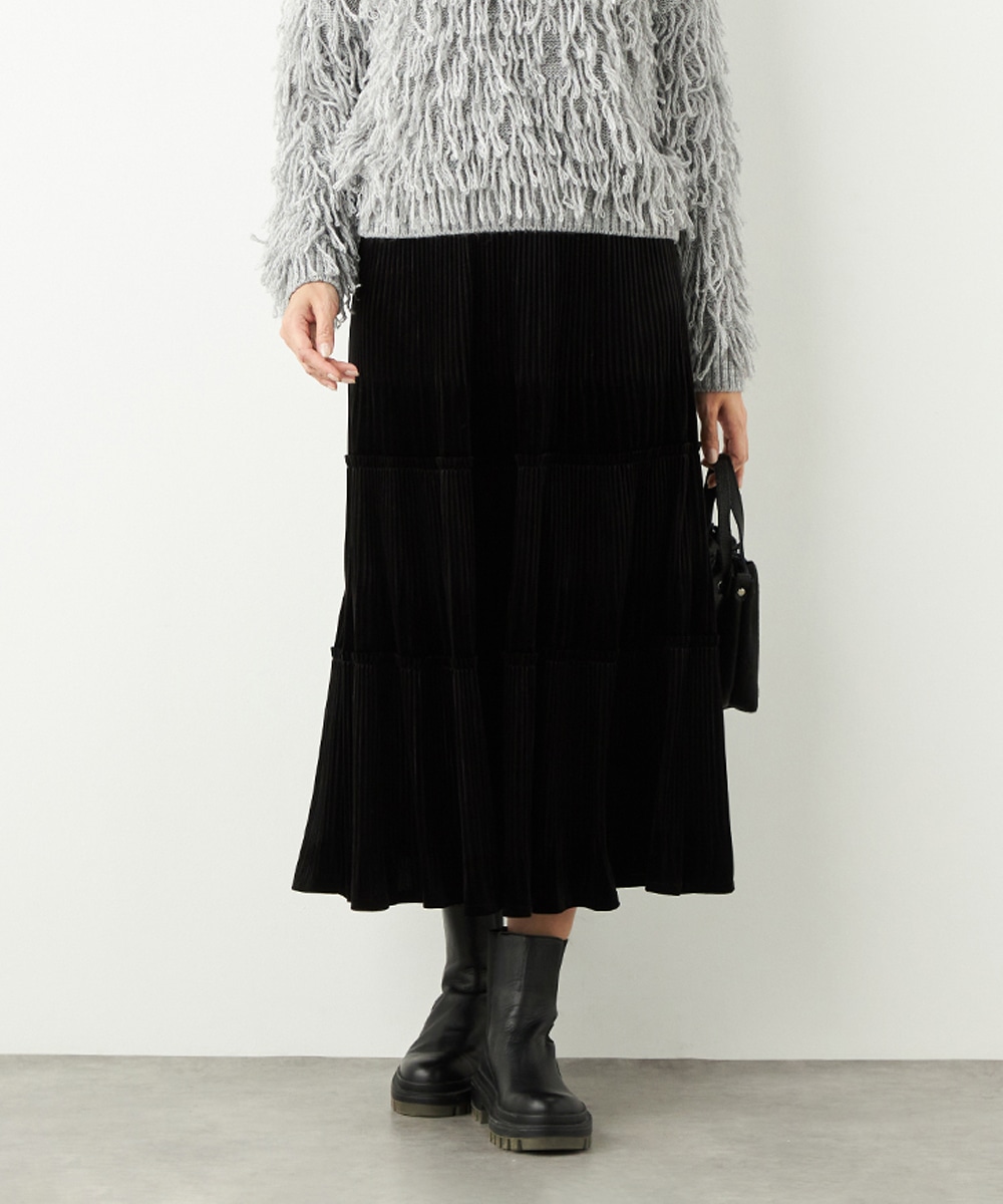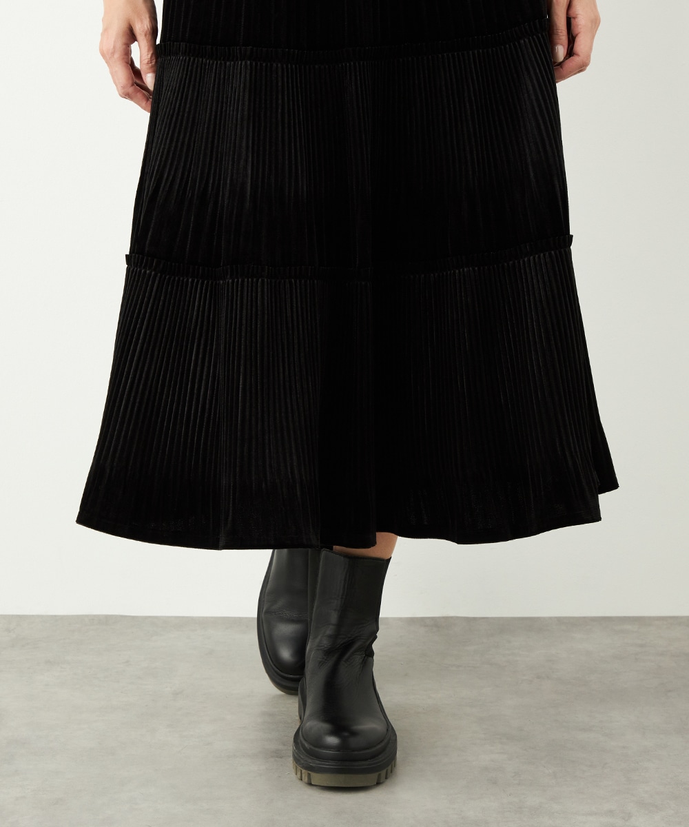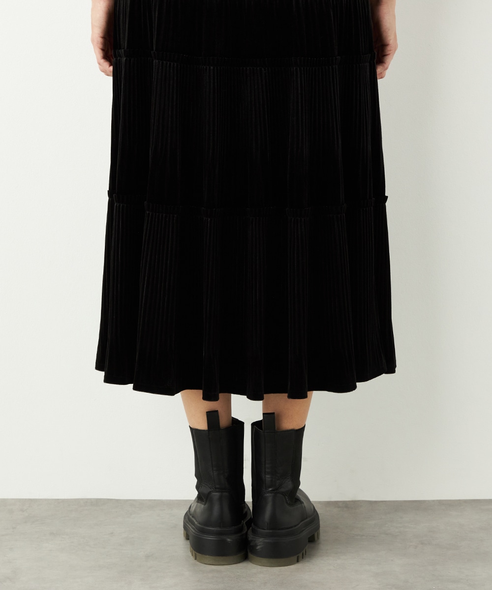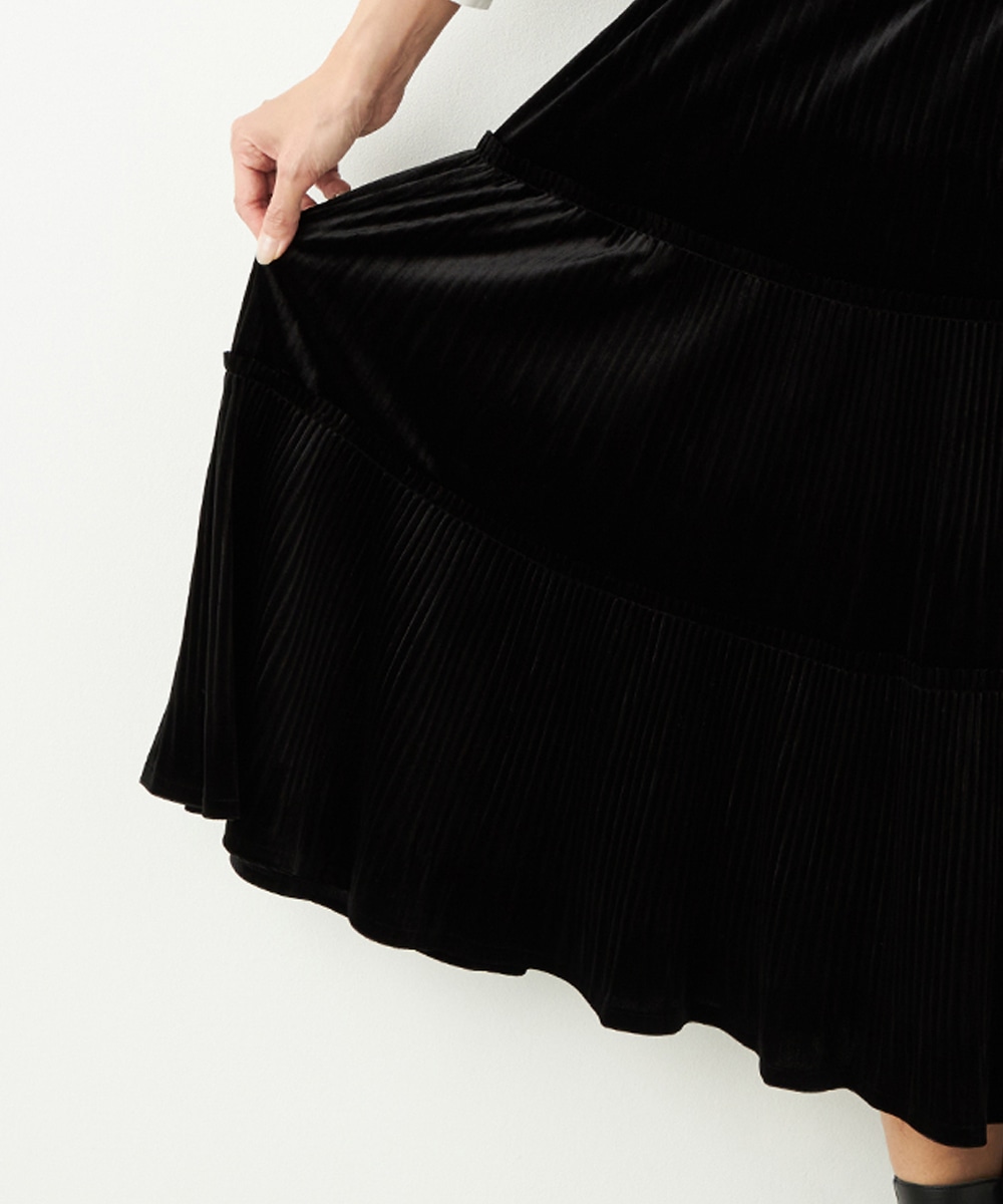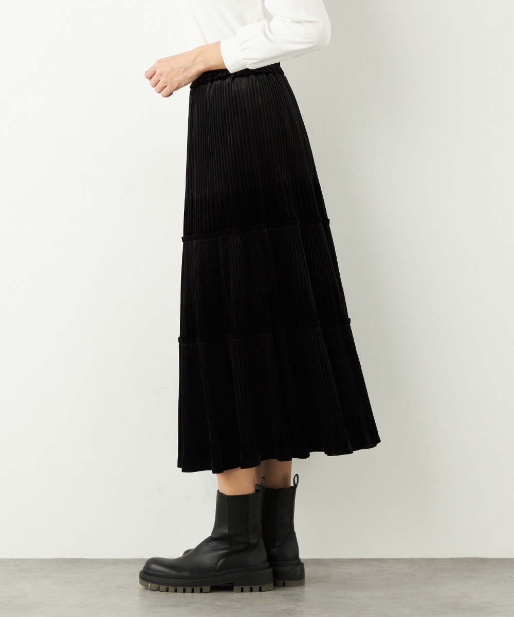 ベーシックカラーの無地ながらも華やかな仕上がりです。ガーリー感あふれるティアードシルエットを採用。細かなプリーツを施してクラシカルな雰囲気もプラスしています。長めの着丈で大人っぽく上品に穿きこなせ、幅広いシーンで重宝する1枚です。ウエストは総ゴム仕様でフィット感良く着用できます。