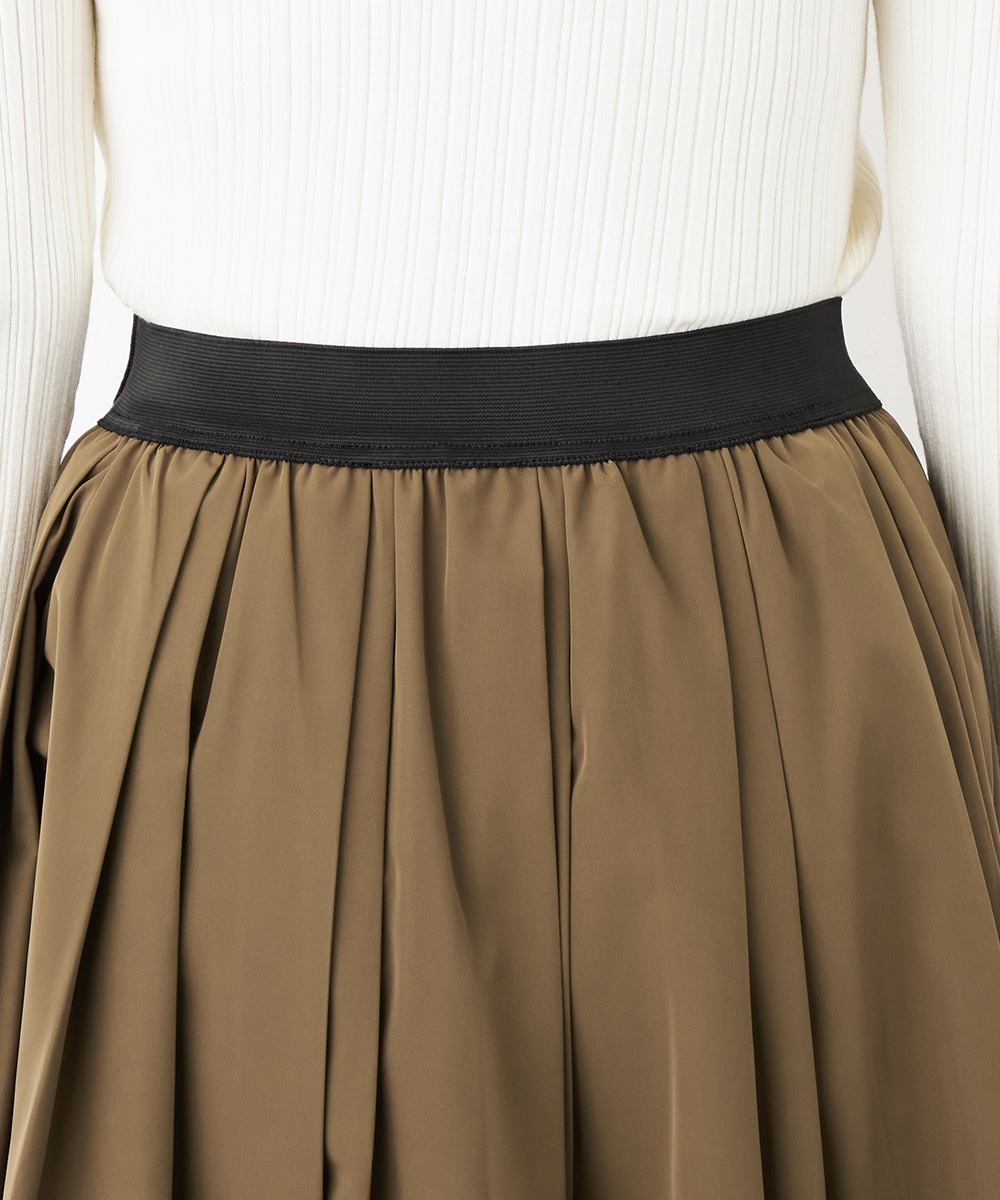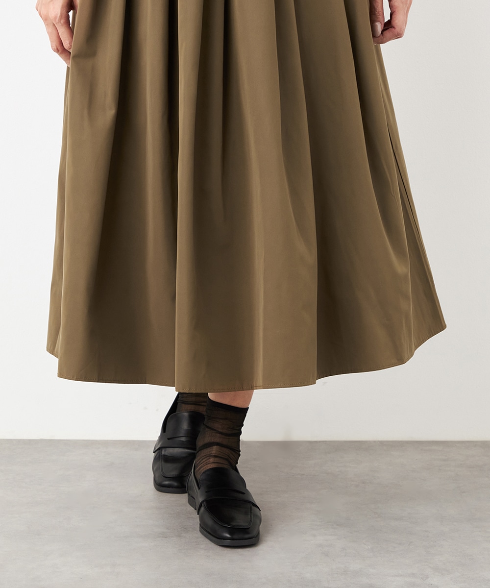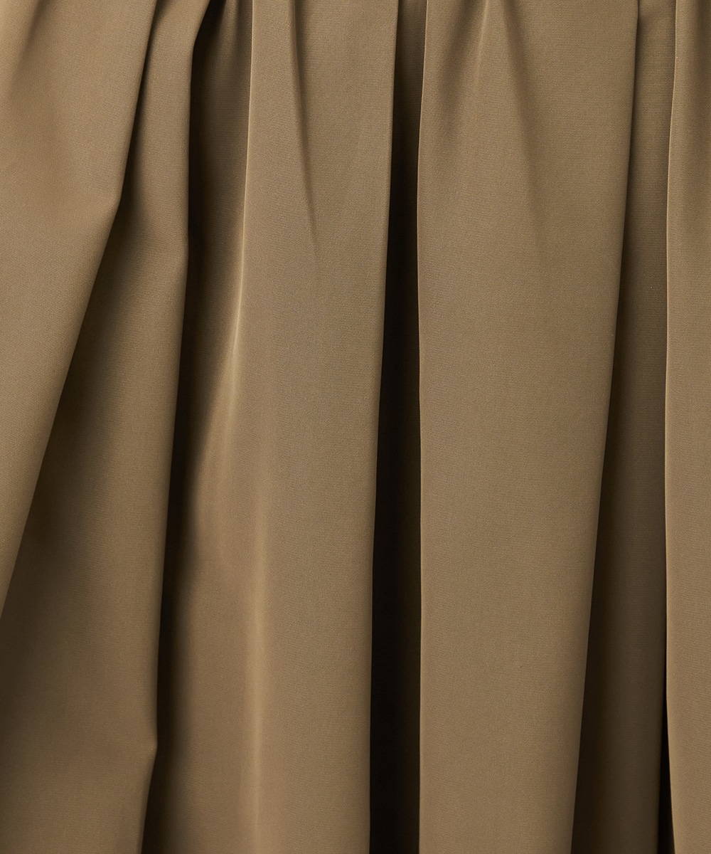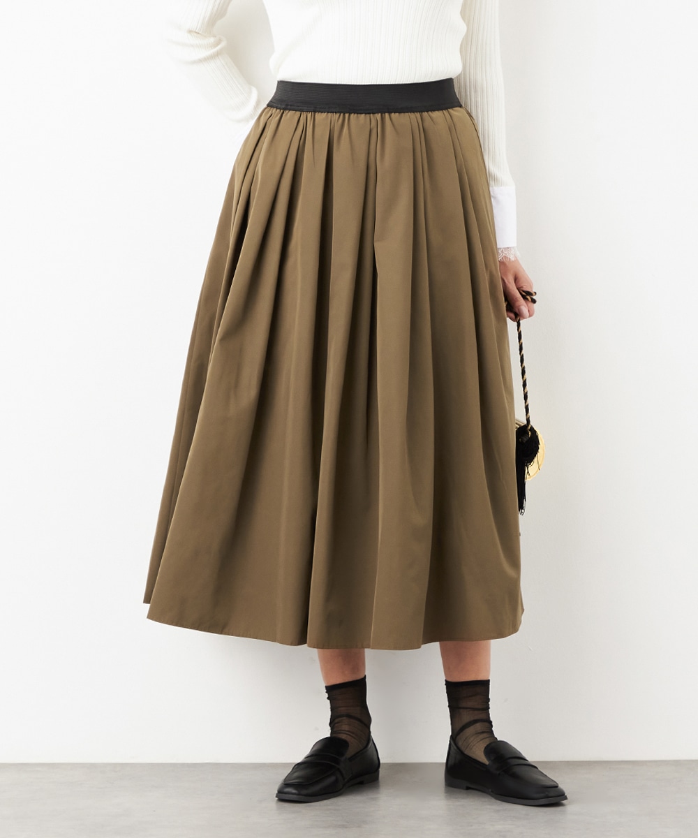 ブラウンがかったカーキカラーが今年らしい1枚。穿きこなしやすい無地のデザインです。タックとギャザーでシルエットにボリュームがありながらも、長すぎない着丈で重く見えないのもポイント。ウエストのゴムバンドはアクセントとしても効いています。快適なフィット感も魅力です。