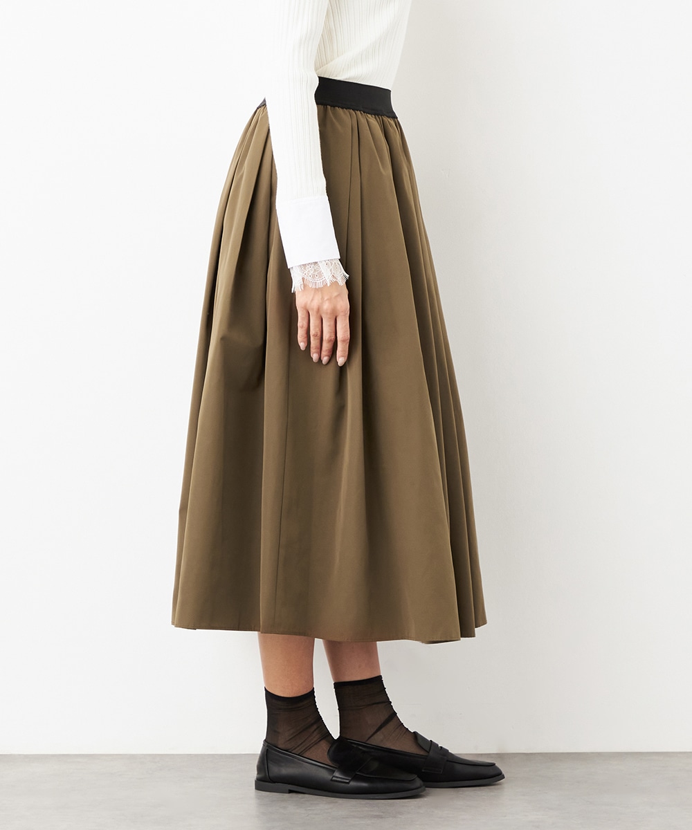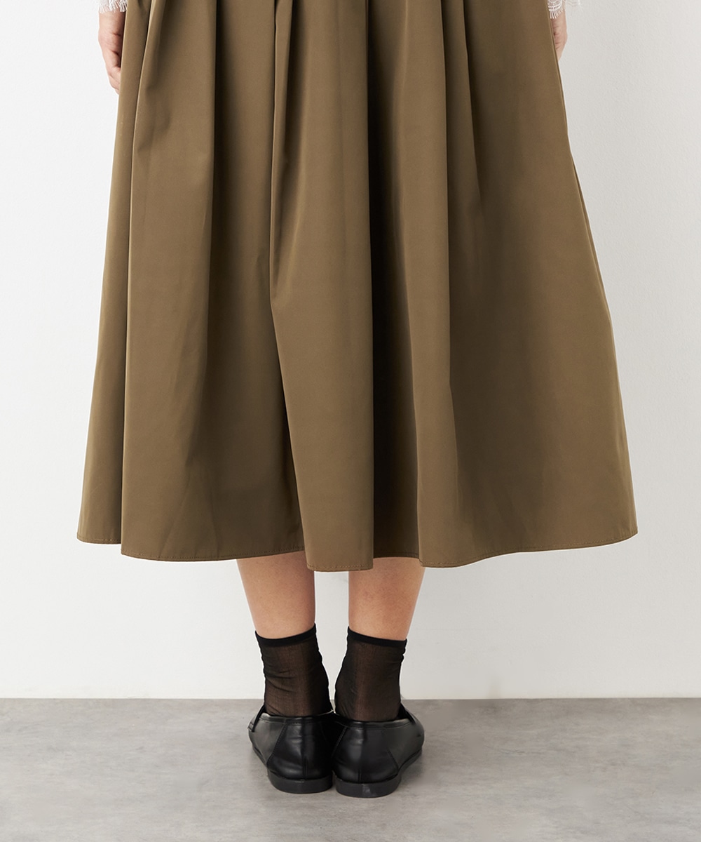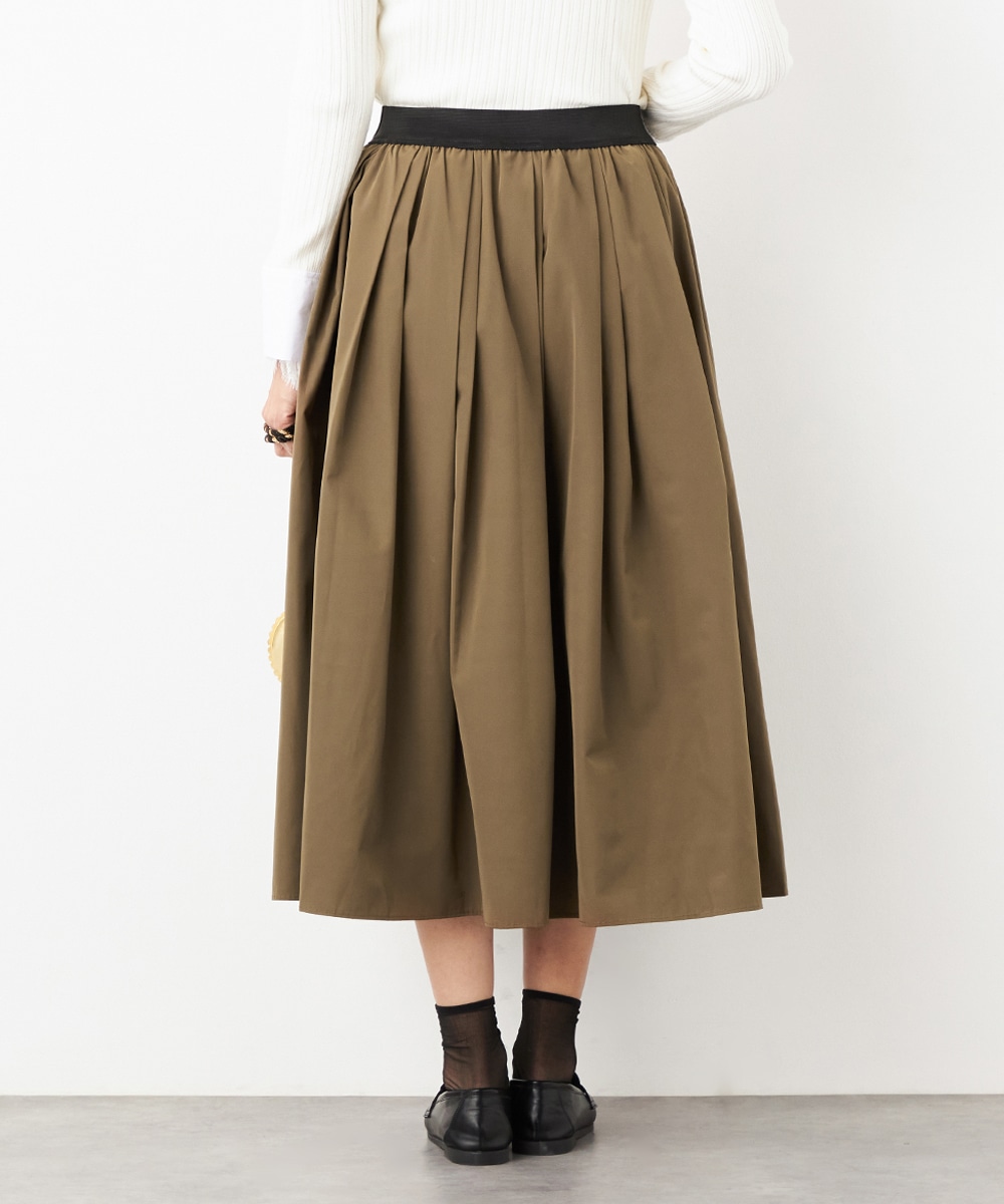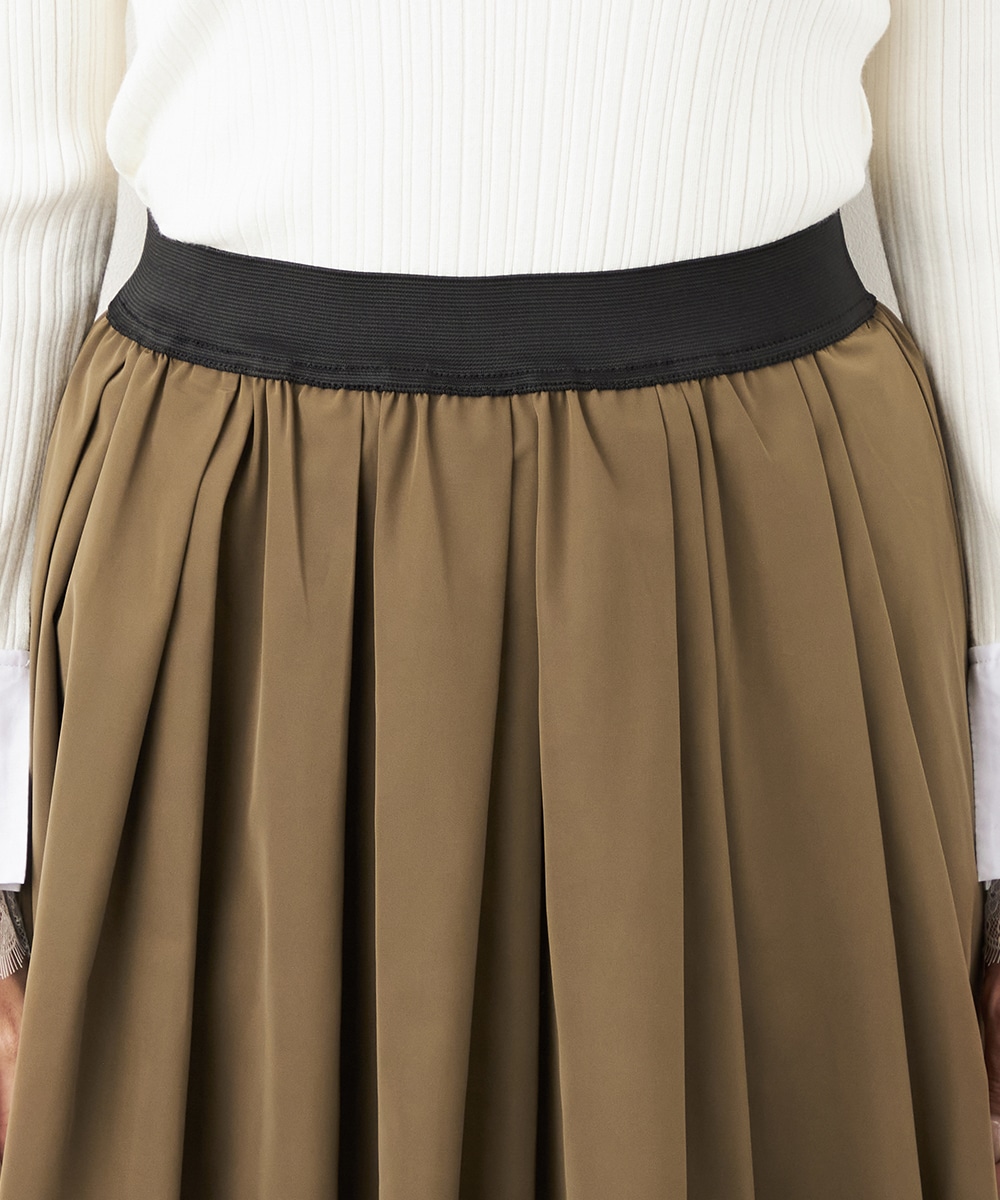 ブラウンがかったカーキカラーが今年らしい1枚。穿きこなしやすい無地のデザインです。タックとギャザーでシルエットにボリュームがありながらも、長すぎない着丈で重く見えないのもポイント。ウエストのゴムバンドはアクセントとしても効いています。快適なフィット感も魅力です。