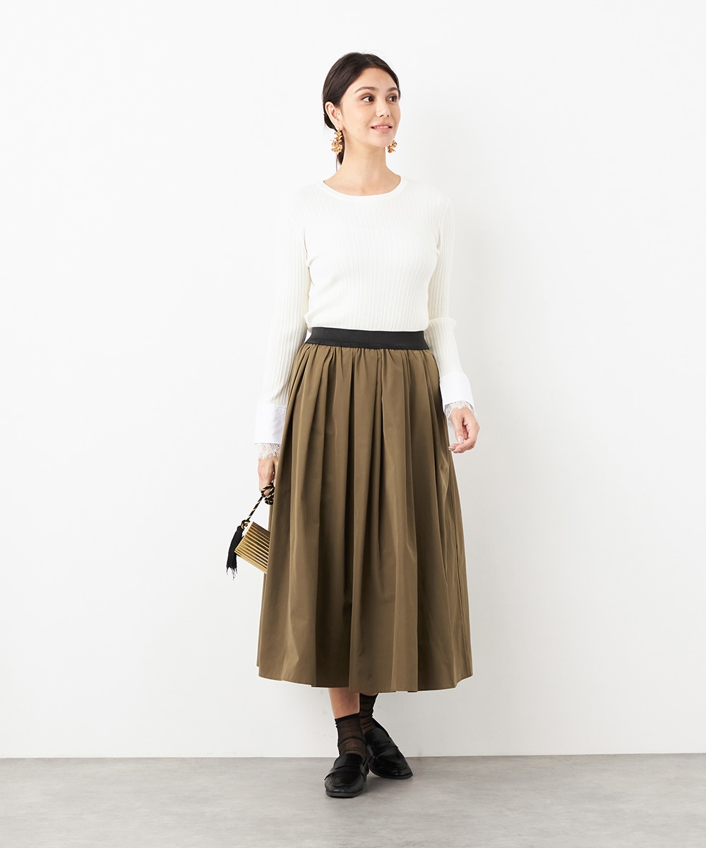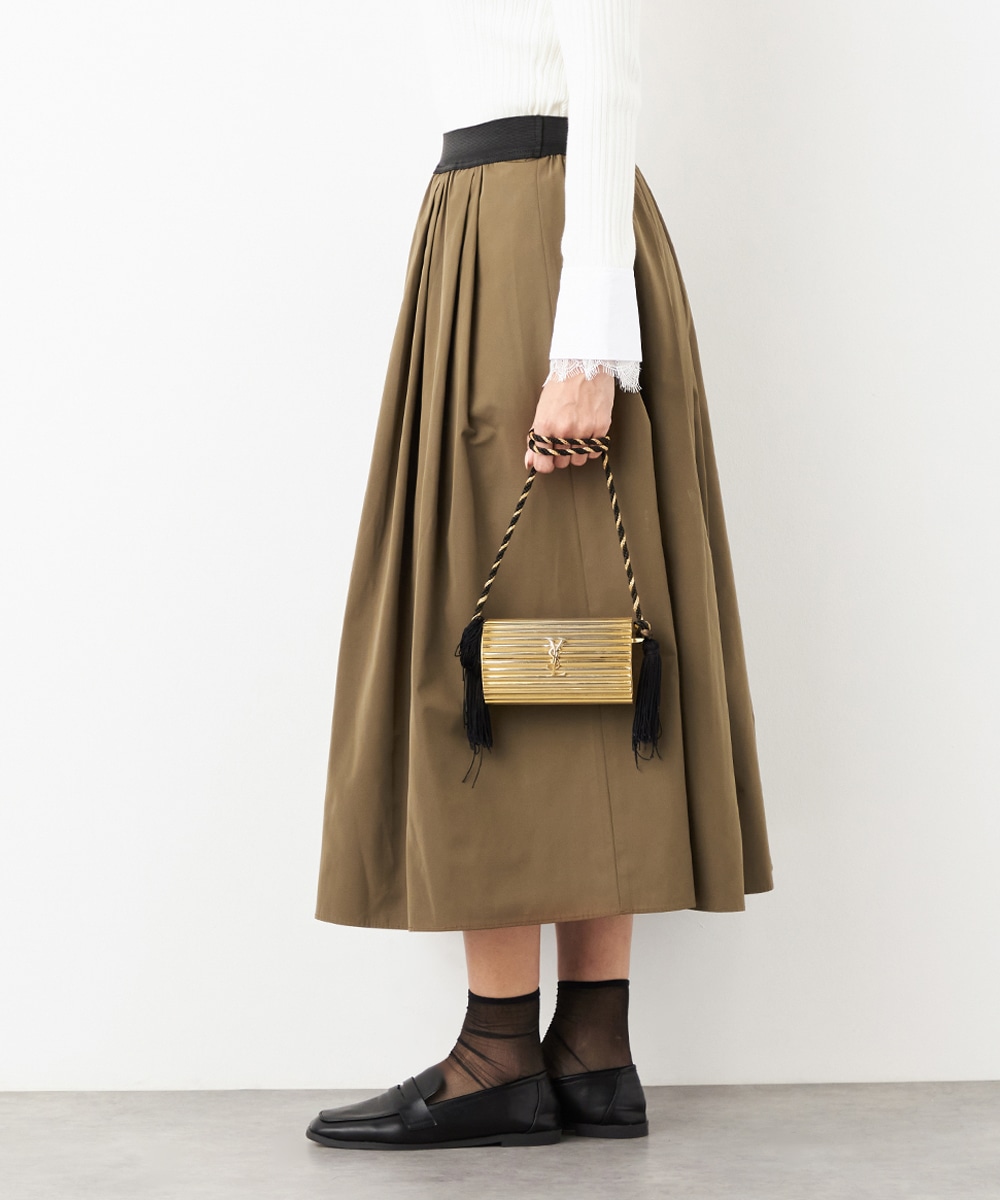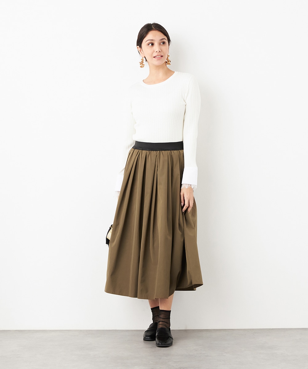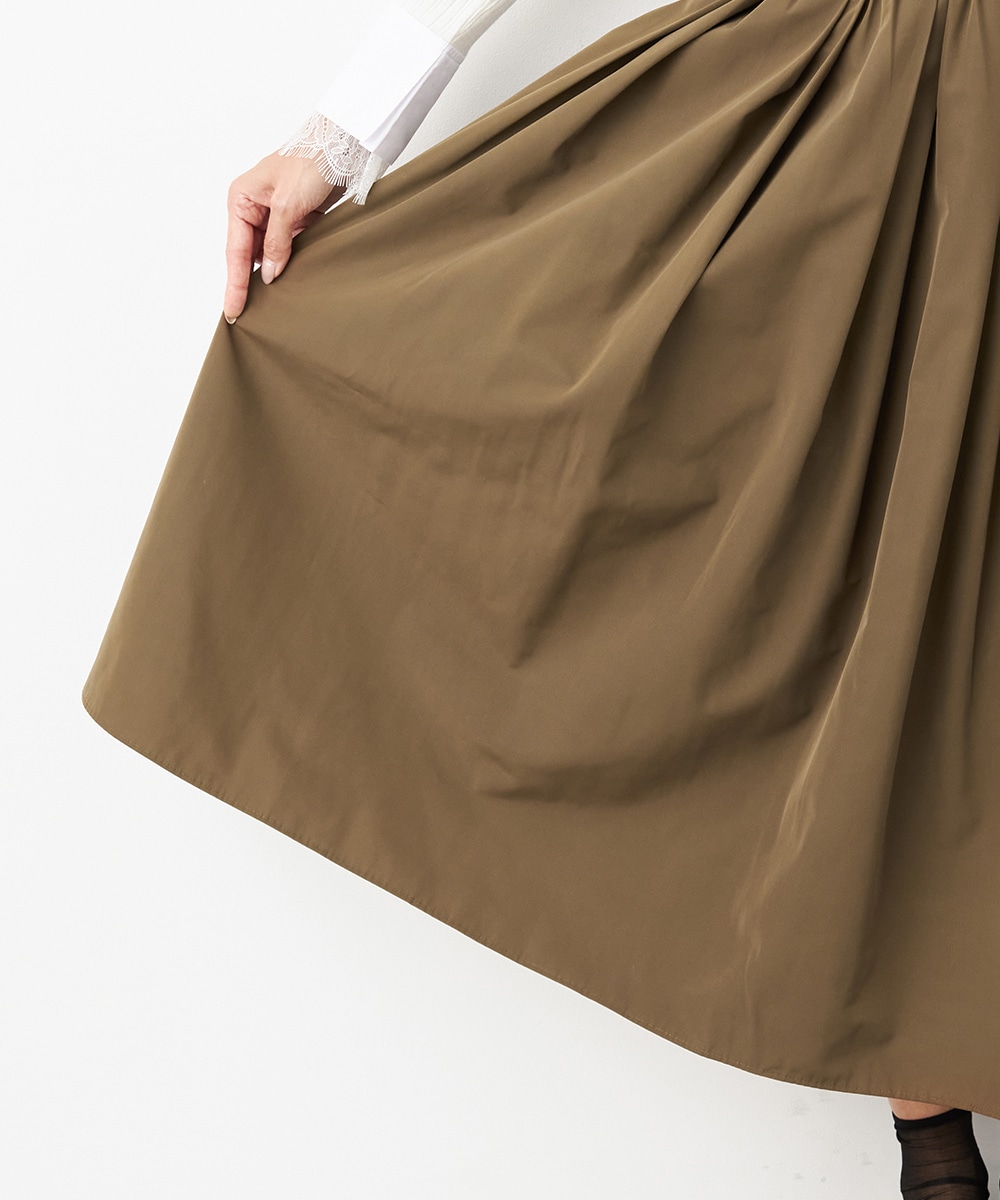 ブラウンがかったカーキカラーが今年らしい1枚。穿きこなしやすい無地のデザインです。タックとギャザーでシルエットにボリュームがありながらも、長すぎない着丈で重く見えないのもポイント。ウエストのゴムバンドはアクセントとしても効いています。快適なフィット感も魅力です。