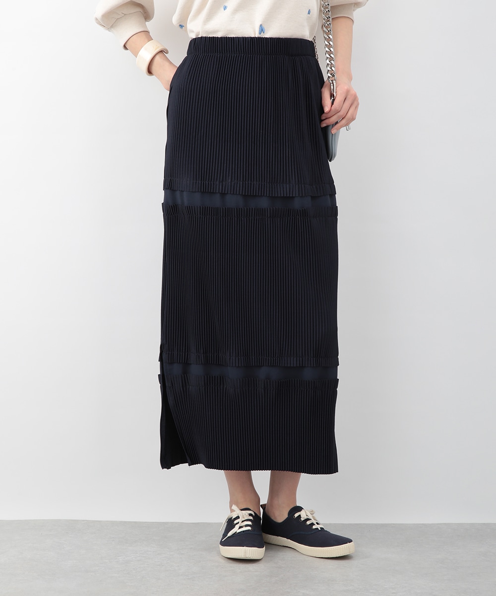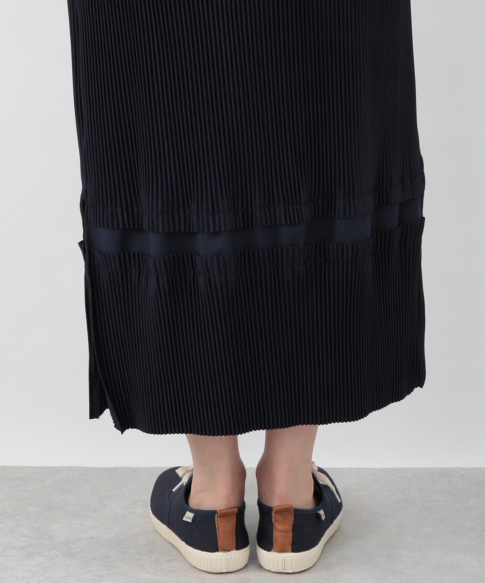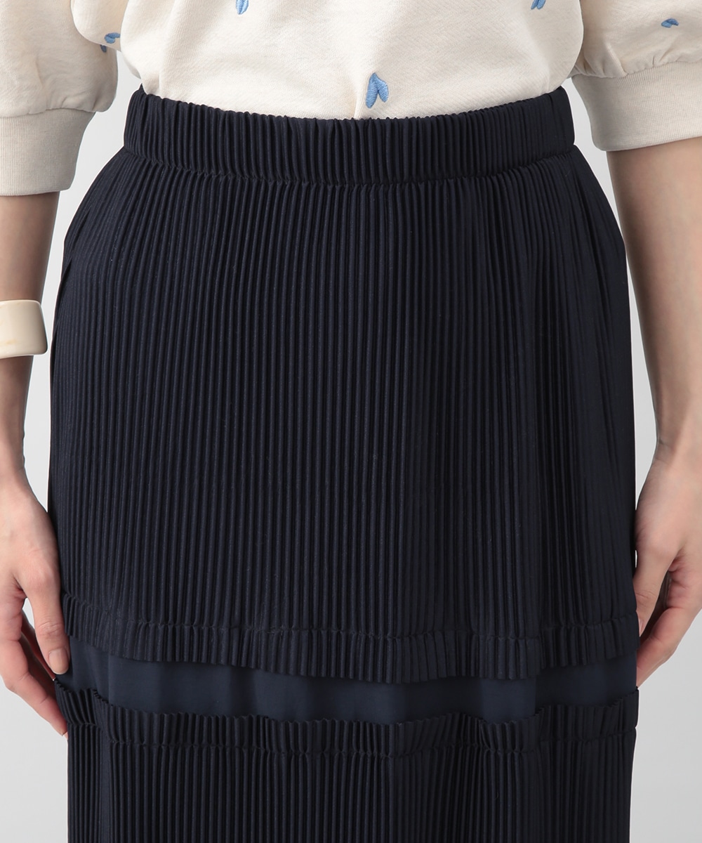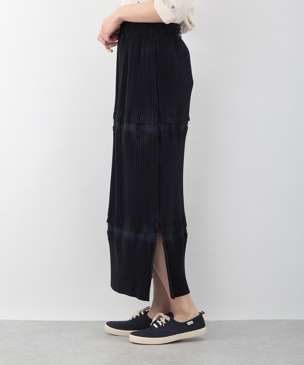 プリーツ加工を施したジャージ素材のタイトスカート。ティアード切り替えが程よい立体感を生み、動くたびに軽やかな表情を演出します。細身のシルエットで縦のラインを強調し、すっきりとした印象に。コンパクトなトップスを合わせてバランス良く、ブラウスを合わせてきれいめにも穿きやすい一枚です。