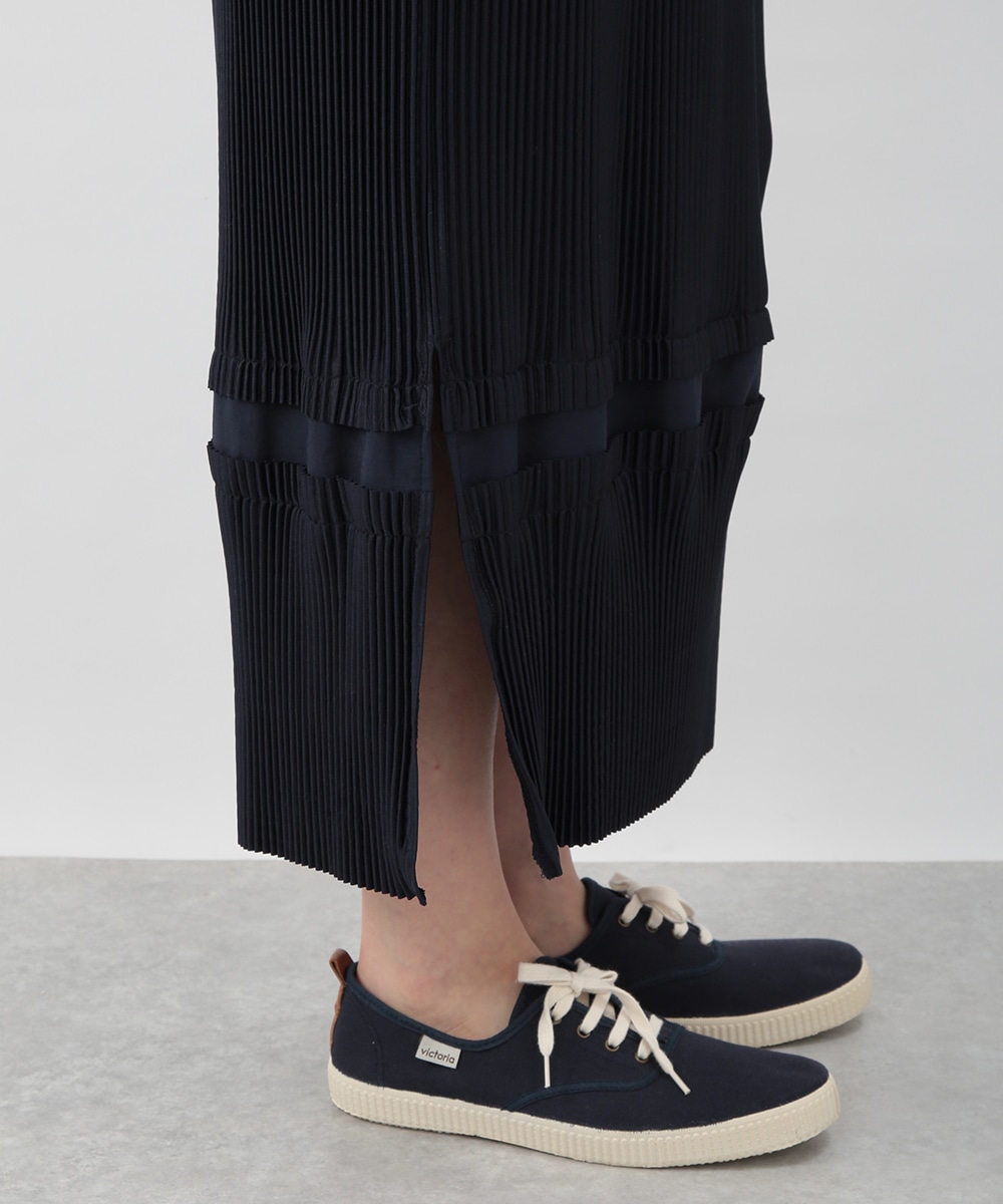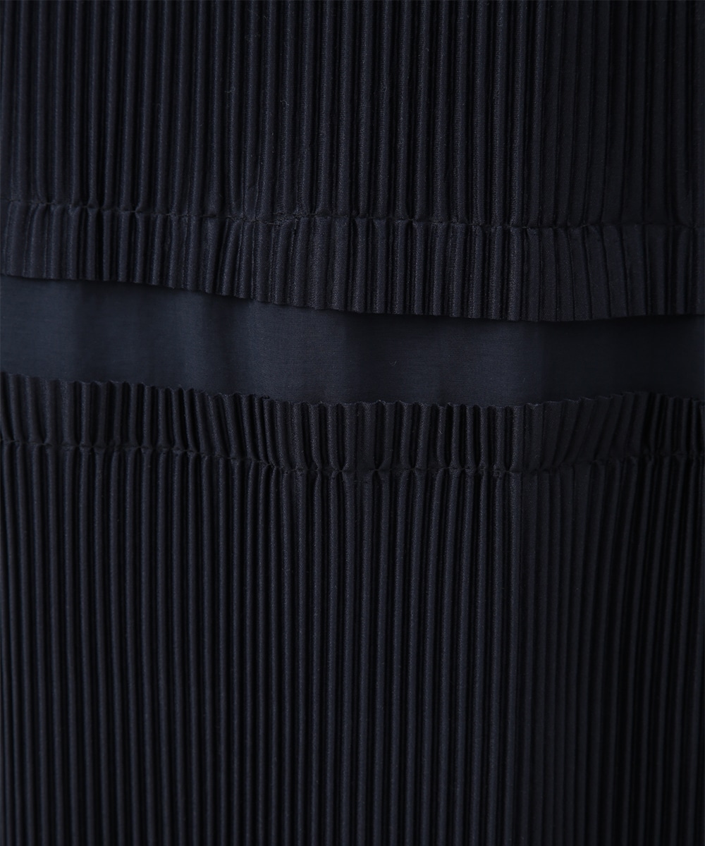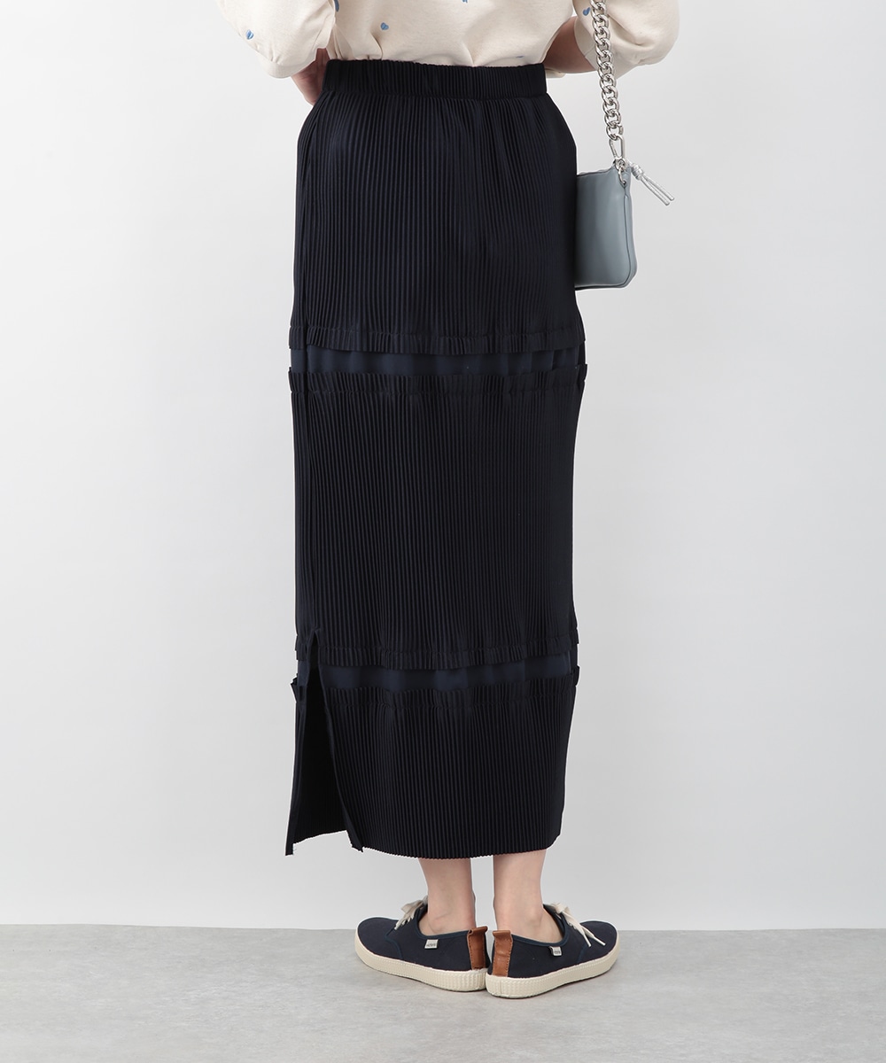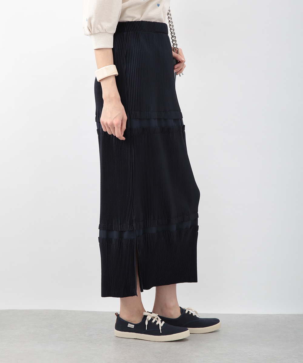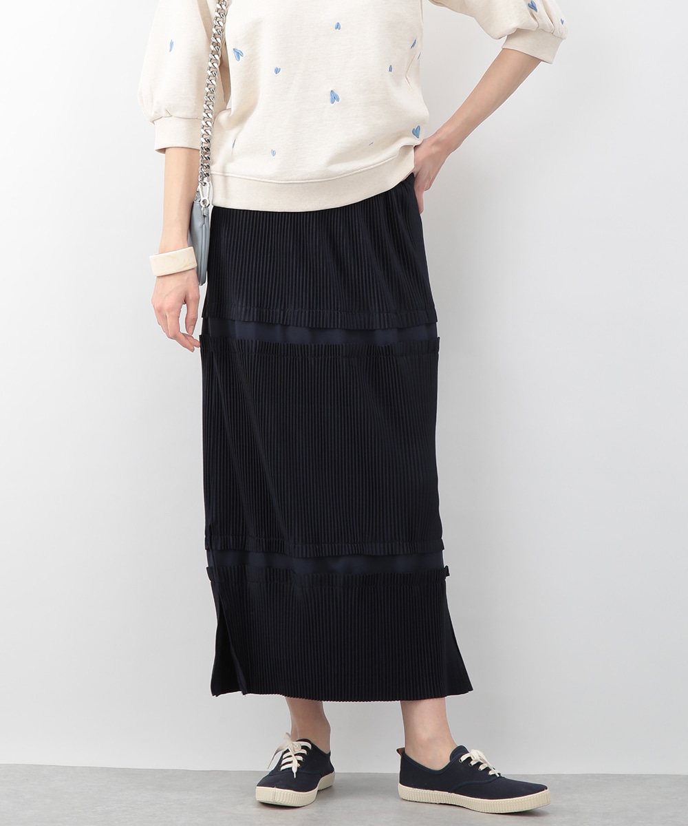 プリーツ加工を施したジャージ素材のタイトスカート。ティアード切り替えが程よい立体感を生み、動くたびに軽やかな表情を演出します。細身のシルエットで縦のラインを強調し、すっきりとした印象に。コンパクトなトップスを合わせてバランス良く、ブラウスを合わせてきれいめにも穿きやすい一枚です。