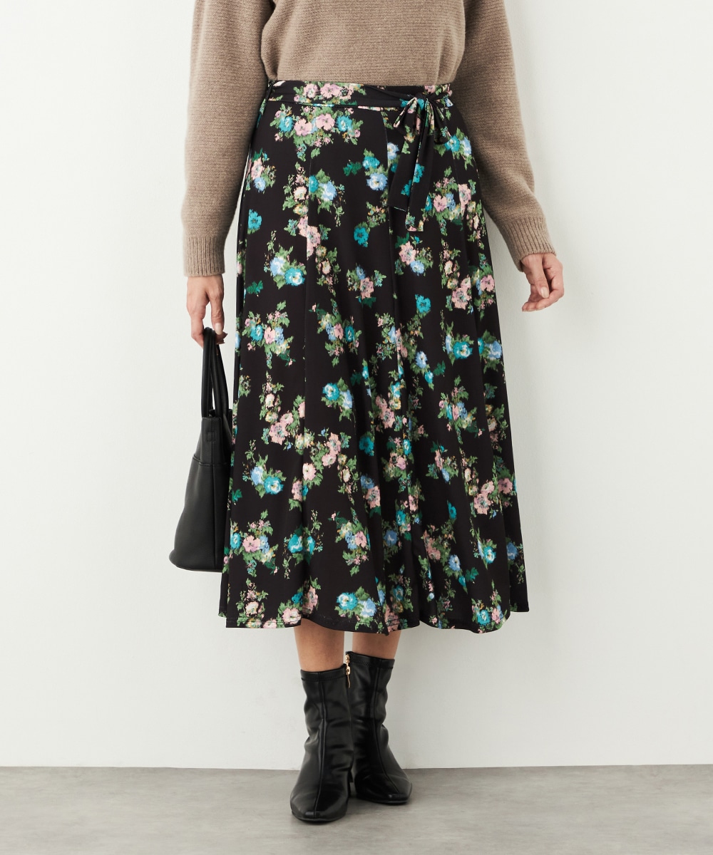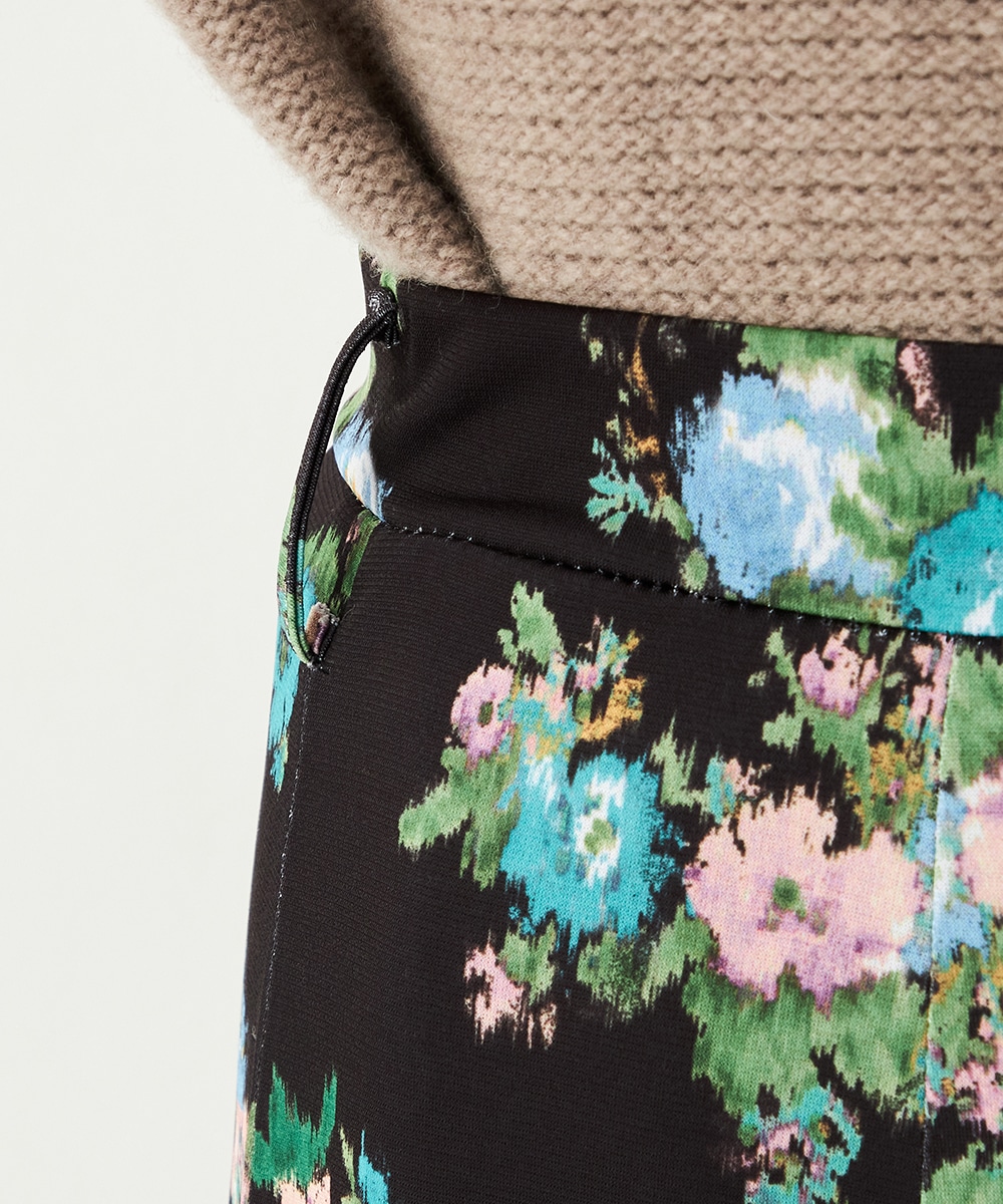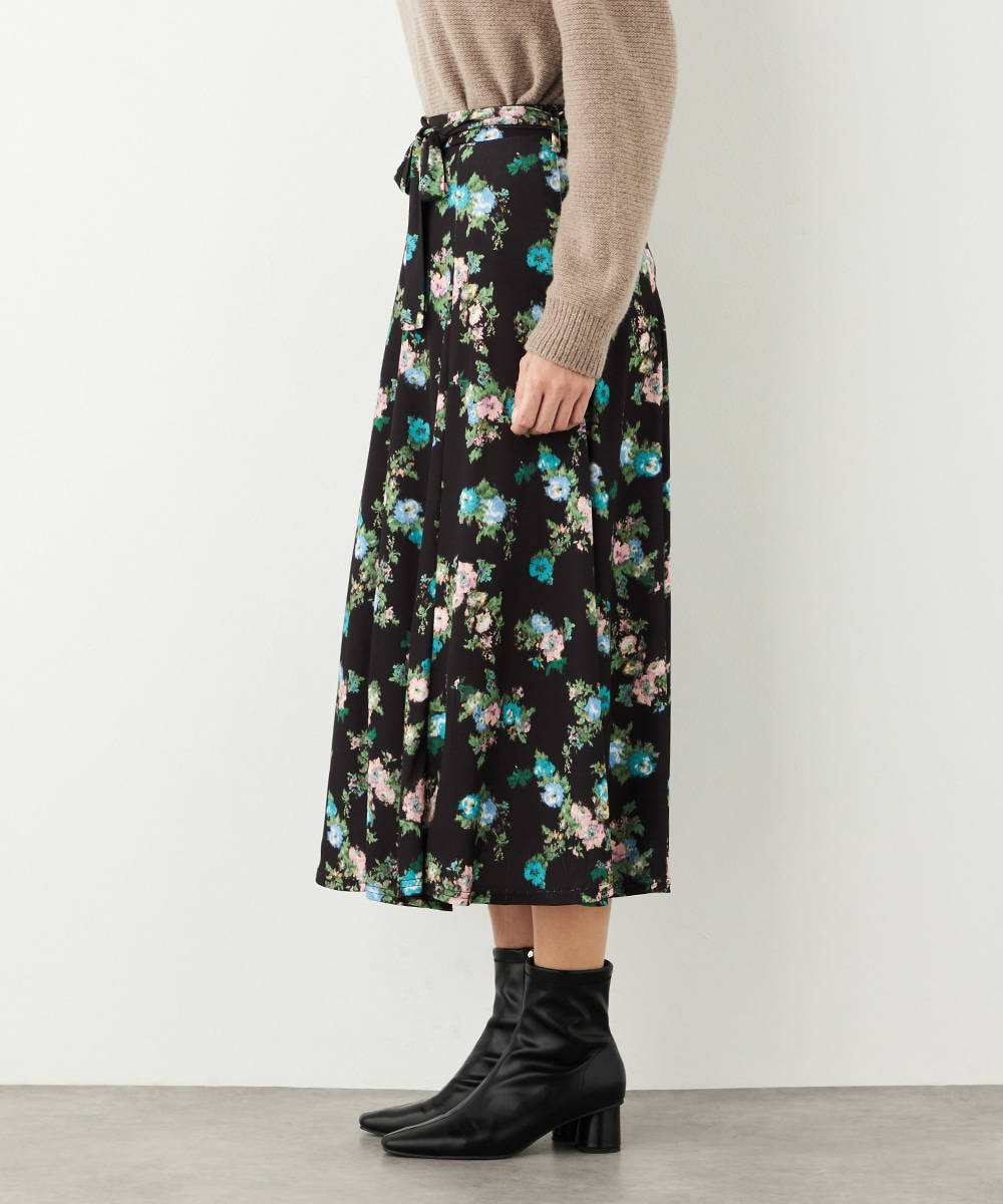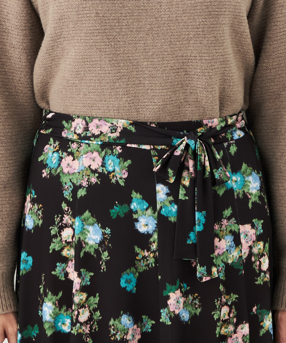 大人っぽく上品に穿きこなせる長めの着丈です。シルエットには適度なフレア感があります。にじんだような繊細なタッチもデザインのポイント。しなやかな風合いの生地を使用しており、ドレープや揺れ感がエレガントな印象です。同素材のリボンベルトが付属して、ウエストマークのアレンジも楽しめます。