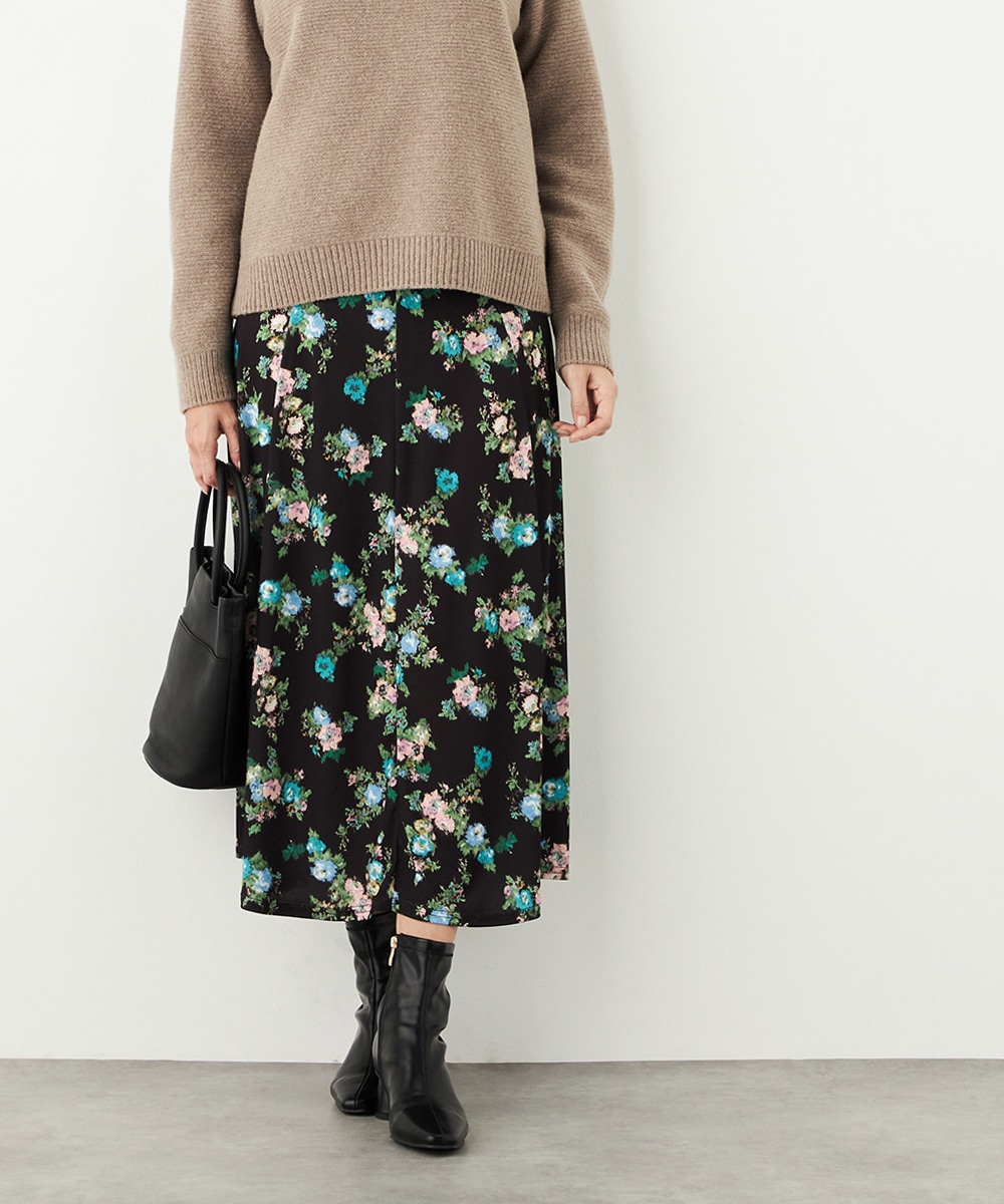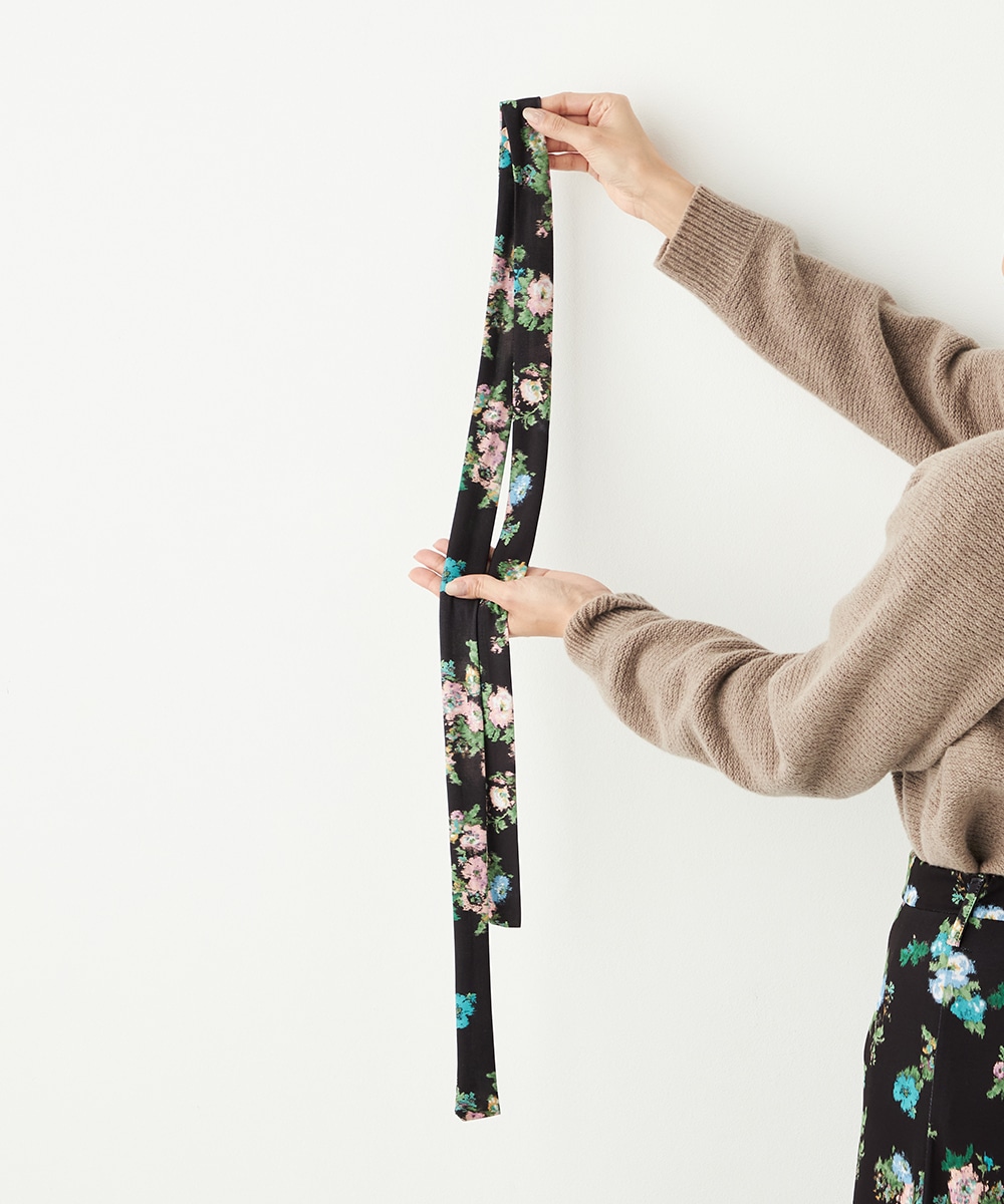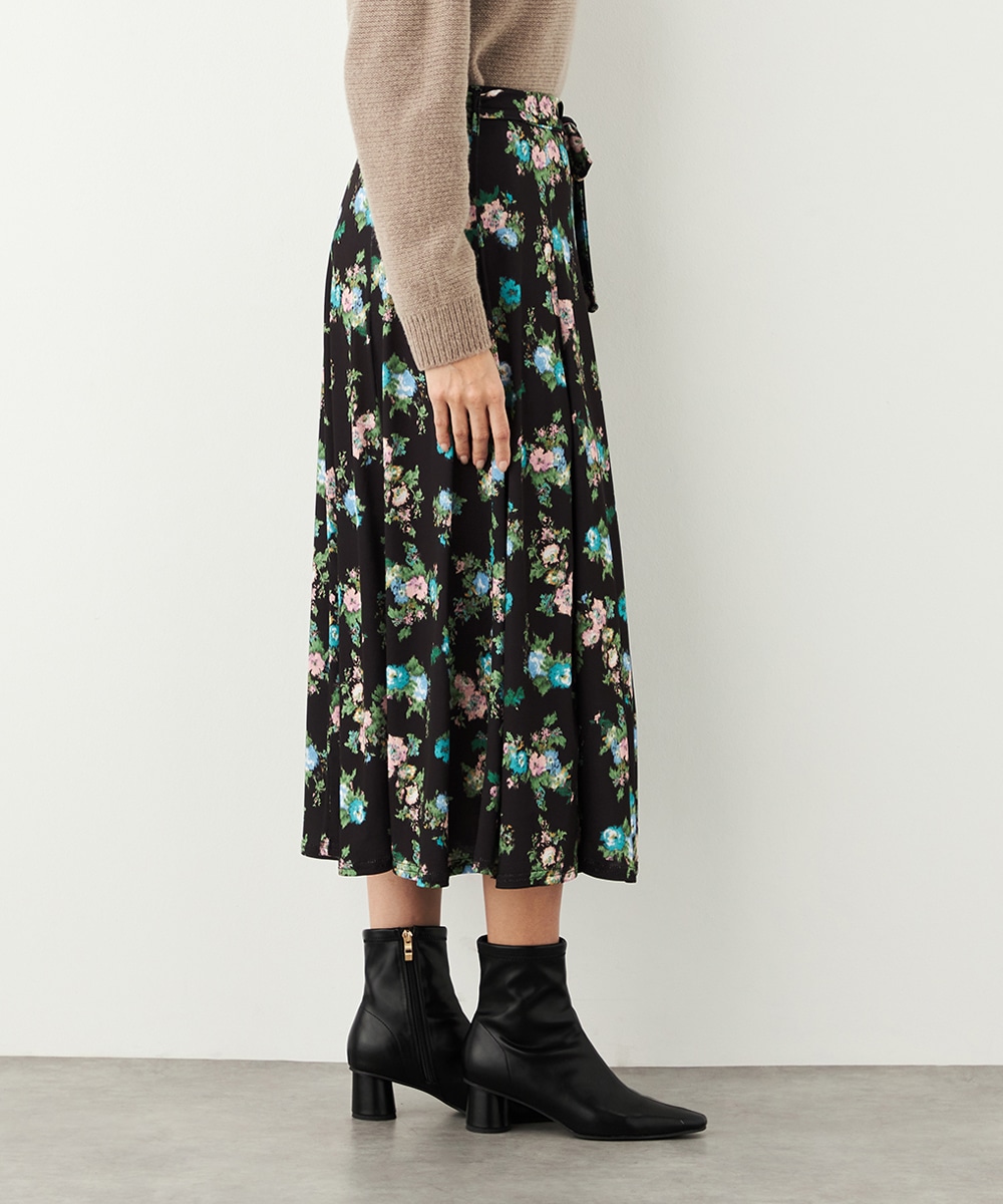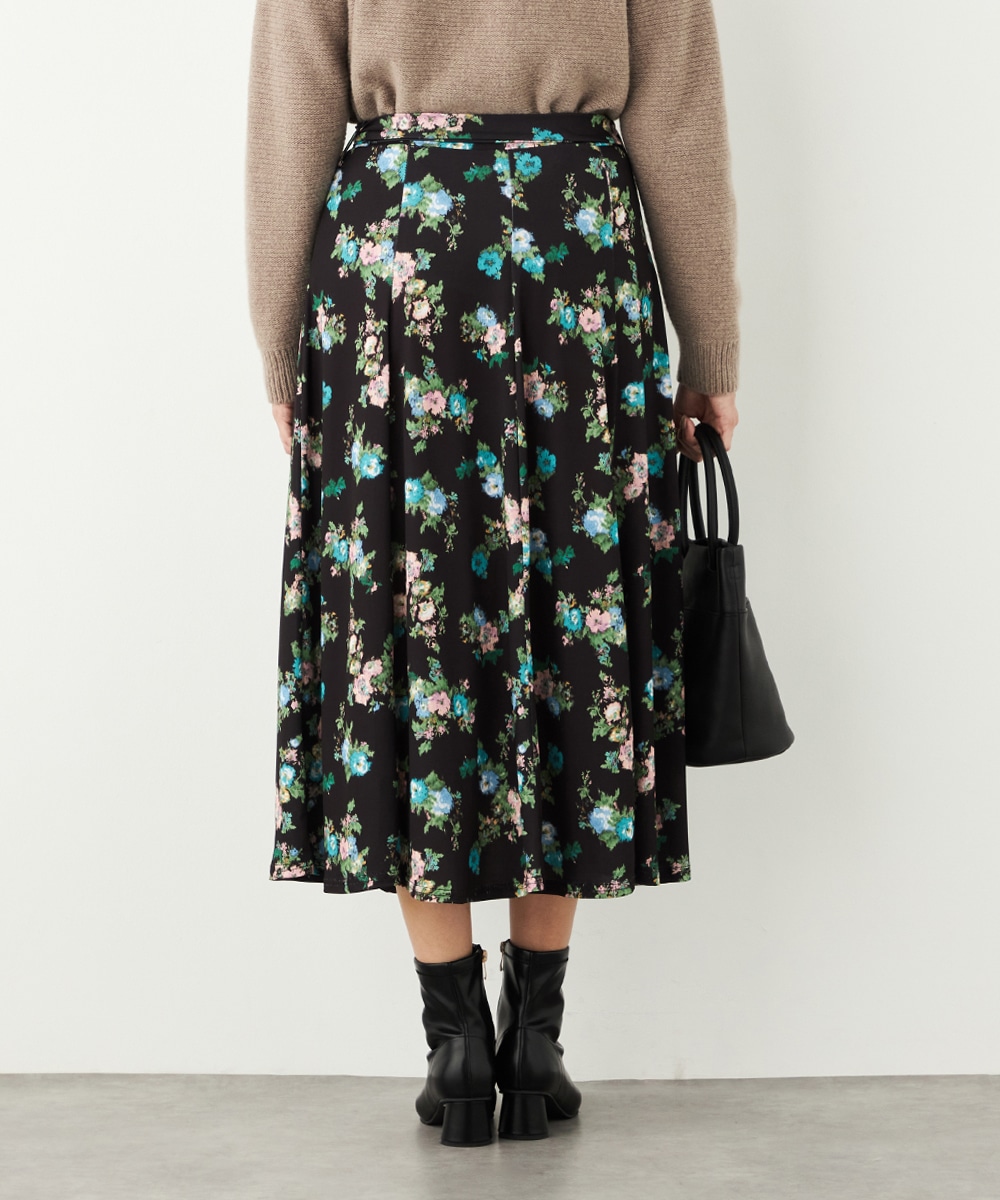 大人っぽく上品に穿きこなせる長めの着丈です。シルエットには適度なフレア感があります。にじんだような繊細なタッチもデザインのポイント。しなやかな風合いの生地を使用しており、ドレープや揺れ感がエレガントな印象です。同素材のリボンベルトが付属して、ウエストマークのアレンジも楽しめます。
