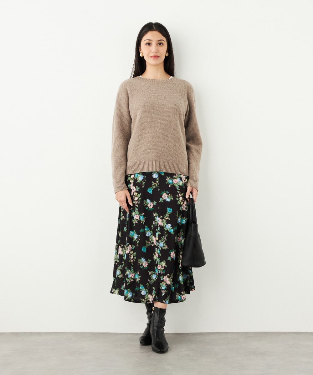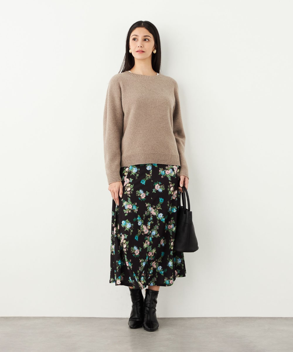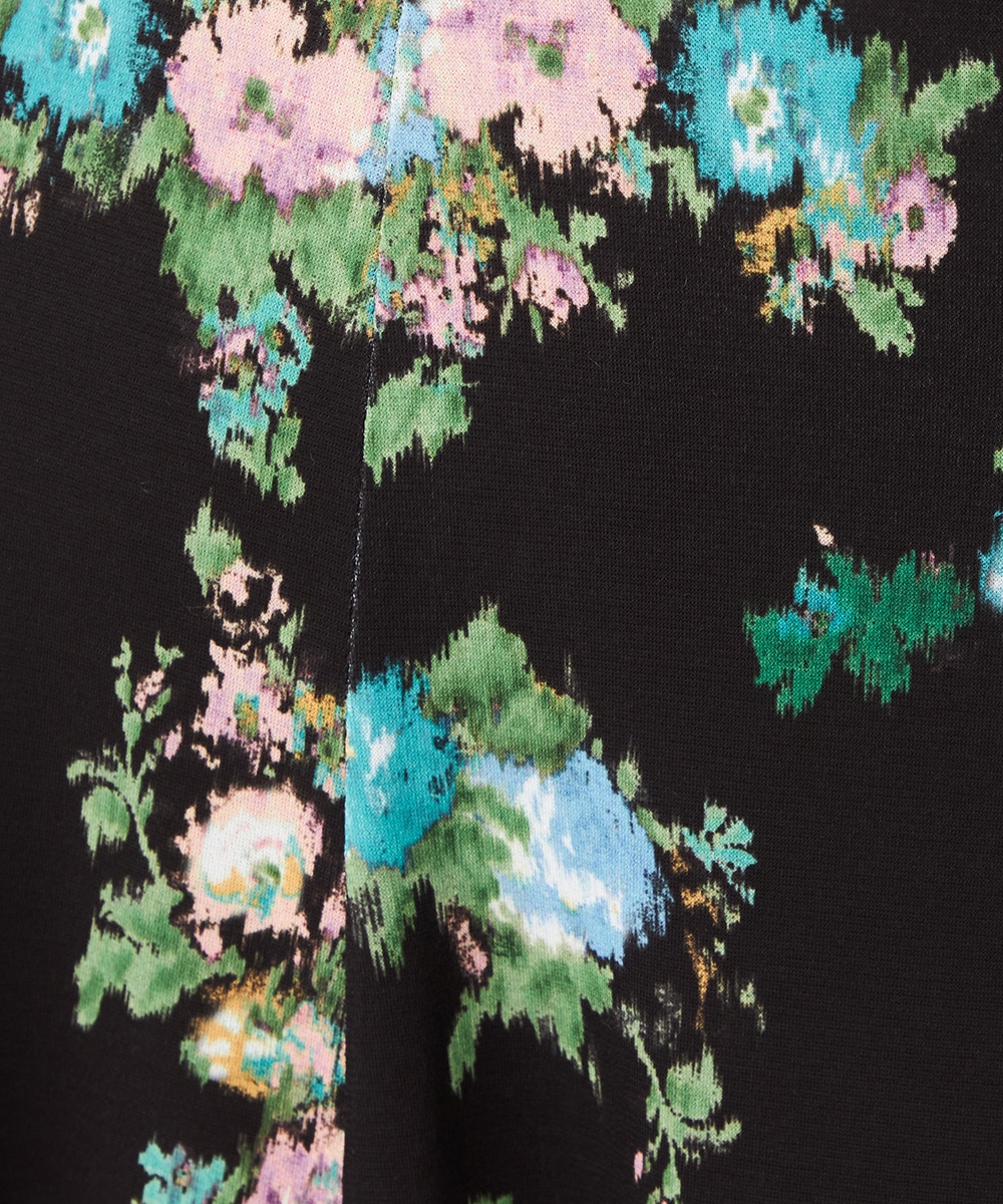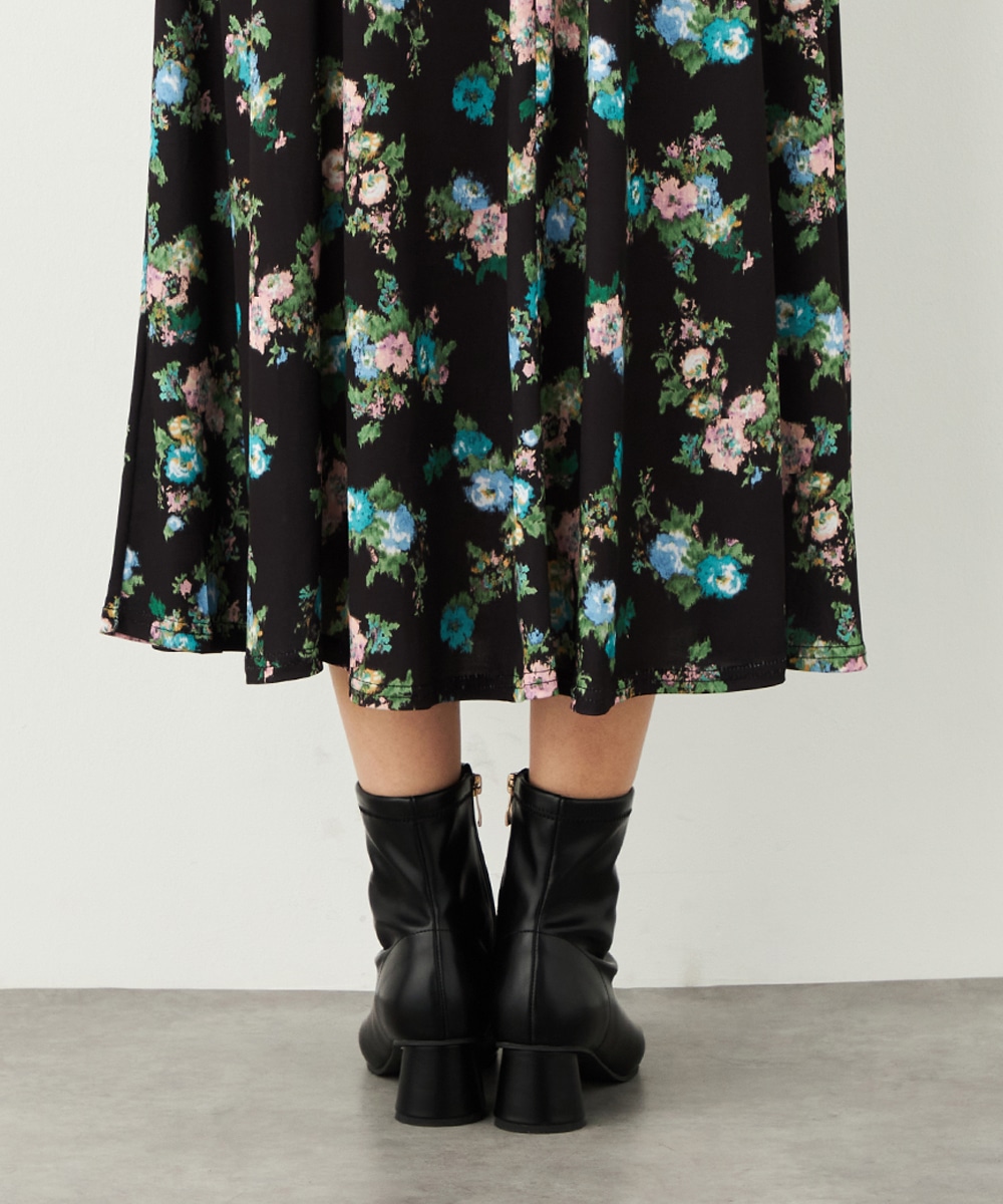 大人っぽく上品に穿きこなせる長めの着丈です。シルエットには適度なフレア感があります。にじんだような繊細なタッチもデザインのポイント。しなやかな風合いの生地を使用しており、ドレープや揺れ感がエレガントな印象です。同素材のリボンベルトが付属して、ウエストマークのアレンジも楽しめます。