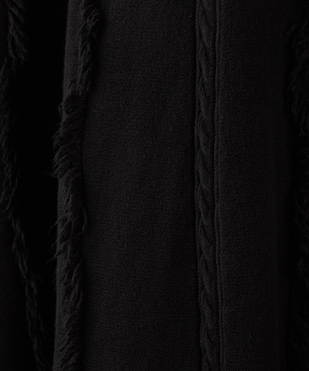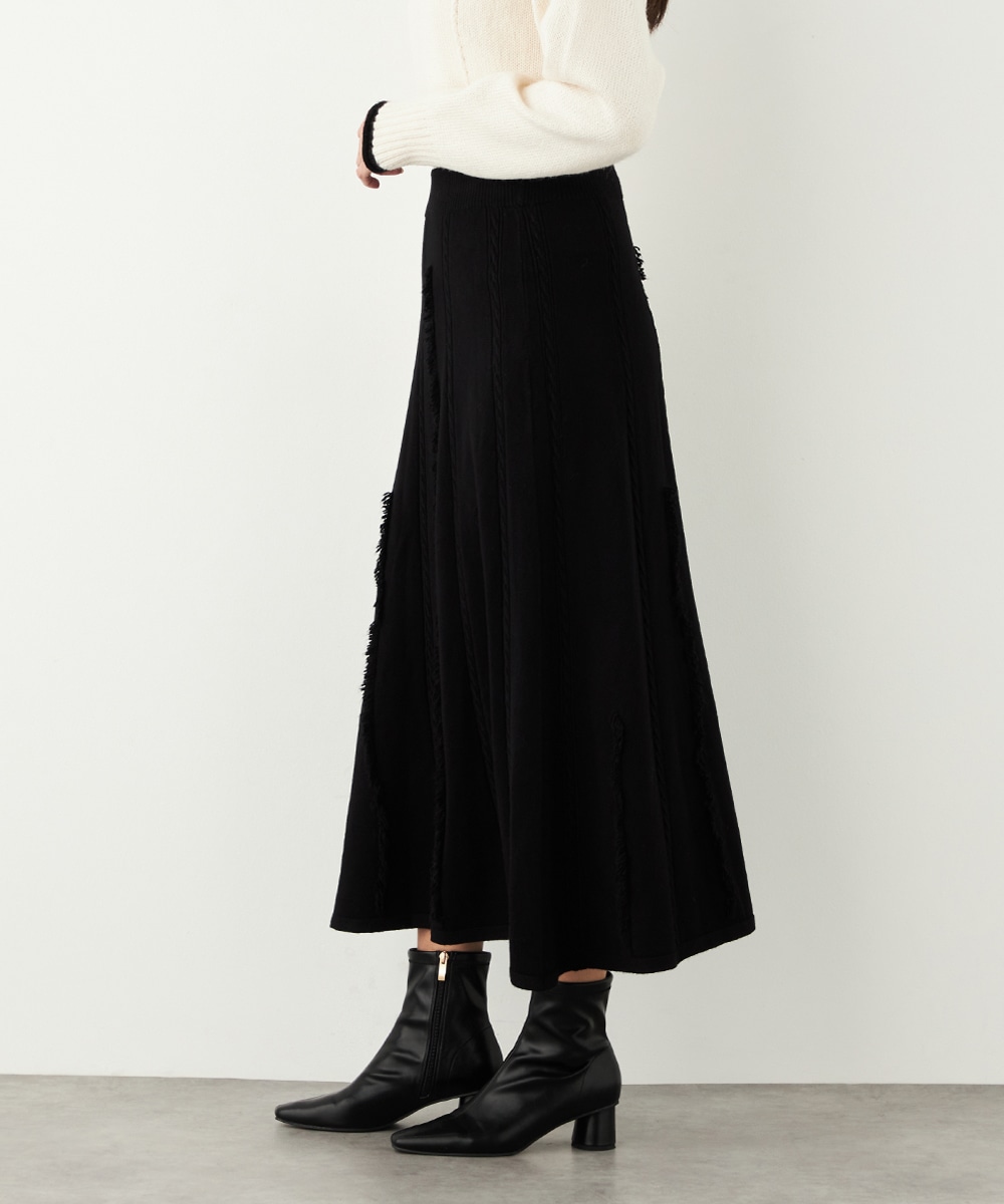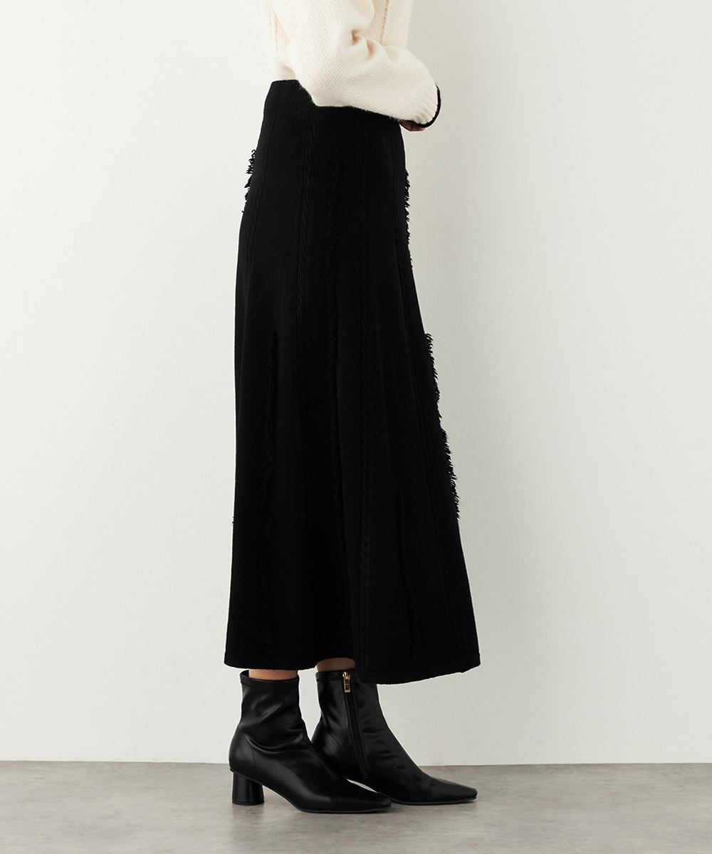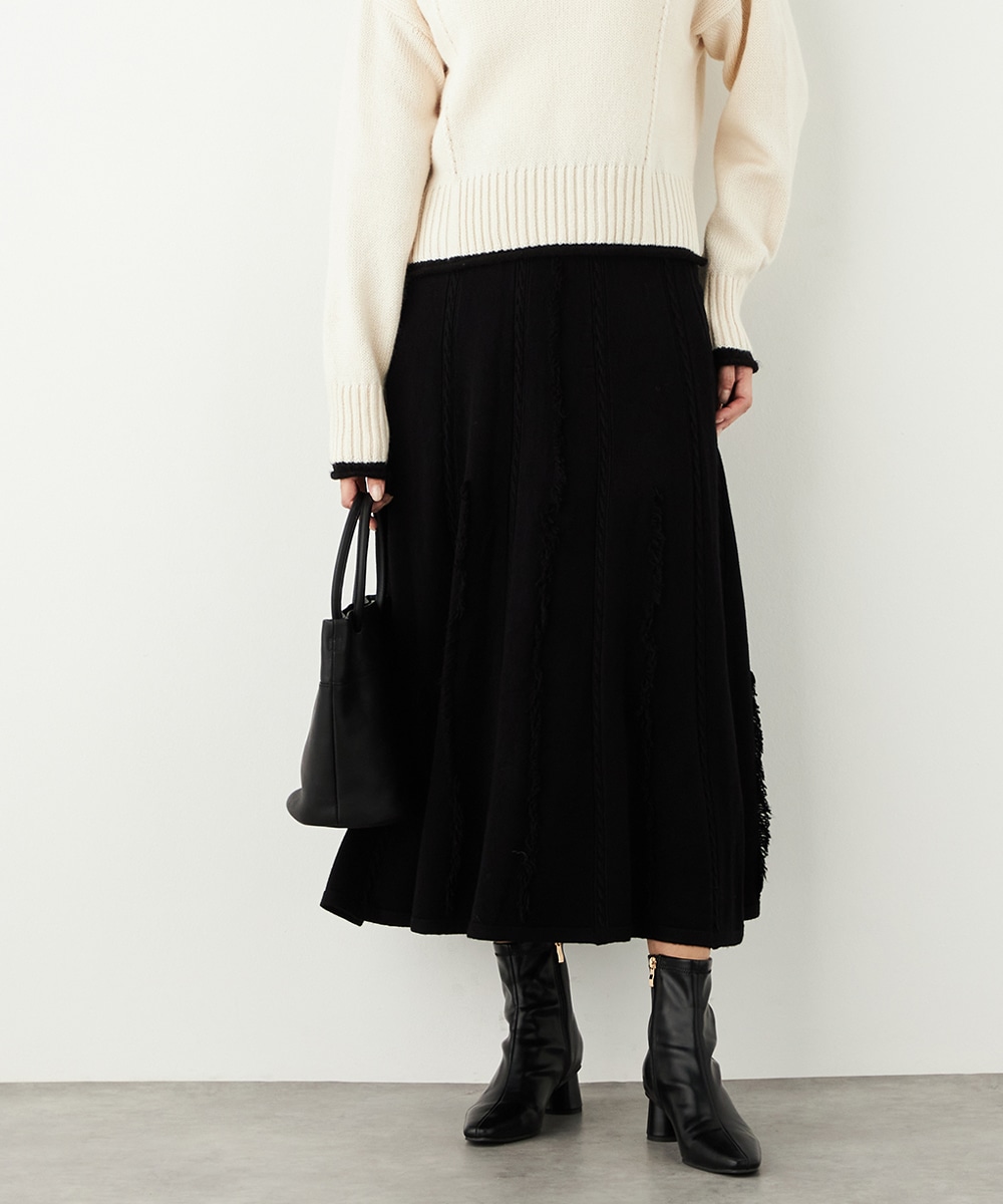 ボリューム控えめのフリンジが上品な存在感を発揮します。大人っぽくシックな印象のブラックのカラーは、取り入れやすさも魅力です。裾のラインが広がりすぎず、品良く穿きこなせるシルエットに仕上げています。ウエストは総ゴム仕様でフィット感良く着用が可能です。