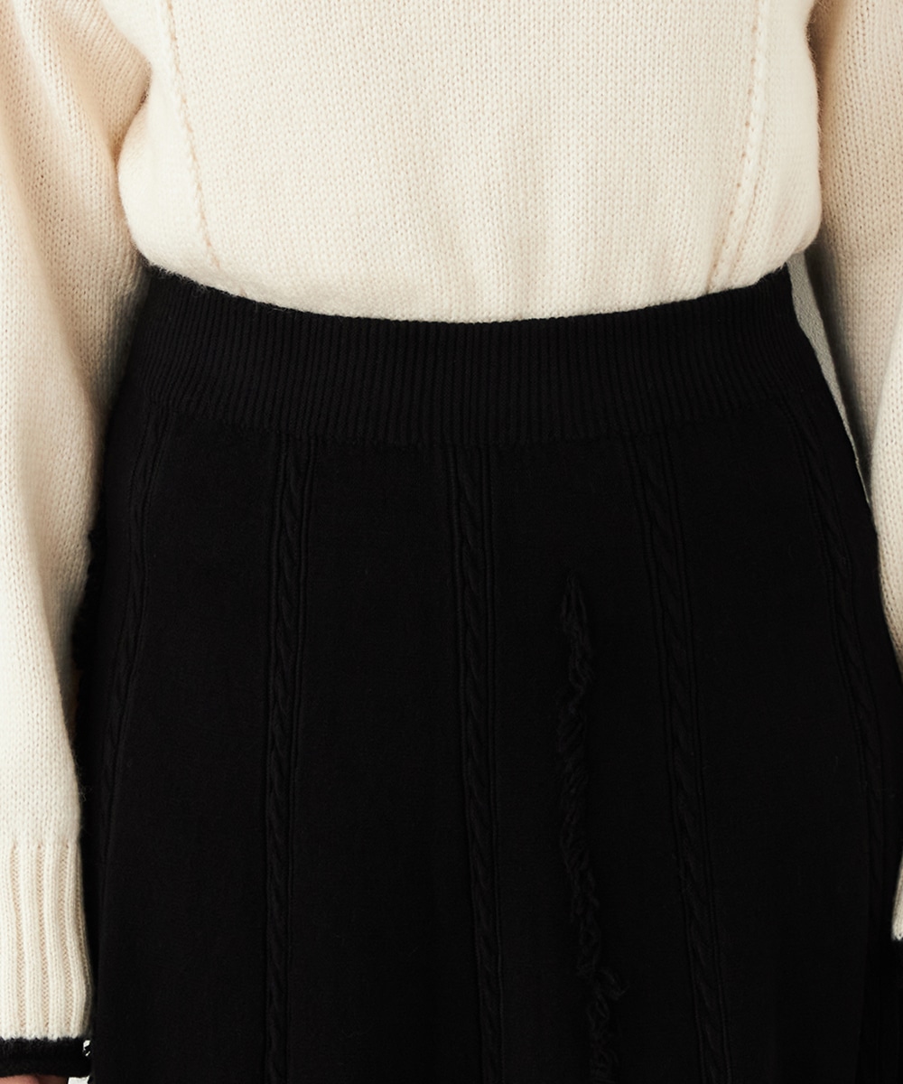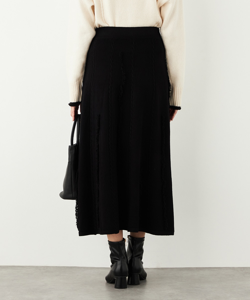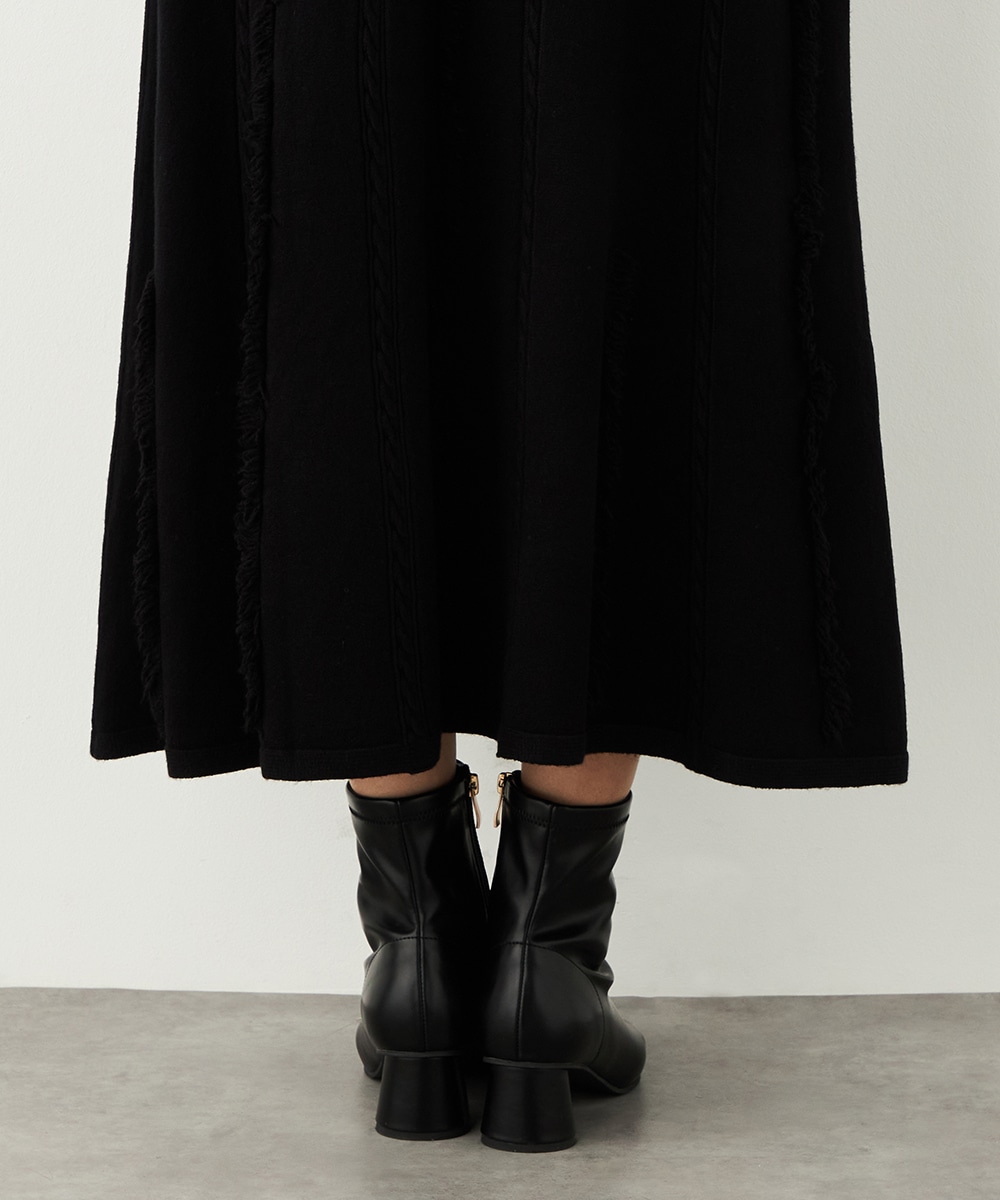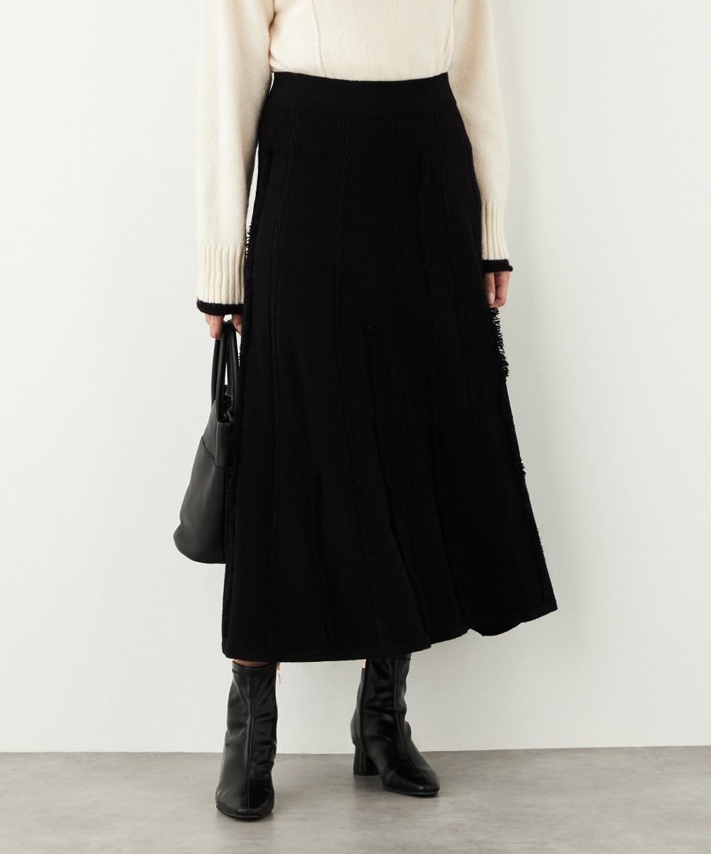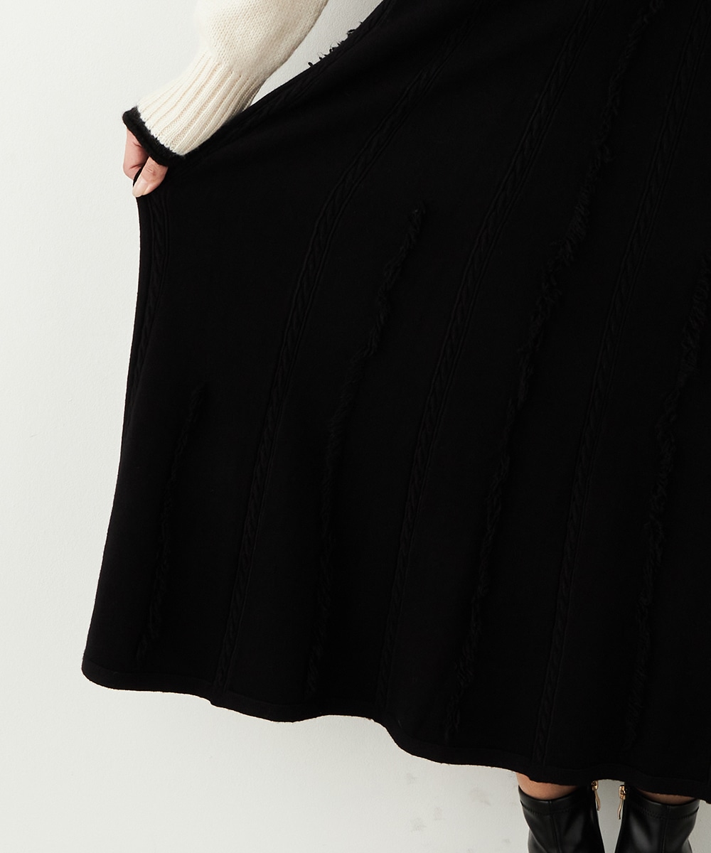 ボリューム控えめのフリンジが上品な存在感を発揮します。大人っぽくシックな印象のブラックのカラーは、取り入れやすさも魅力です。裾のラインが広がりすぎず、品良く穿きこなせるシルエットに仕上げています。ウエストは総ゴム仕様でフィット感良く着用が可能です。