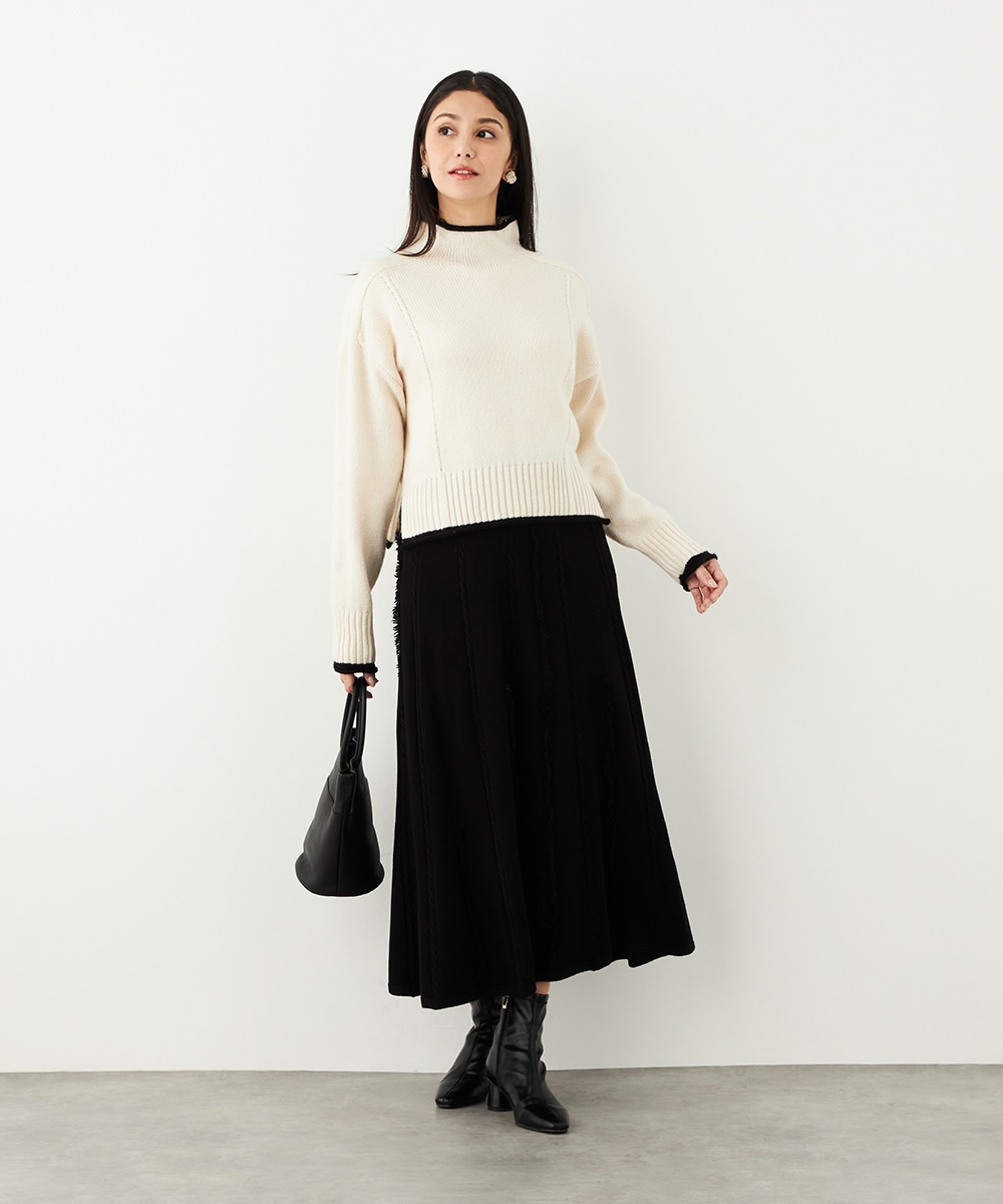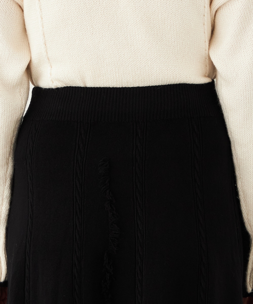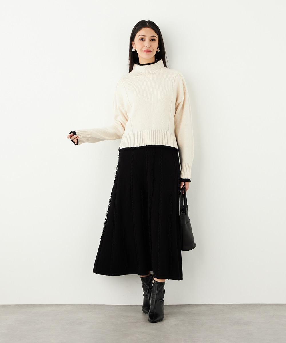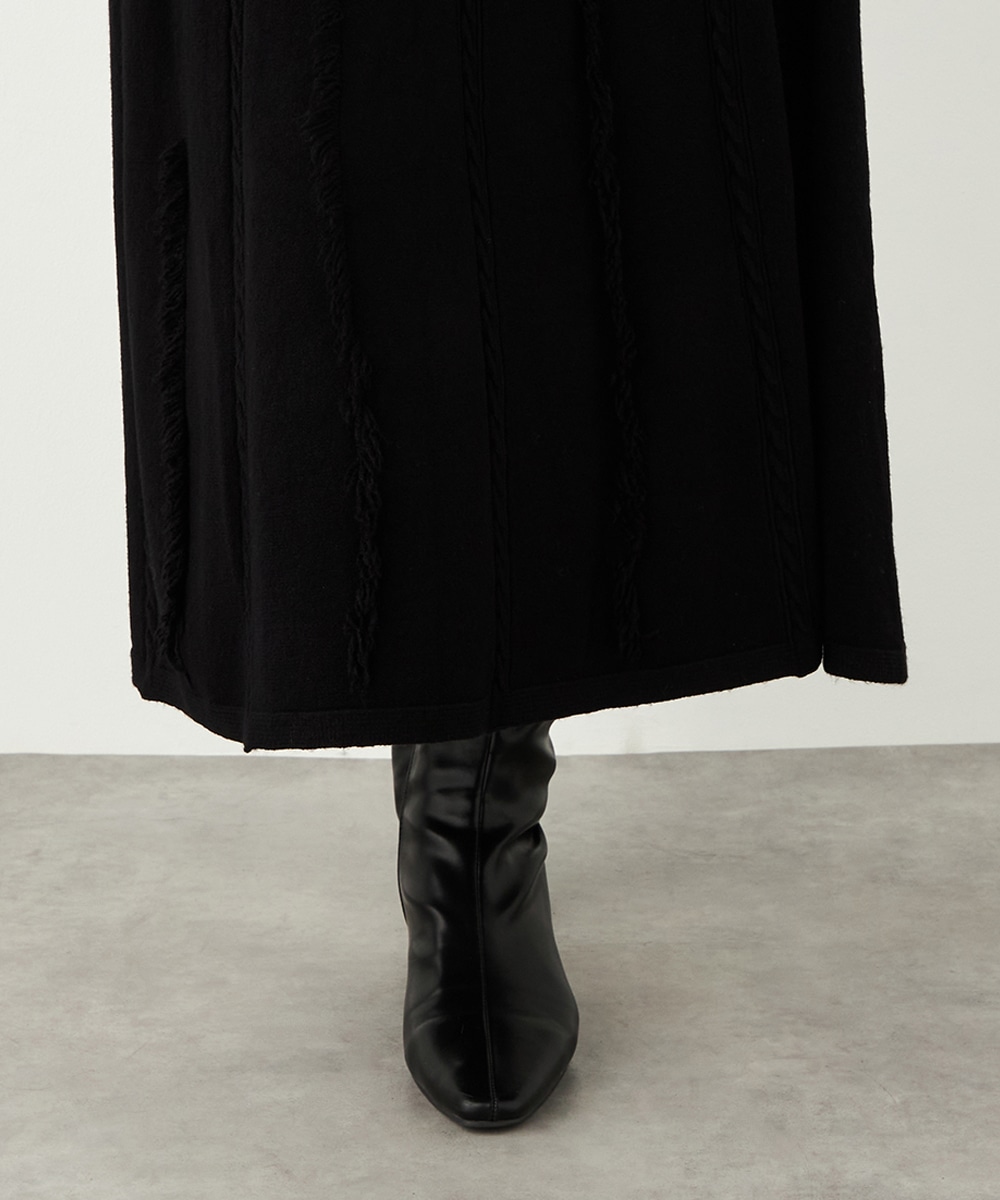ボリューム控えめのフリンジが上品な存在感を発揮します。大人っぽくシックな印象のブラックのカラーは、取り入れやすさも魅力です。裾のラインが広がりすぎず、品良く穿きこなせるシルエットに仕上げています。ウエストは総ゴム仕様でフィット感良く着用が可能です。