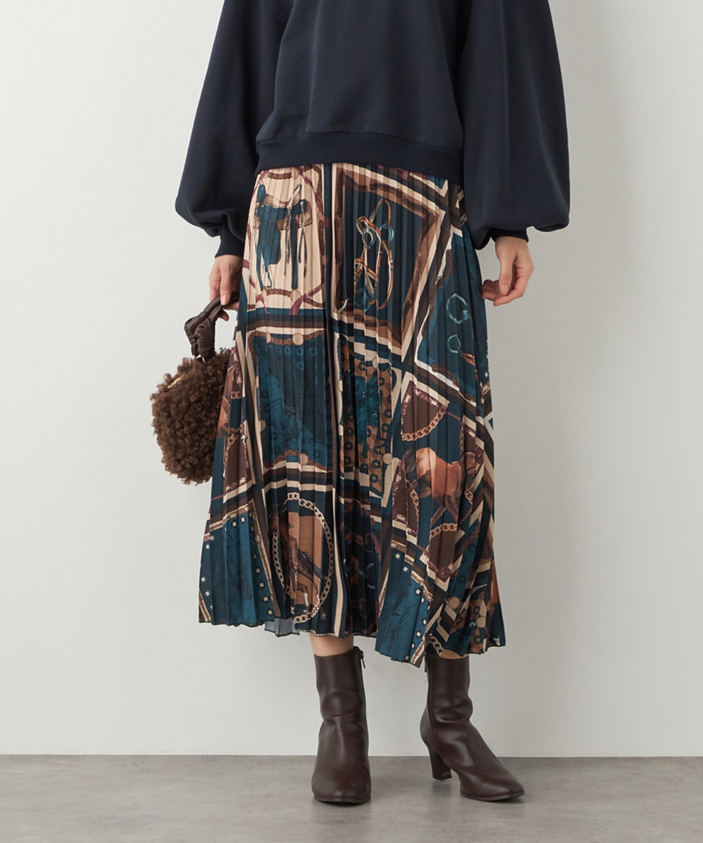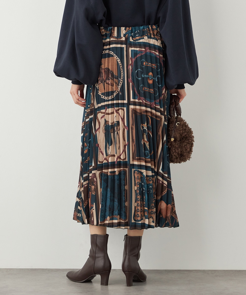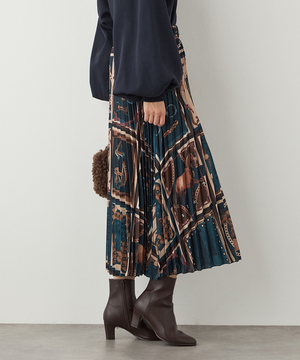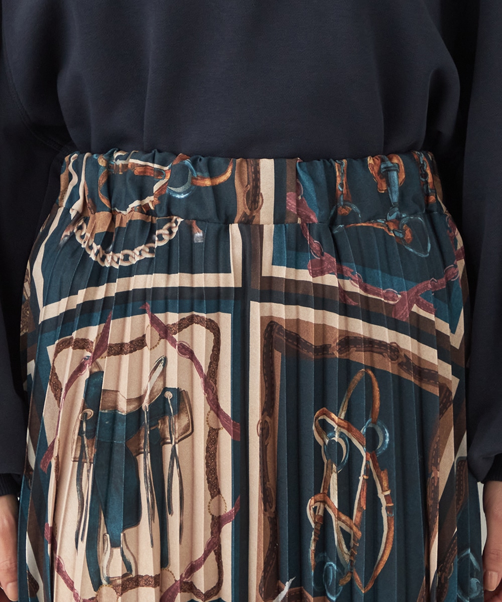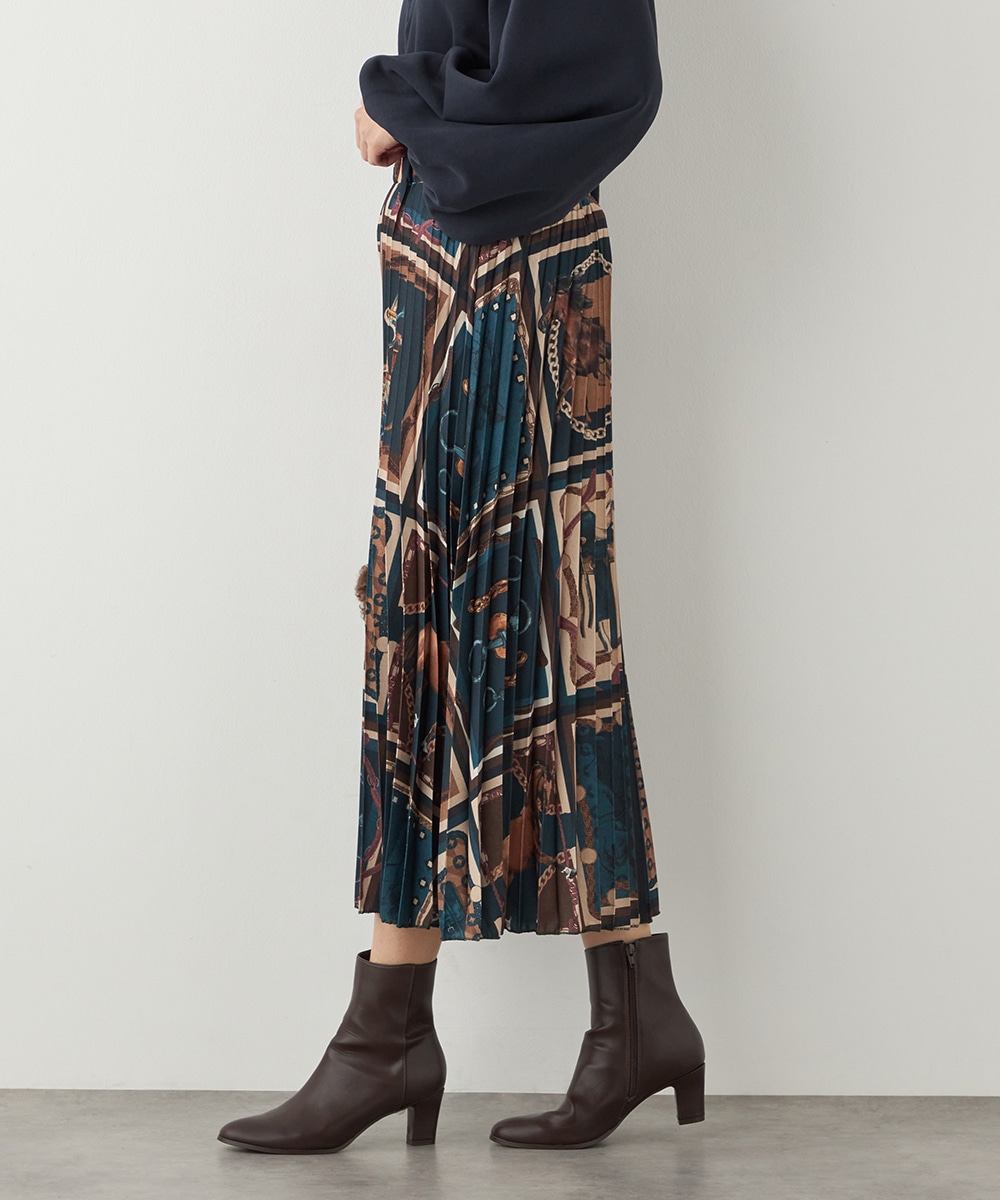 コーディネートの決め手にもぴったりなスカーフプリントのスカート。深みのあるグリーンカラーをベースにした、シックな配色でまとめました。細かなプリーツが施され、動いた際の揺れ感がエレガントな印象です。ウエストは総ゴム仕様でフィット感良く着用できます。