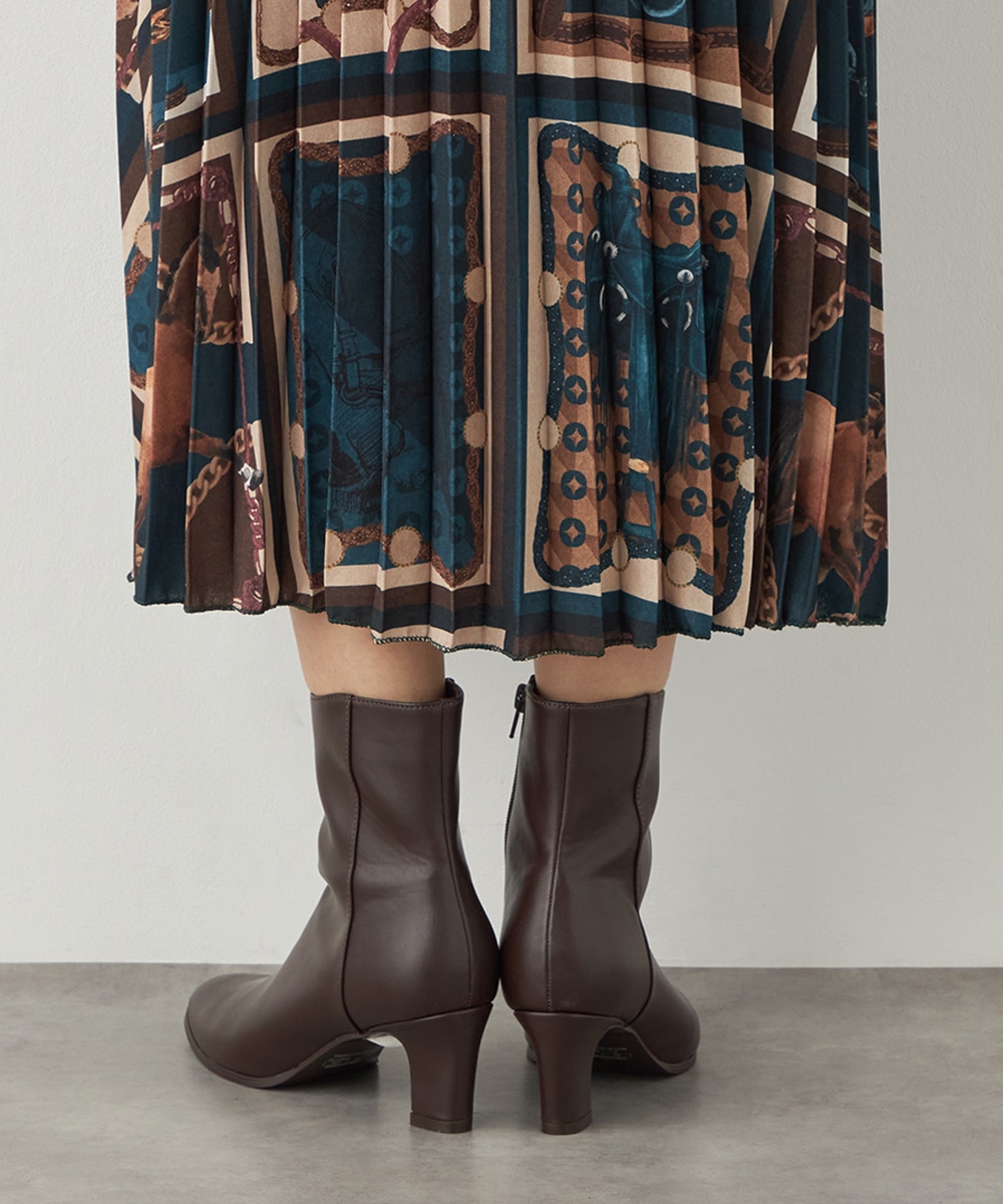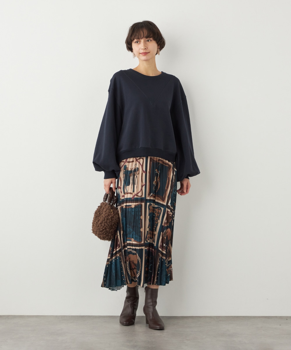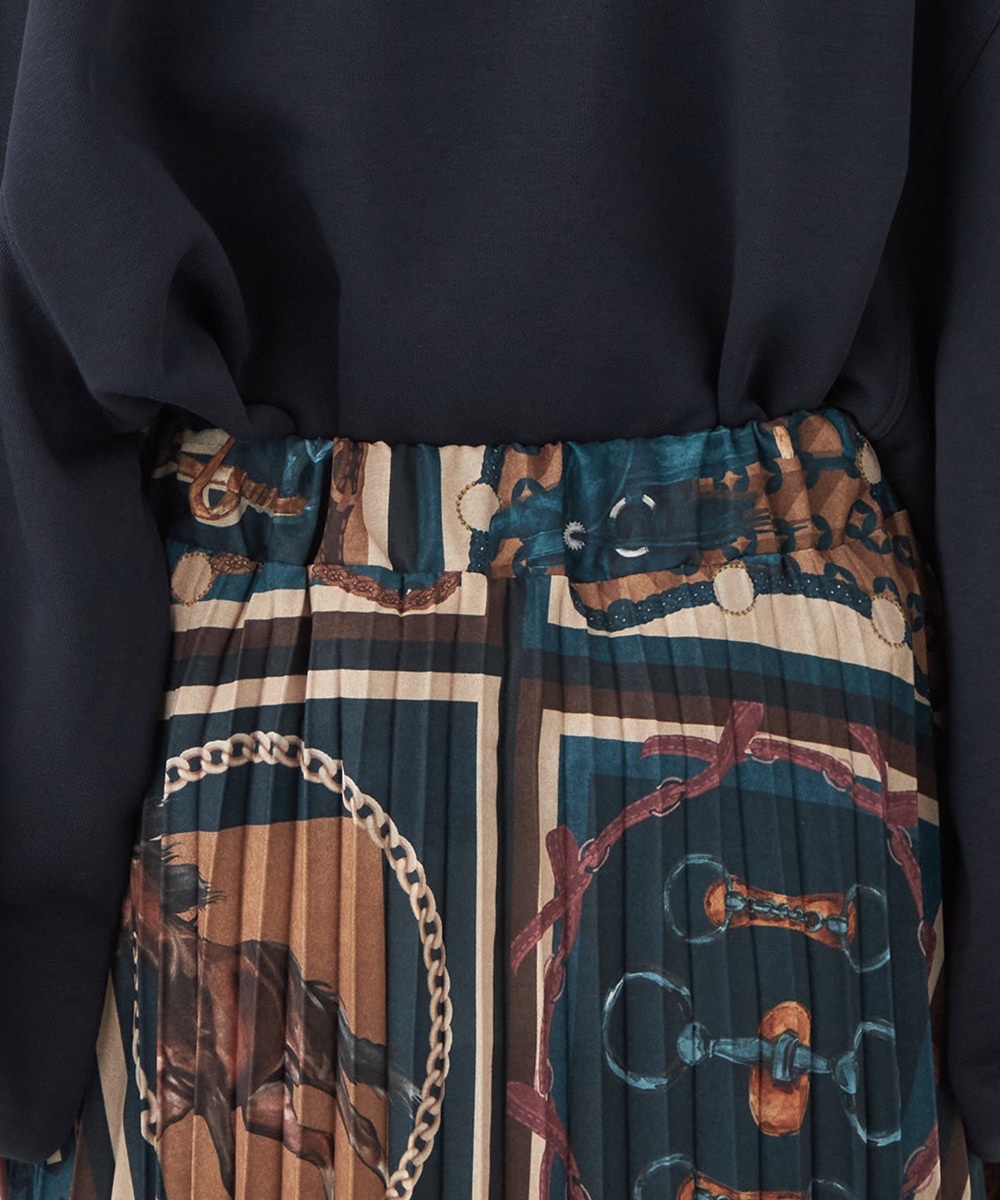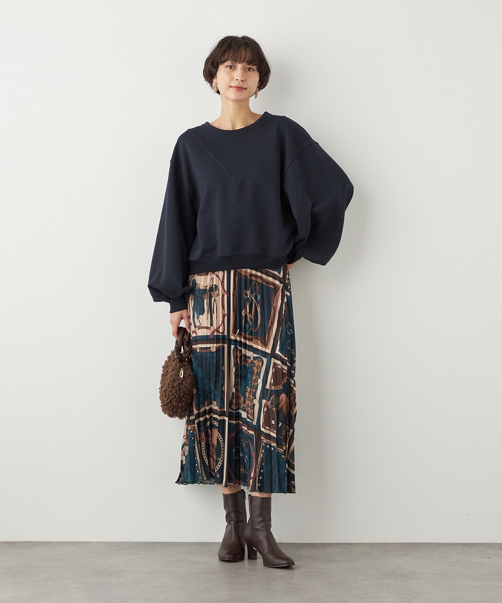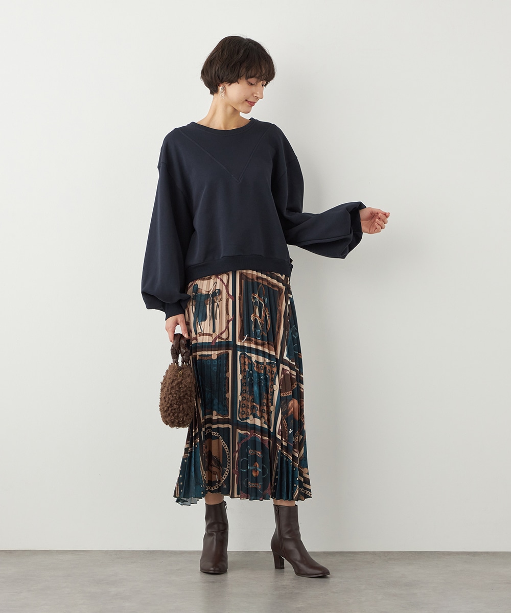 コーディネートの決め手にもぴったりなスカーフプリントのスカート。深みのあるグリーンカラーをベースにした、シックな配色でまとめました。細かなプリーツが施され、動いた際の揺れ感がエレガントな印象です。ウエストは総ゴム仕様でフィット感良く着用できます。
