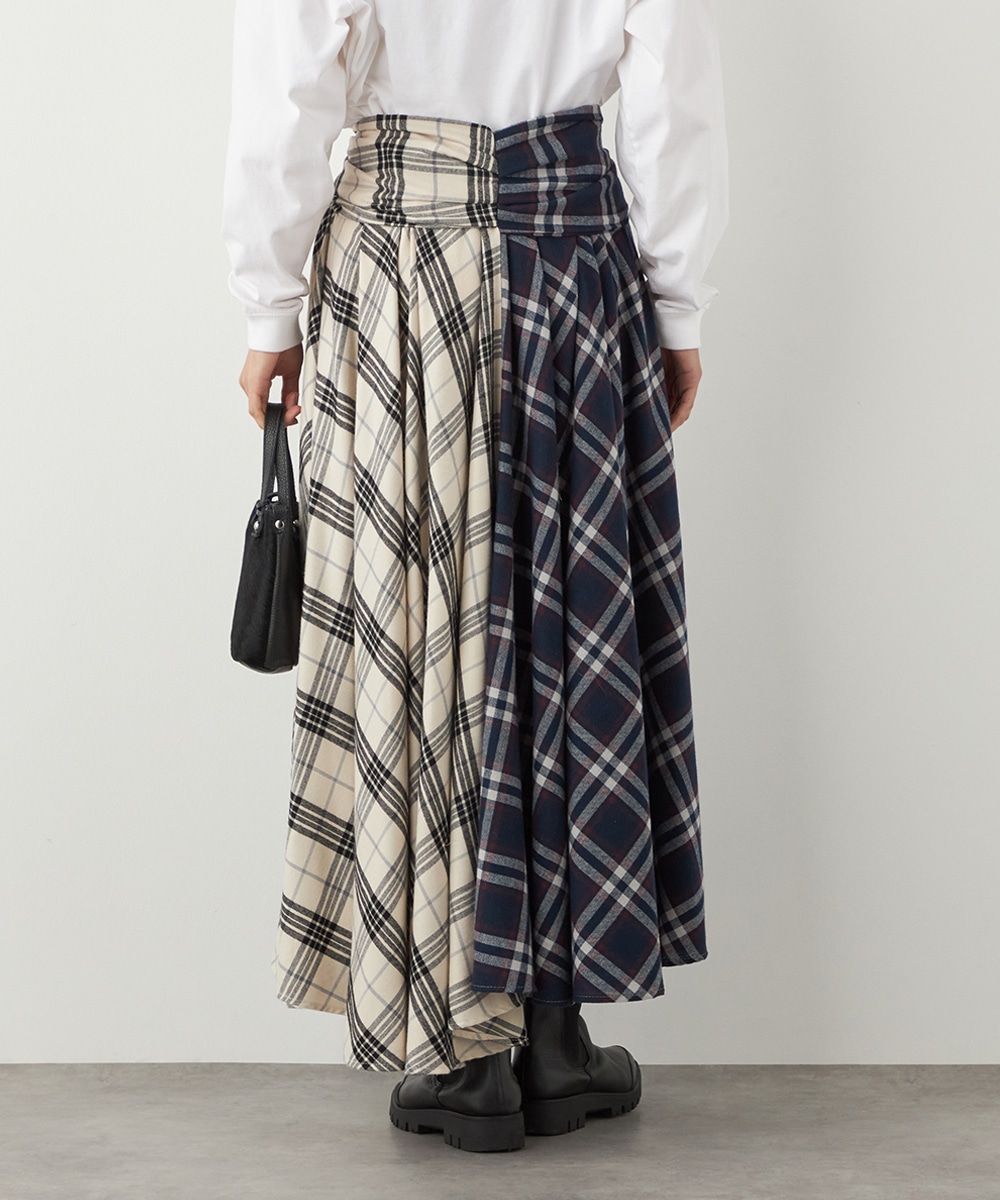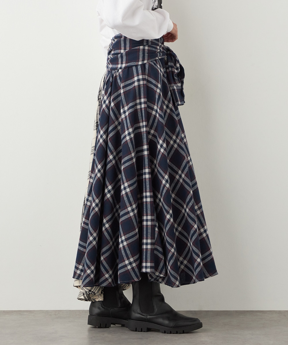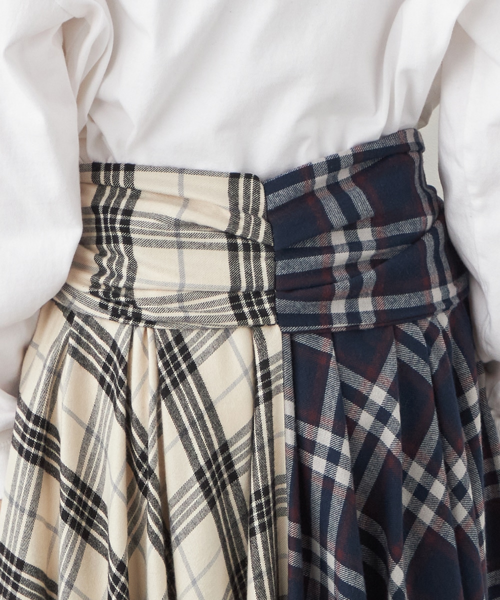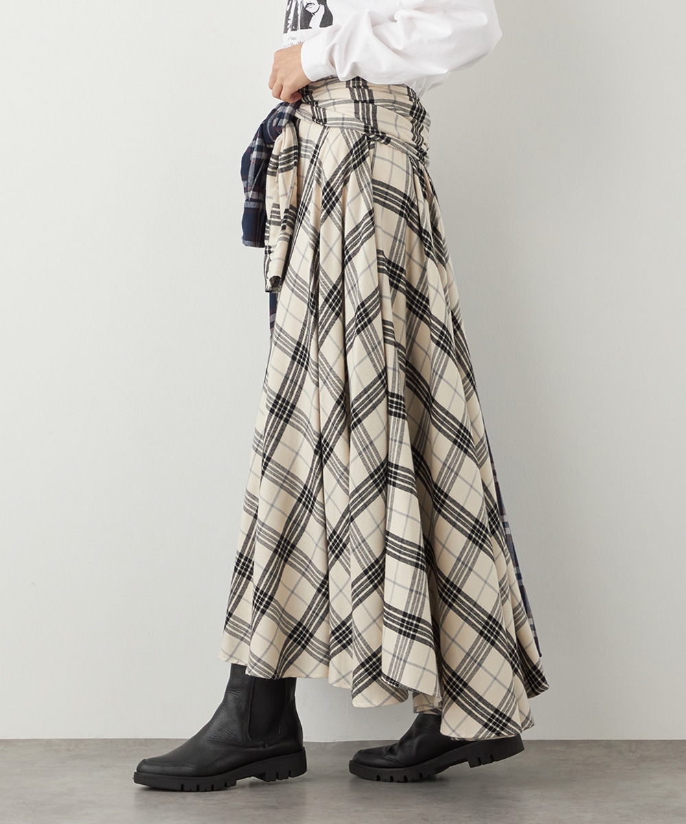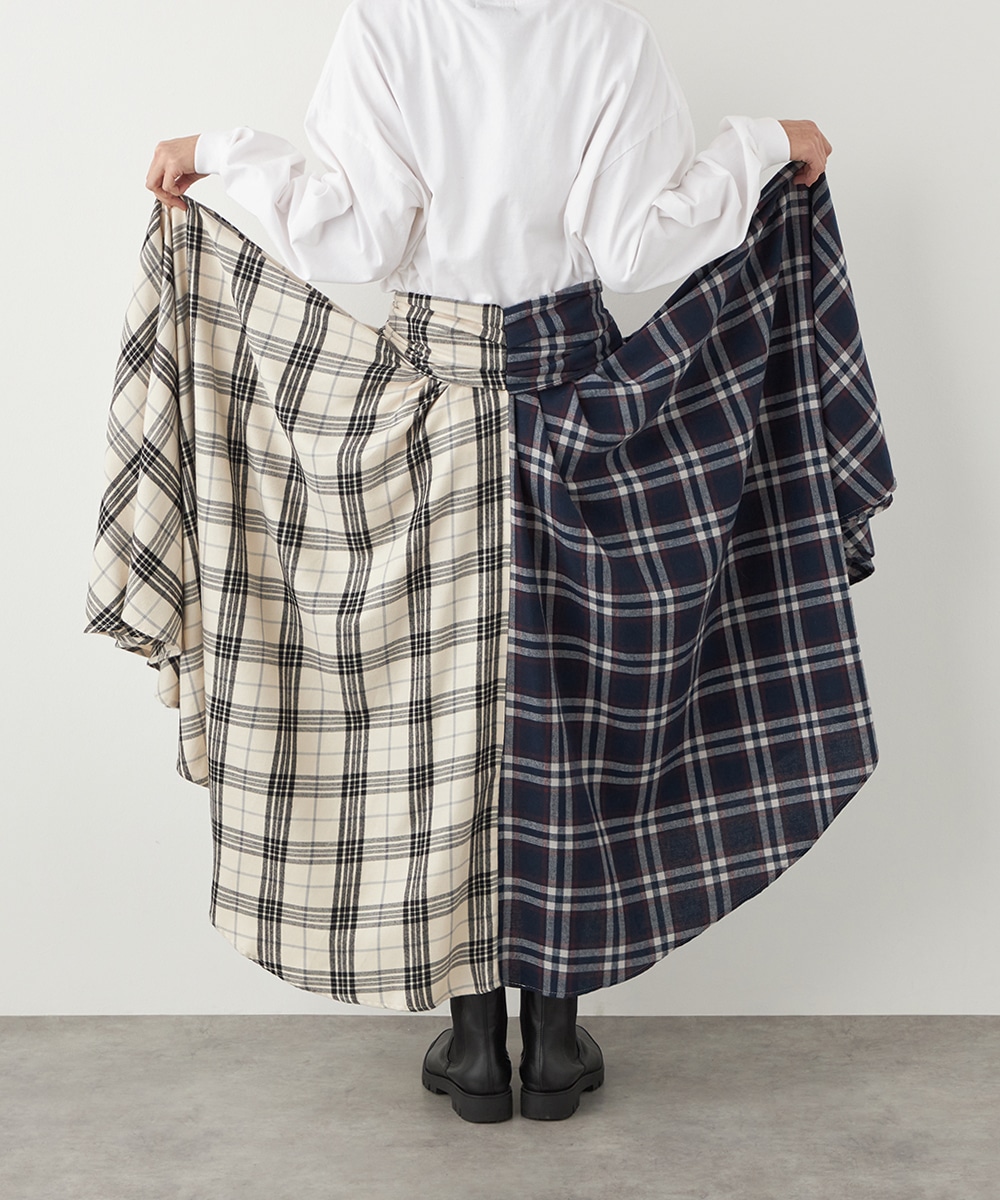 フロントの袖口風のディテールやカラーリングのコントラストが印象的です。たっぷりのフレア感とロング丈のボリュームも目を引き、コーディネートのポイントとして活躍します。ぬくもりの漂う生地感が秋冬シーズンらしさを演出。ウエストはフィット感が快適なゴム仕様です。
