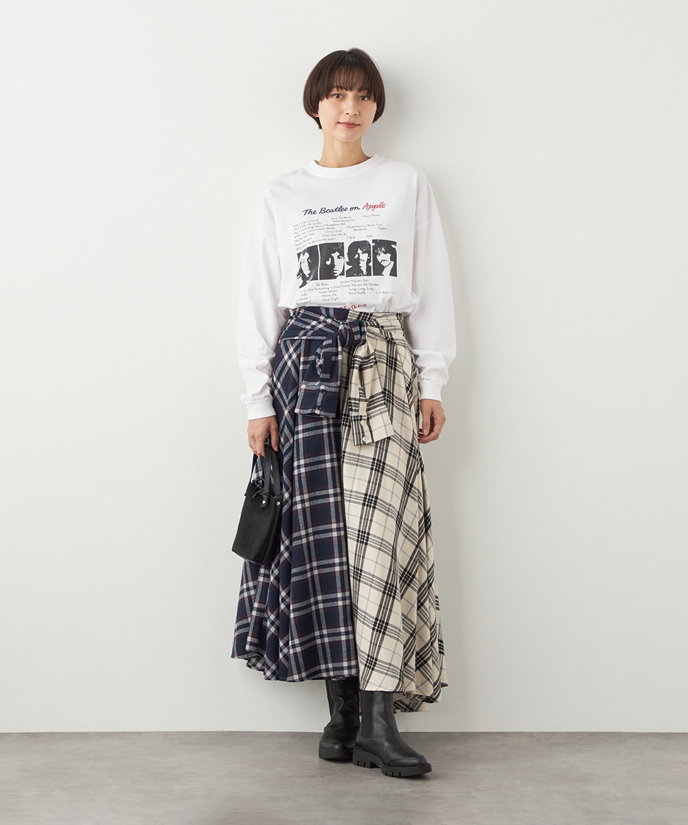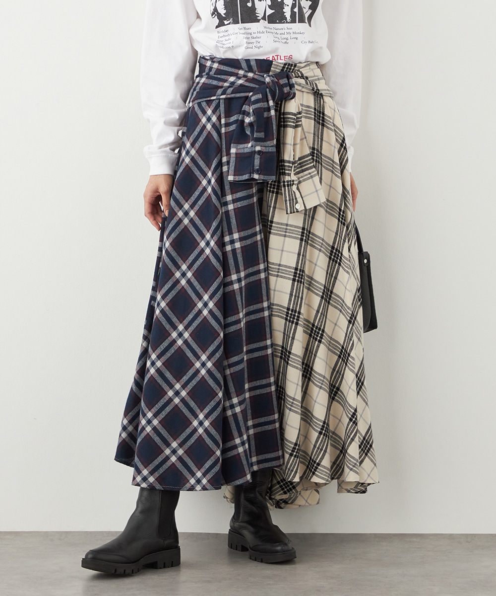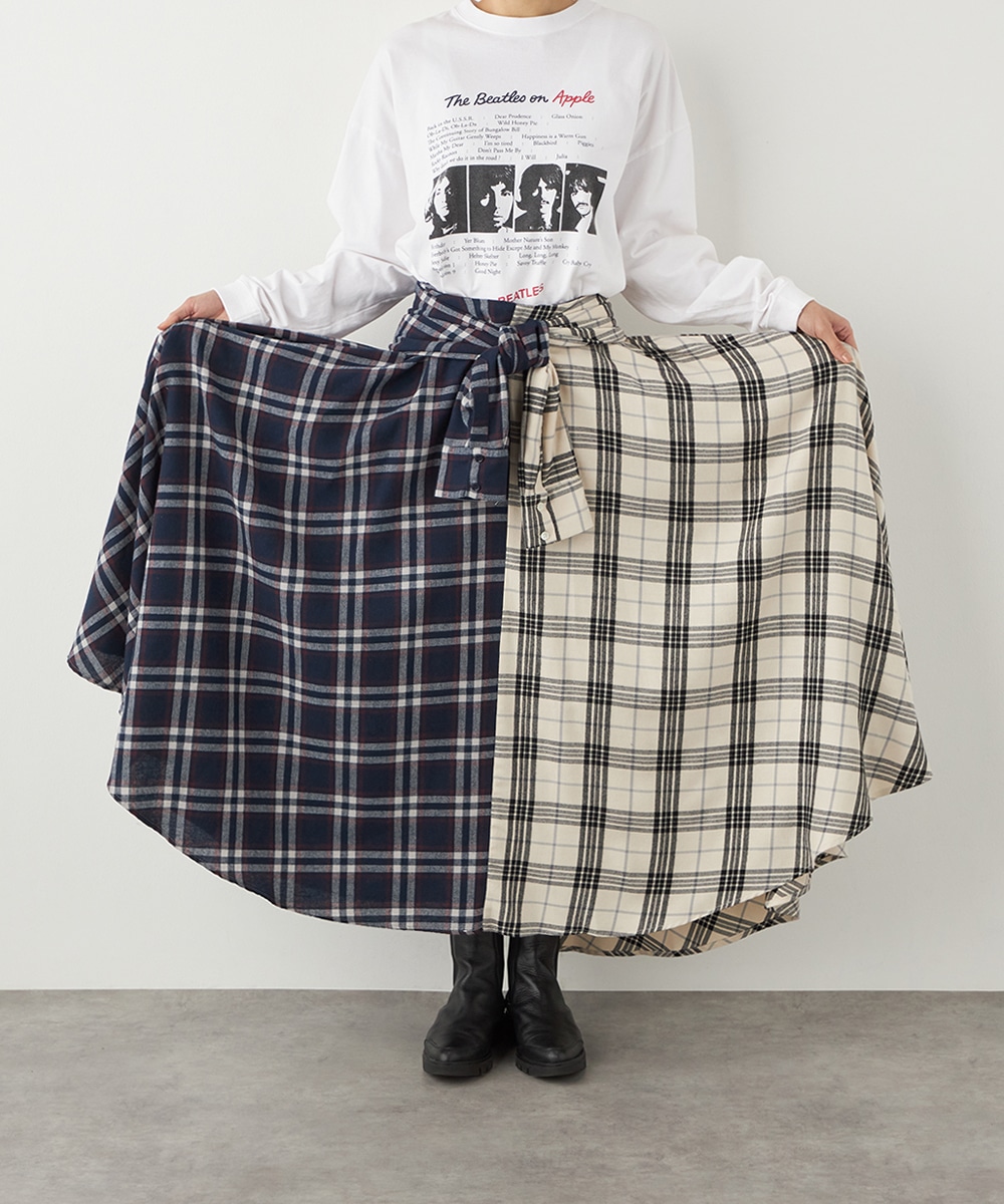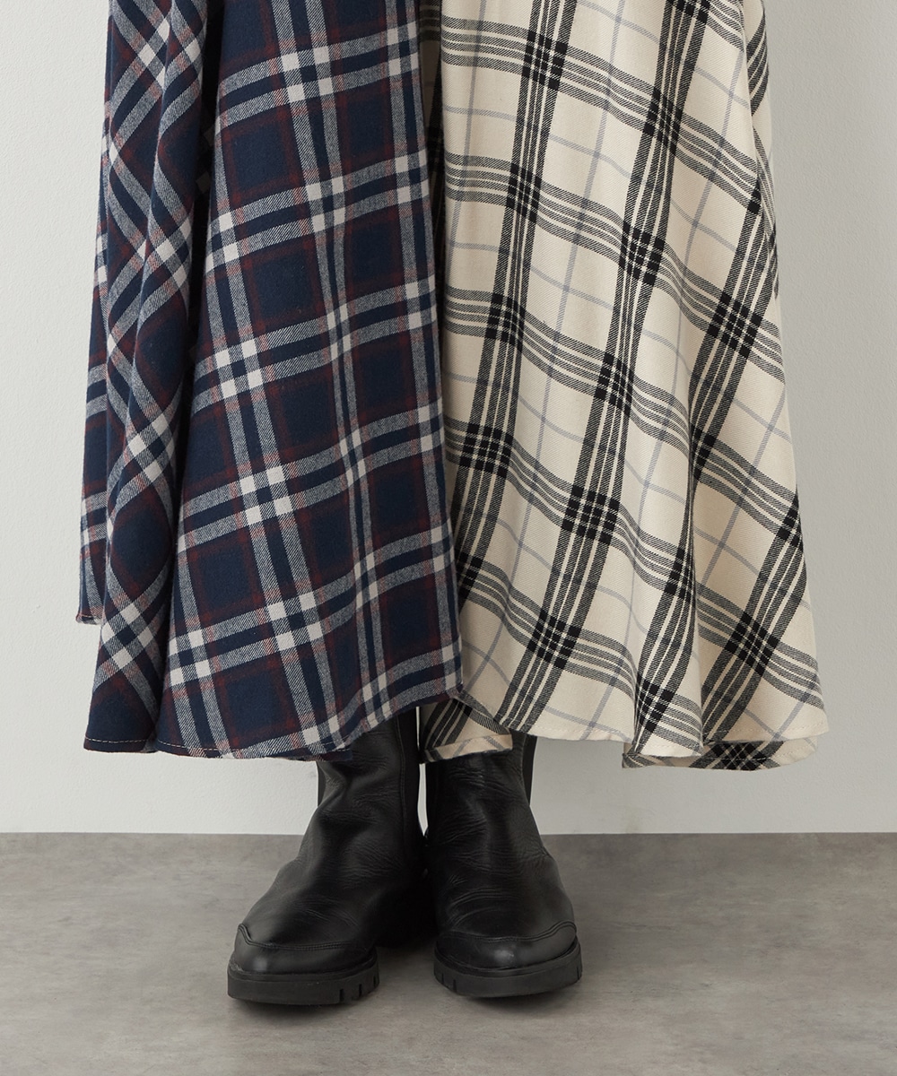フロントの袖口風のディテールやカラーリングのコントラストが印象的です。たっぷりのフレア感とロング丈のボリュームも目を引き、コーディネートのポイントとして活躍します。ぬくもりの漂う生地感が秋冬シーズンらしさを演出。ウエストはフィット感が快適なゴム仕様です。