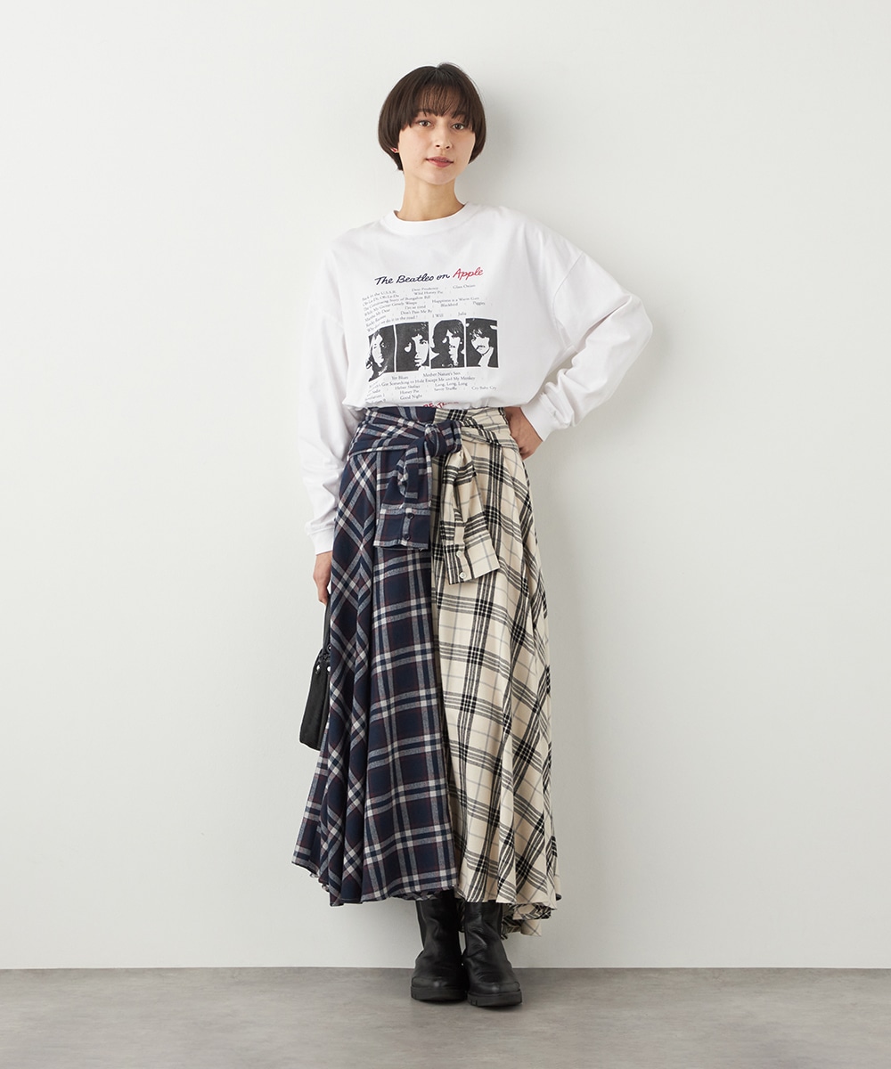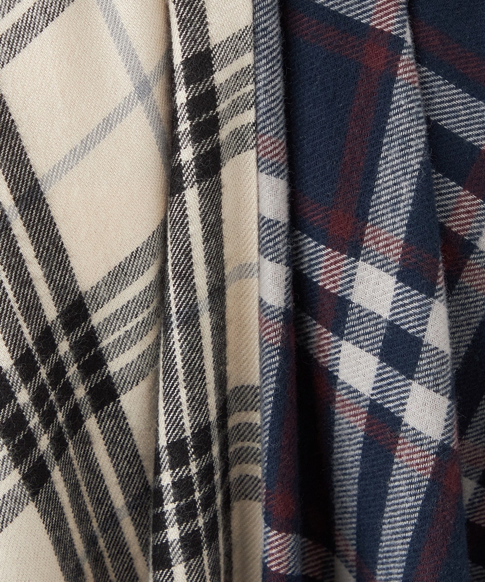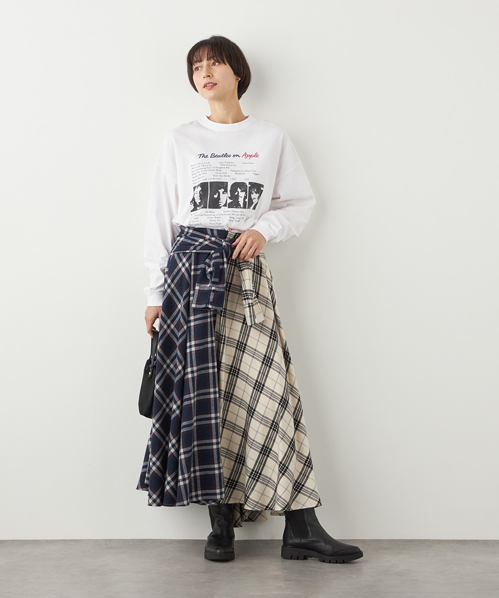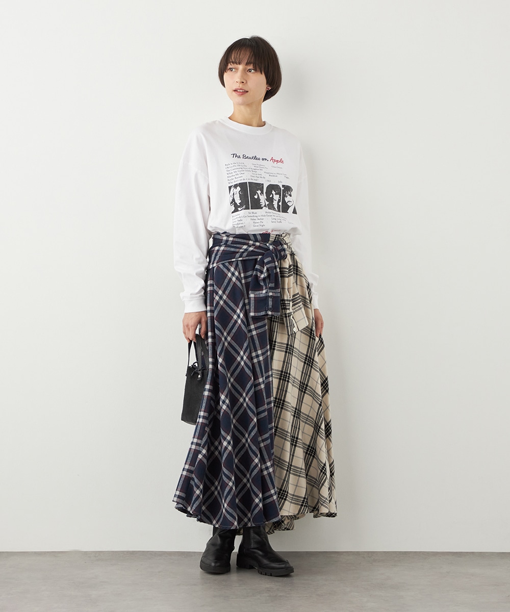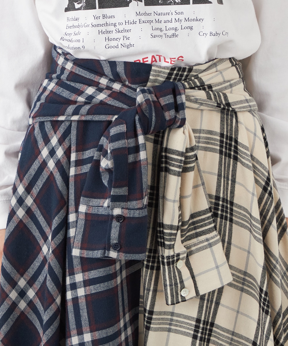 フロントの袖口風のディテールやカラーリングのコントラストが印象的です。たっぷりのフレア感とロング丈のボリュームも目を引き、コーディネートのポイントとして活躍します。ぬくもりの漂う生地感が秋冬シーズンらしさを演出。ウエストはフィット感が快適なゴム仕様です。