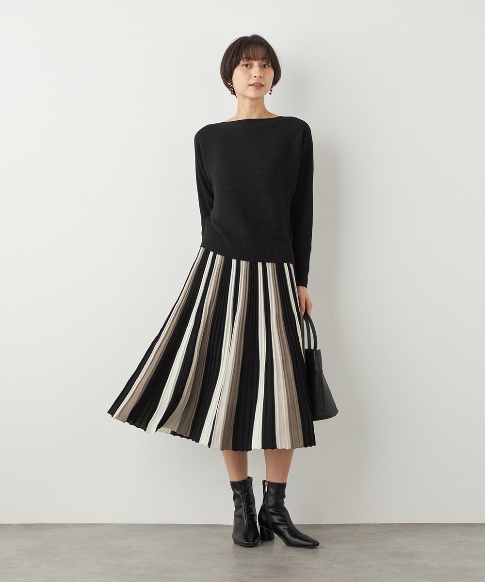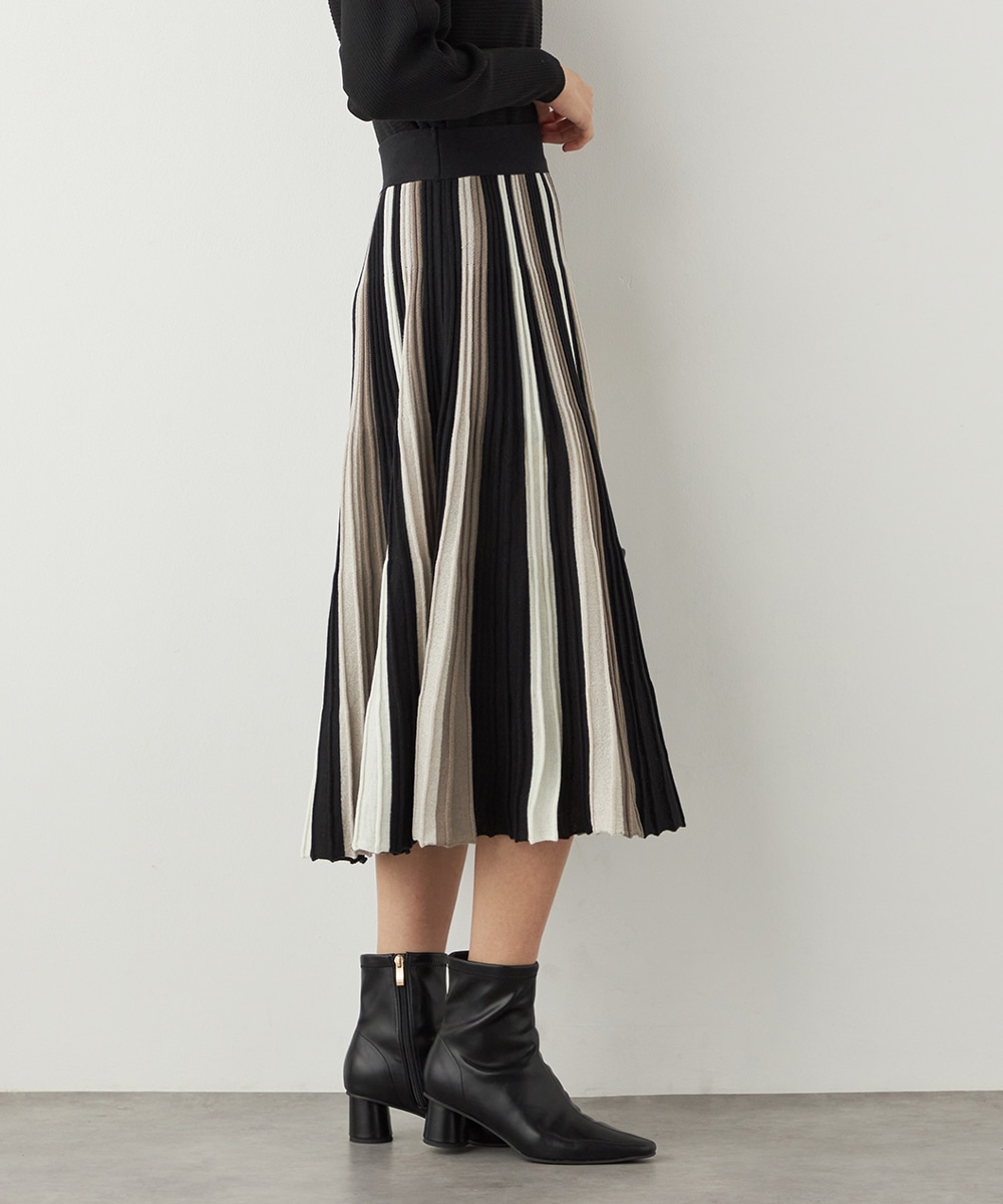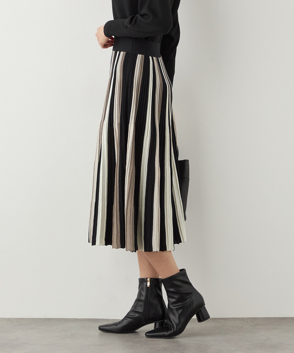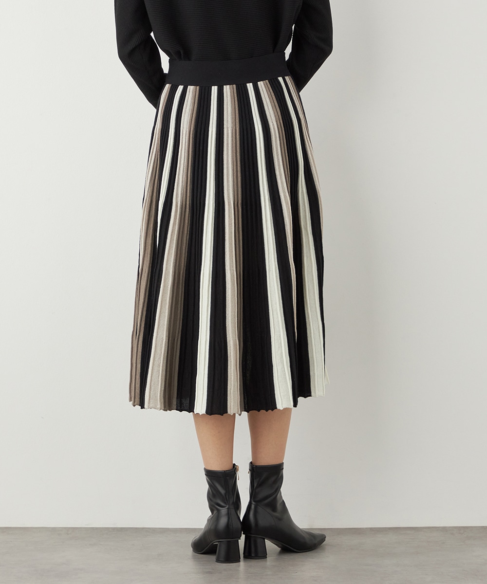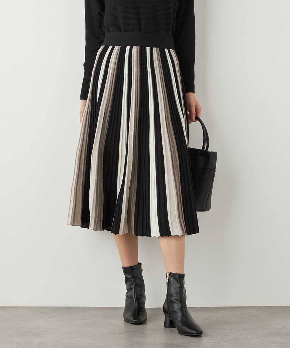 縦ラインが強調されてすっきりと穿きこなせるストライプ。ソフトな風合いも魅力のニットスカート。