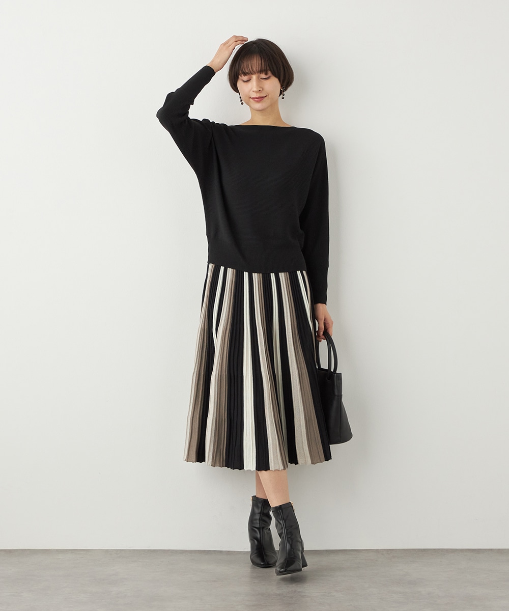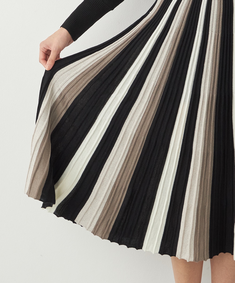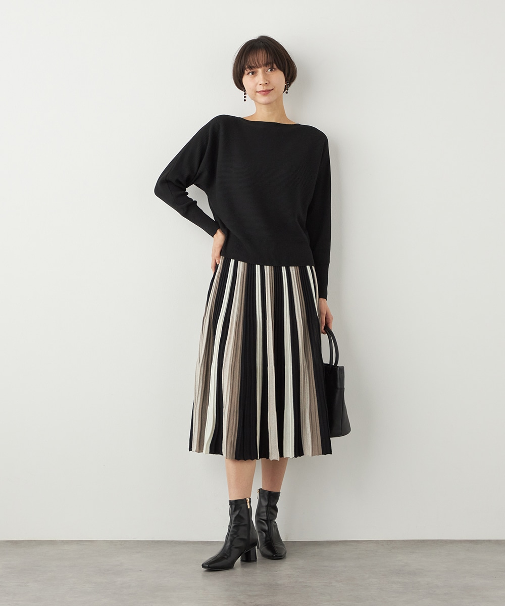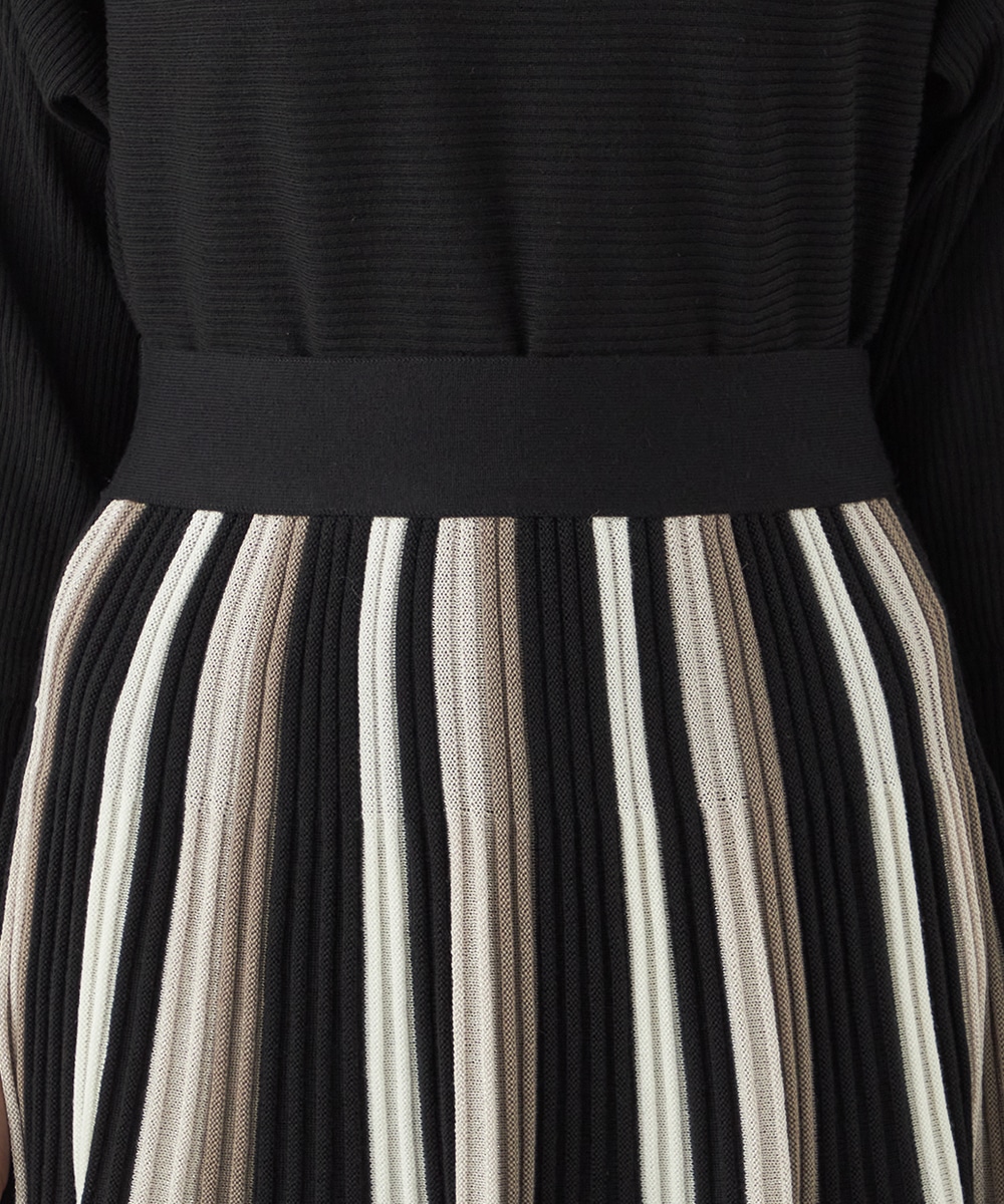 縦ラインが強調されてすっきりと穿きこなせるストライプ。ソフトな風合いも魅力のニットスカート。