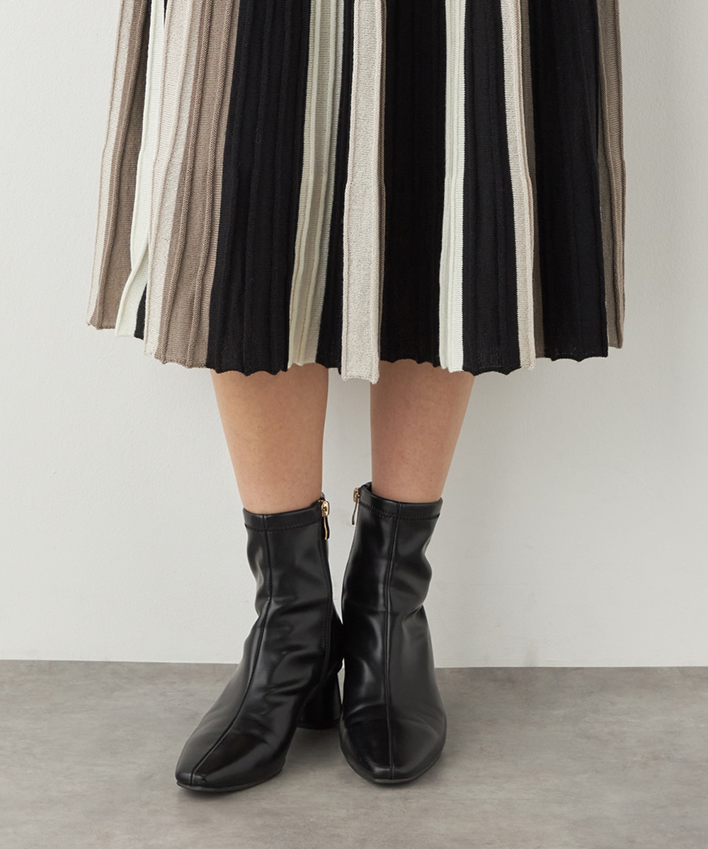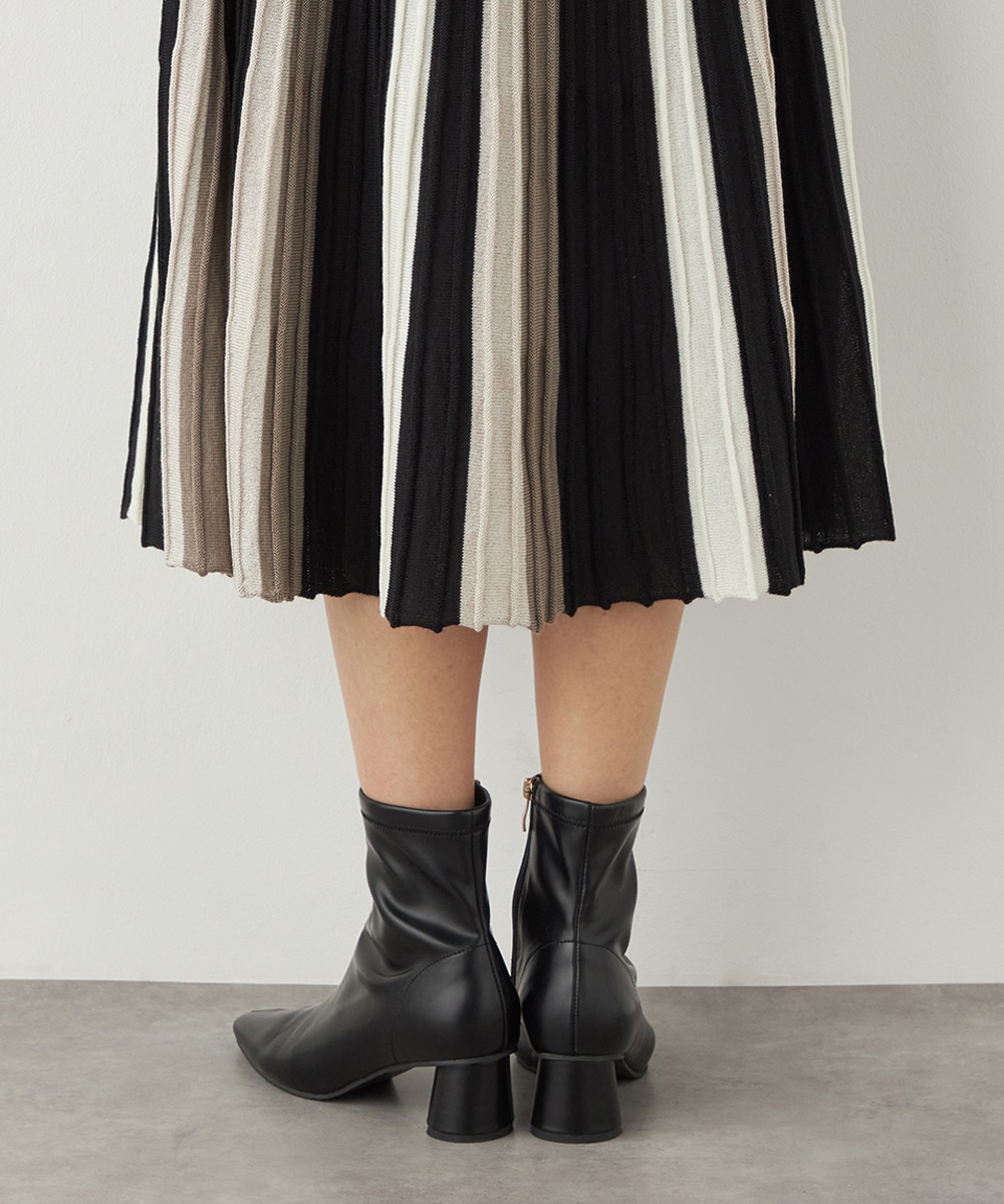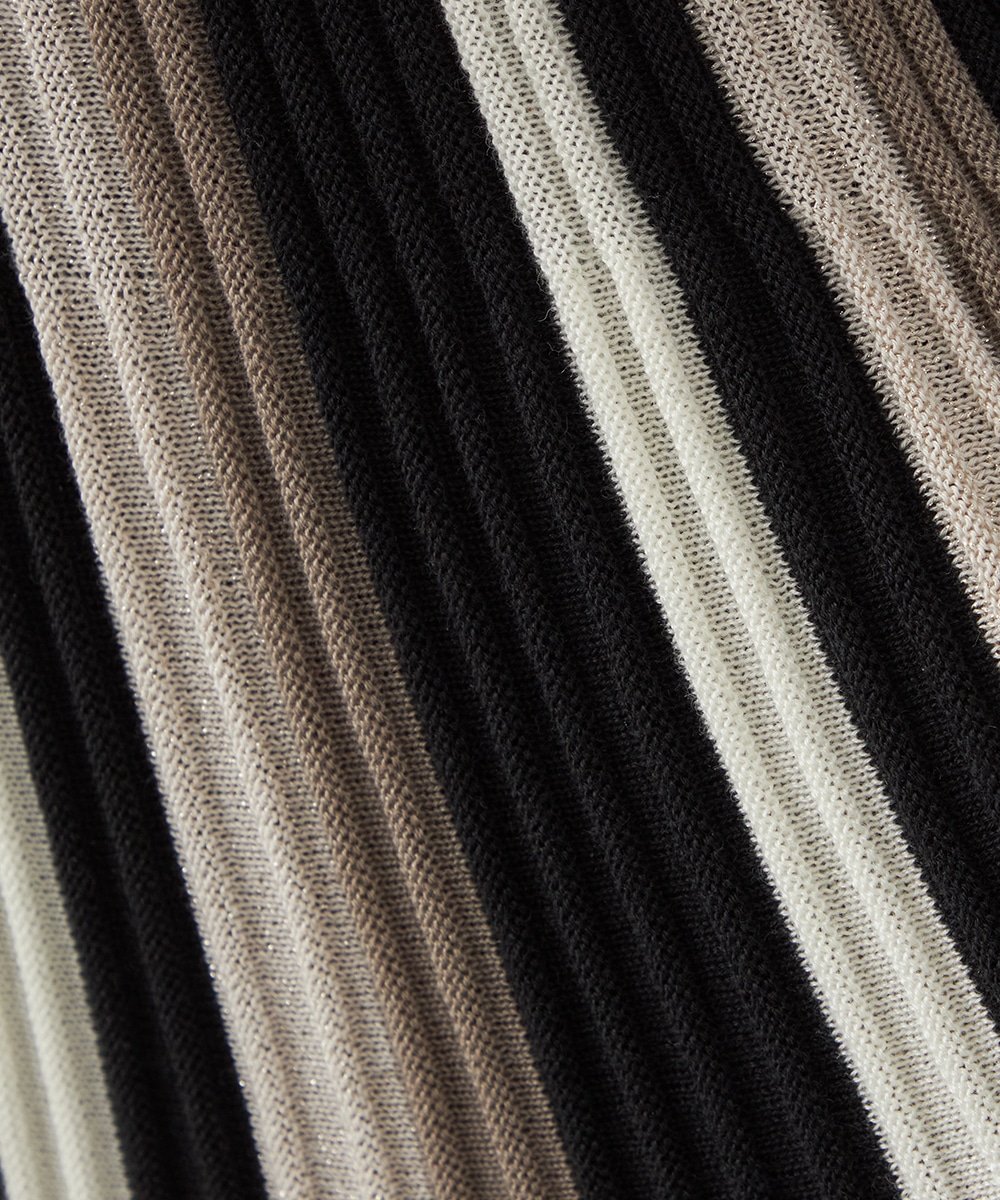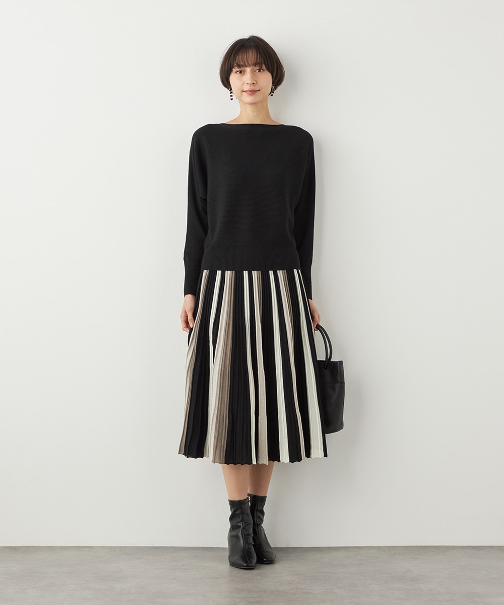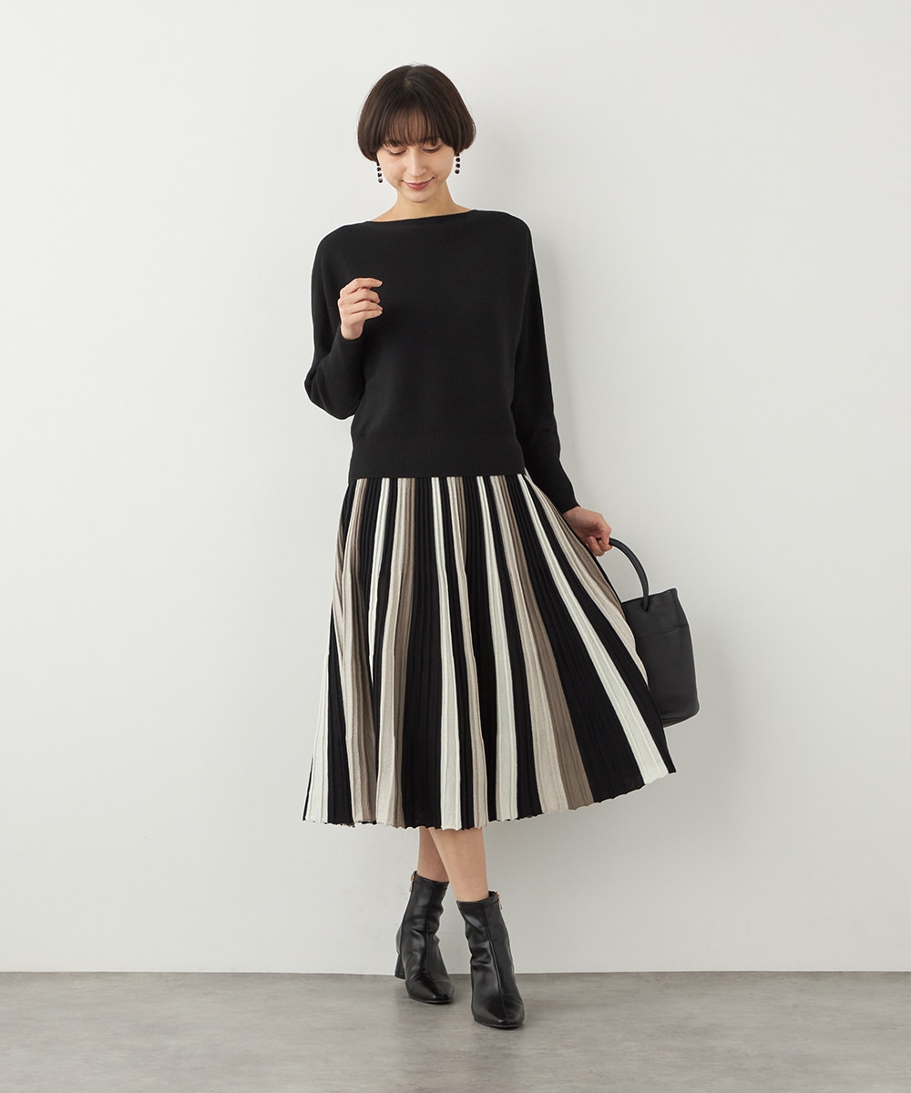 縦ラインが強調されてすっきりと穿きこなせるストライプ。ソフトな風合いも魅力のニットスカート。