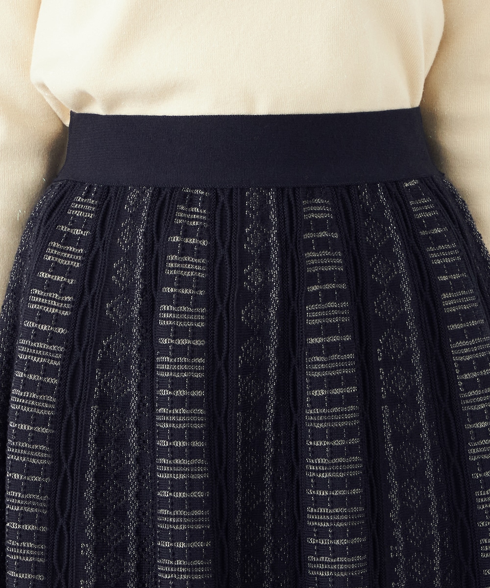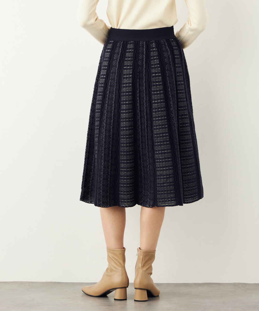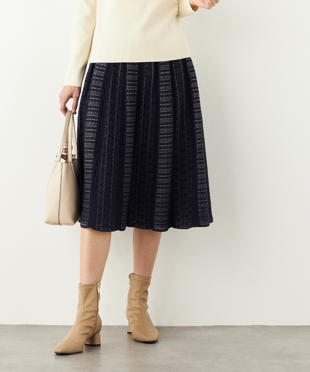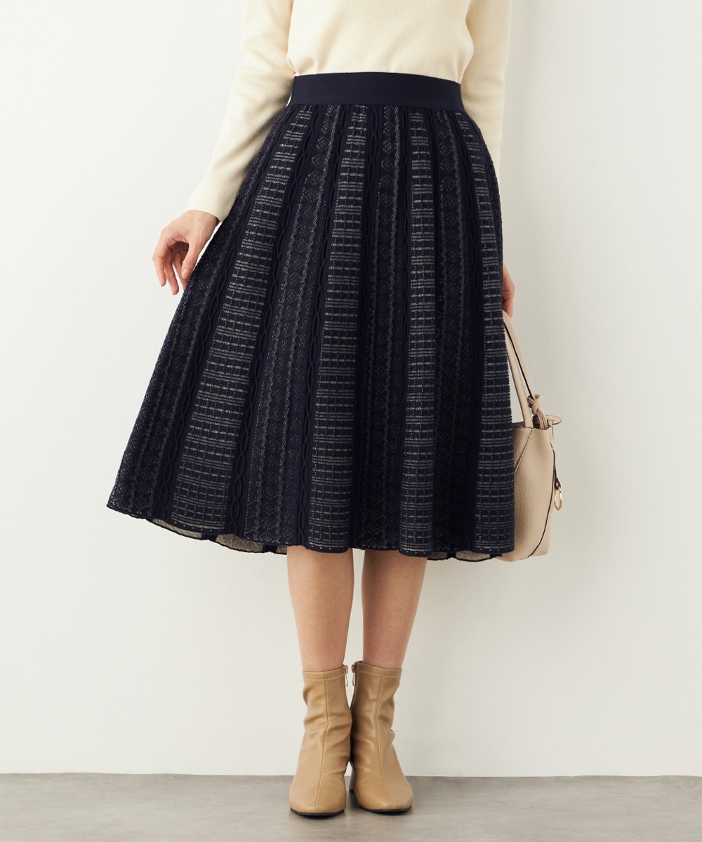 ストライプ状の柄により、縦のラインが強調されてすっきりと穿きこなせます。ほどよいフレアシルエットが大人っぽくエレガントなコーディネートを演出。ニットならではのソフトな風合いも魅力です。ウエストは総ゴム仕様でフィット感良く着用できます。