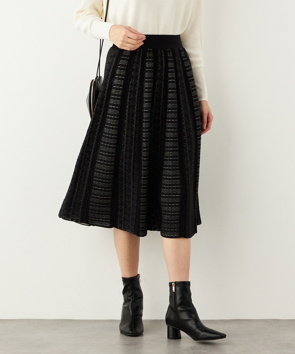 ストライプ状の柄により、縦のラインが強調されてすっきりと穿きこなせます。ほどよいフレアシルエットが大人っぽくエレガントなコーディネートを演出。ニットならではのソフトな風合いも魅力です。ウエストは総ゴム仕様でフィット感良く着用できます。