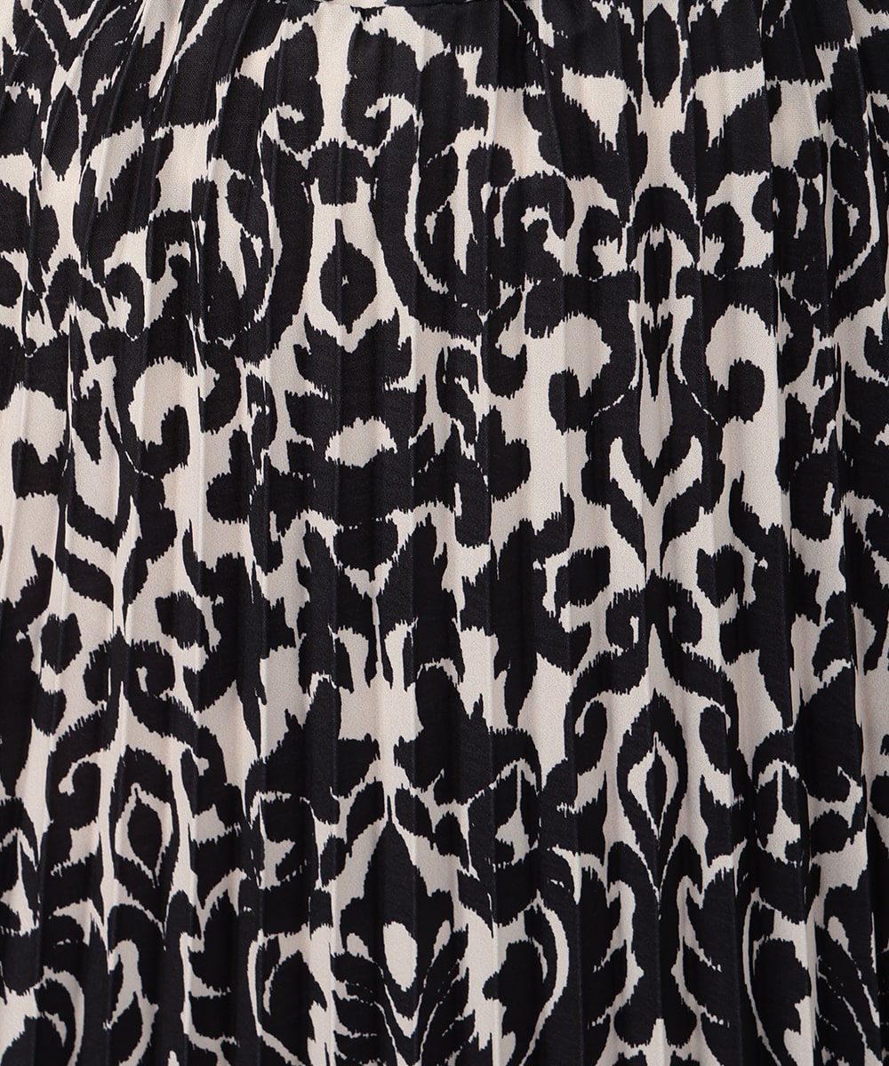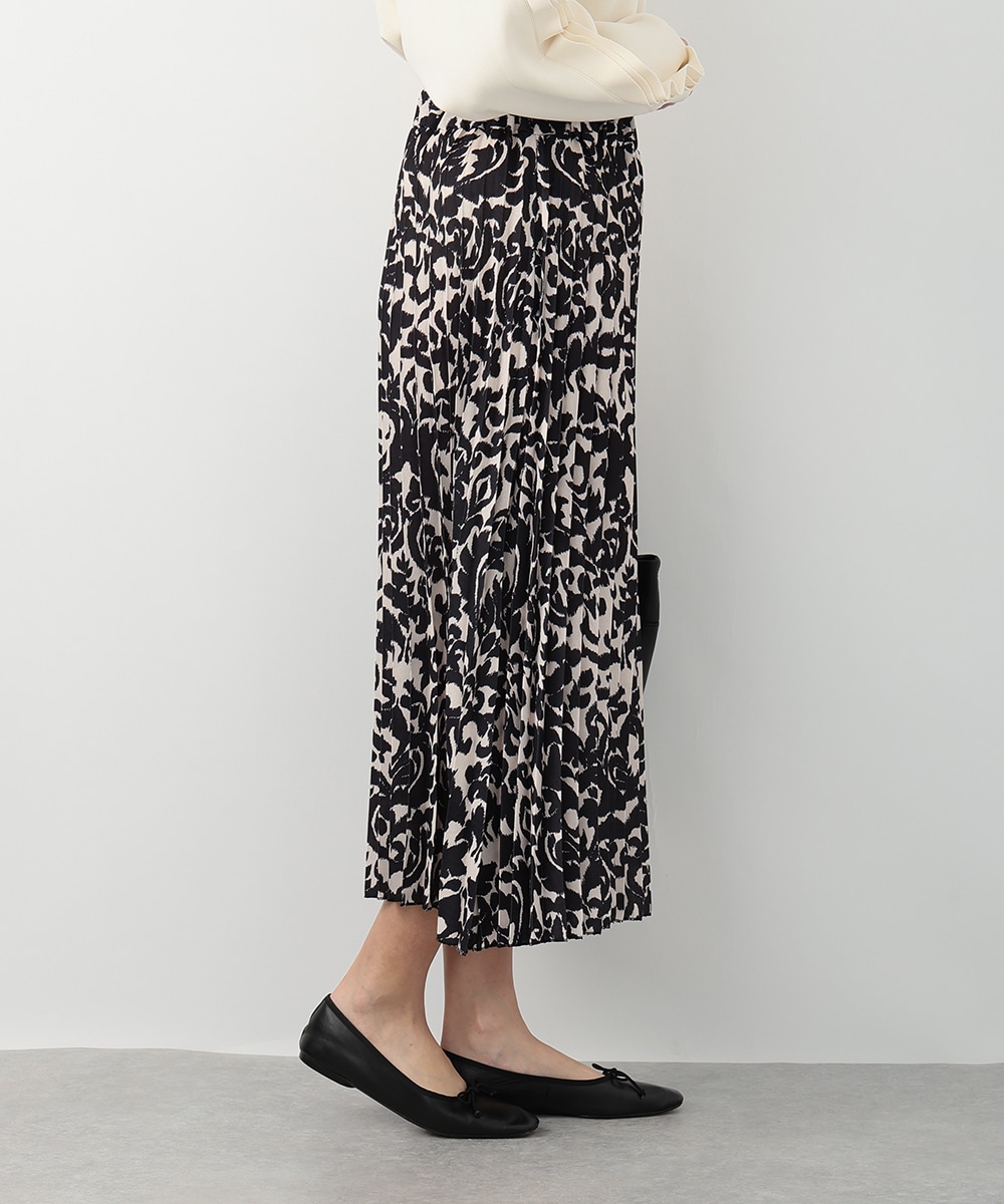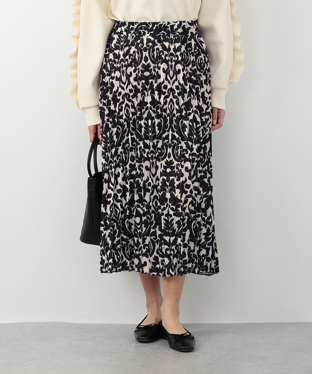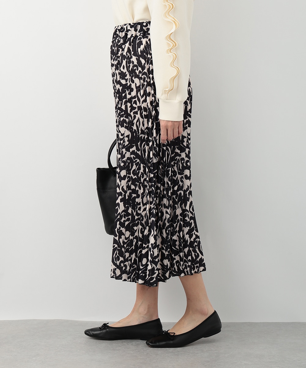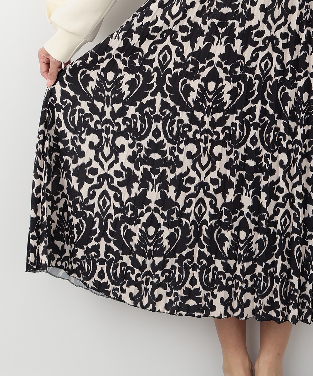 モノトーンのアラベスクプリントが大人びた印象を与えるプリーツスカート。動くたびになだらかに揺れるプリーツ加工が自然な表情感を演出します。スタイリングに取り入れやすいシックなモノトーンがポイント。お手持ちのブラウスやカットソーなど、様々なトップスと相性の良いアイテムです。
