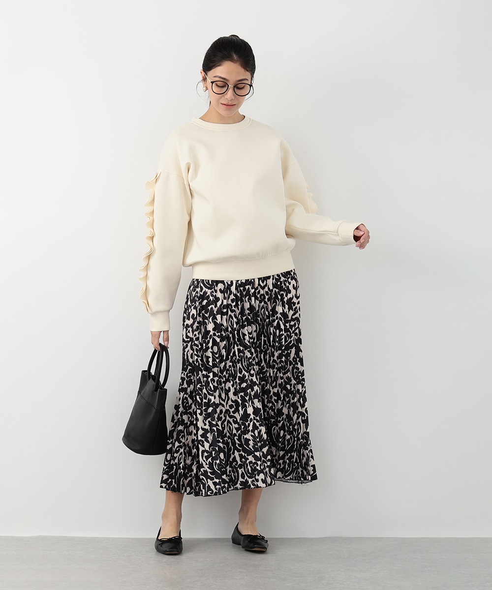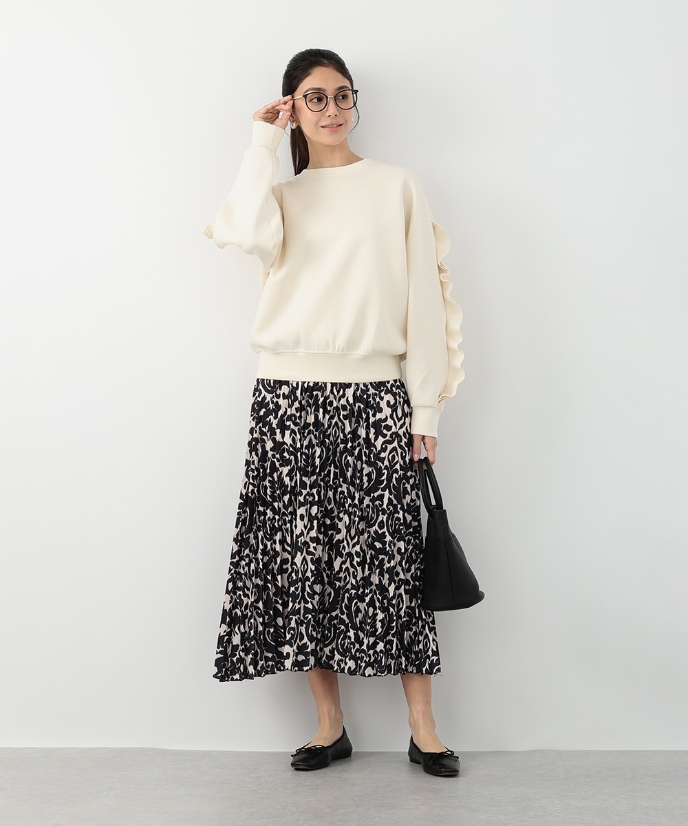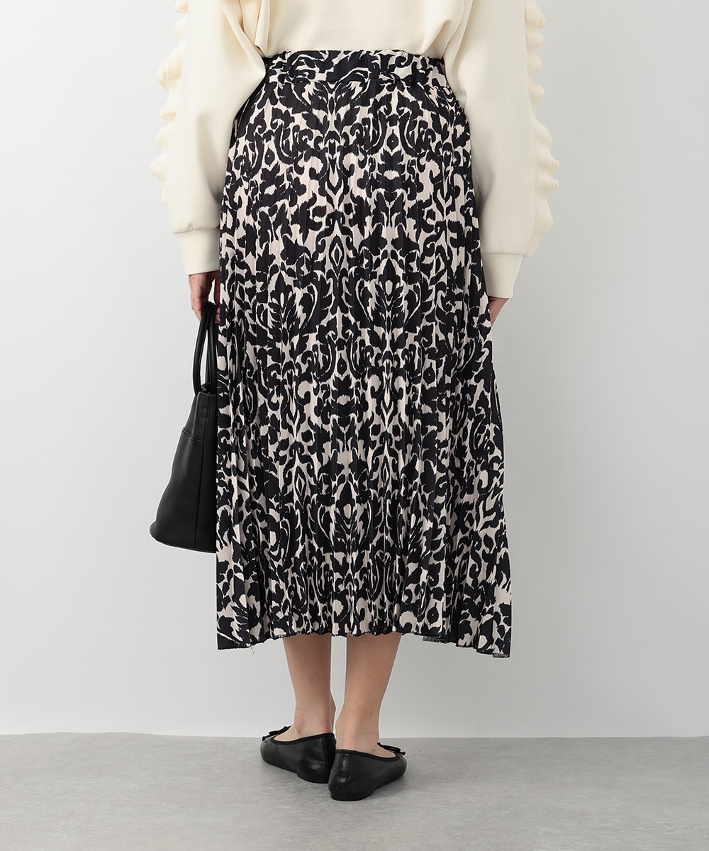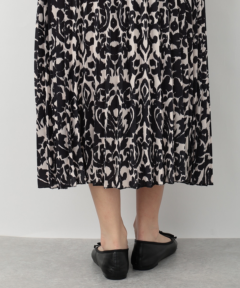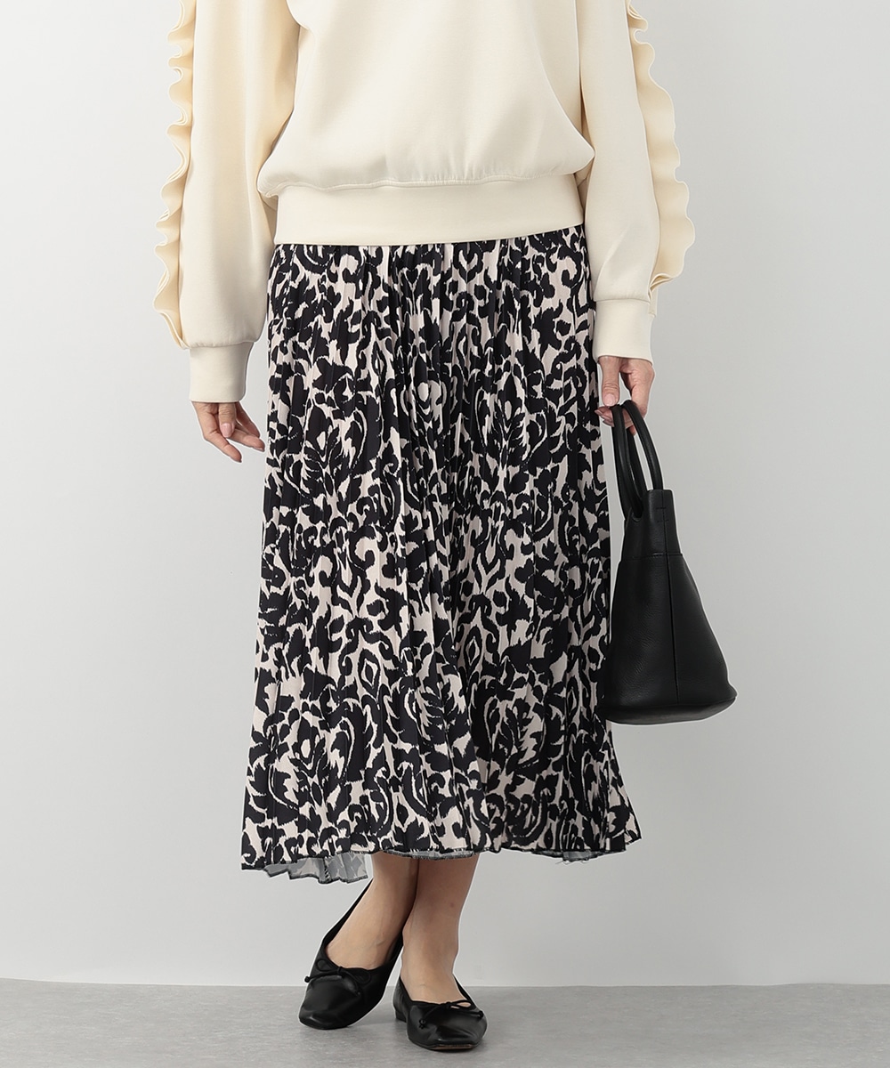 モノトーンのアラベスクプリントが大人びた印象を与えるプリーツスカート。動くたびになだらかに揺れるプリーツ加工が自然な表情感を演出します。スタイリングに取り入れやすいシックなモノトーンがポイント。お手持ちのブラウスやカットソーなど、様々なトップスと相性の良いアイテムです。