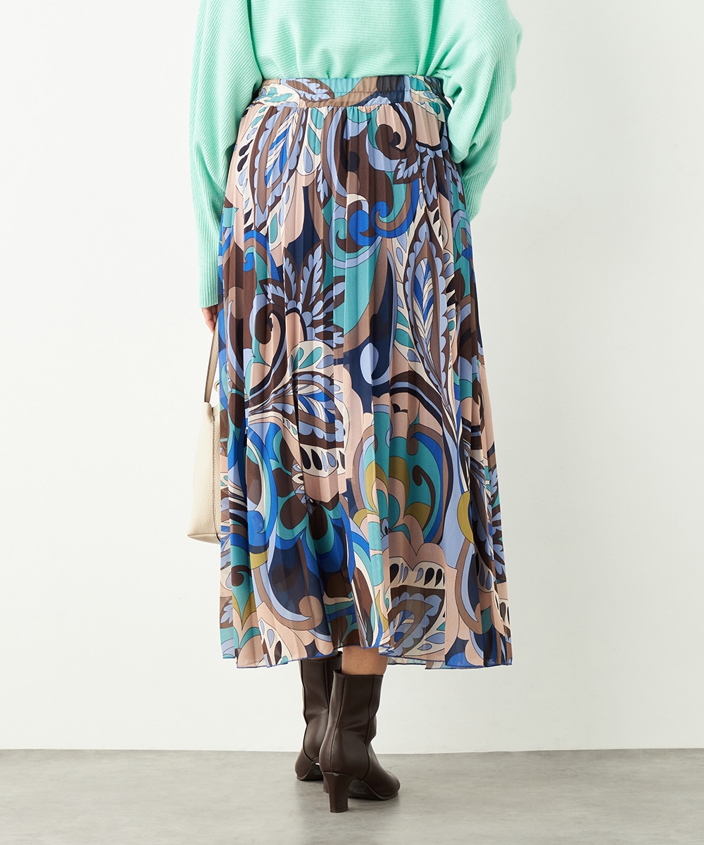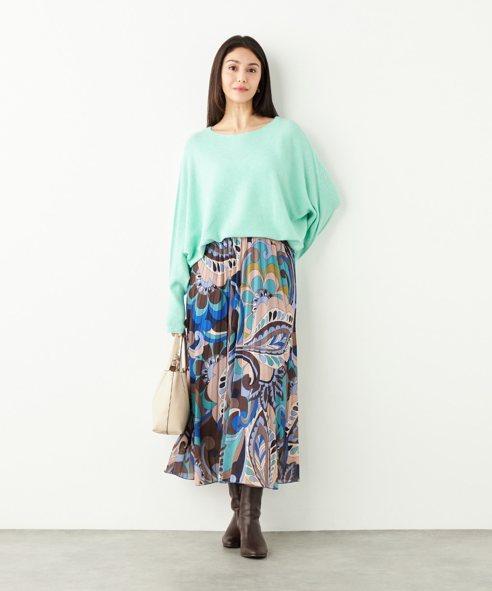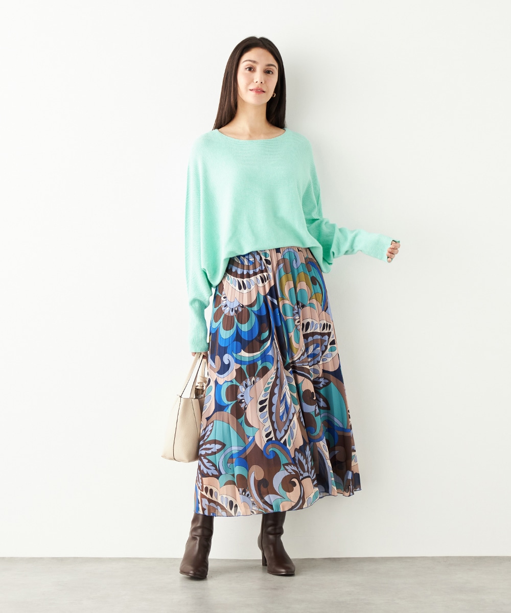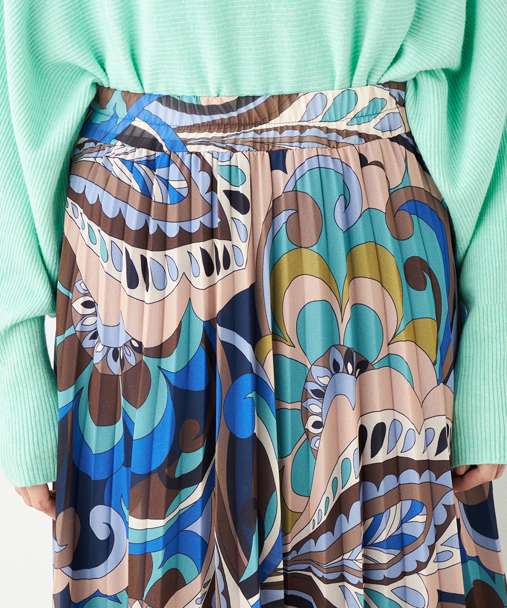 寒色系の大人っぽくクールなカラーリングでまとめています。細かなプリーツが施され、動いた際の揺れ感がエレガントな印象です。生地の繊細な風合いも魅力。上品に穿きこなせる長めの着丈です。ウエストは総ゴム仕様でフィット感良く着用できます。新色の春ニットと合わせるのもおすすめです。