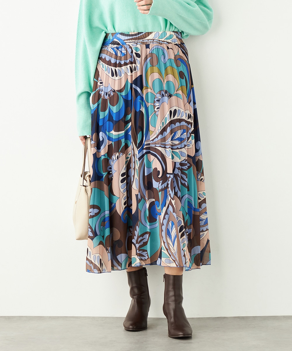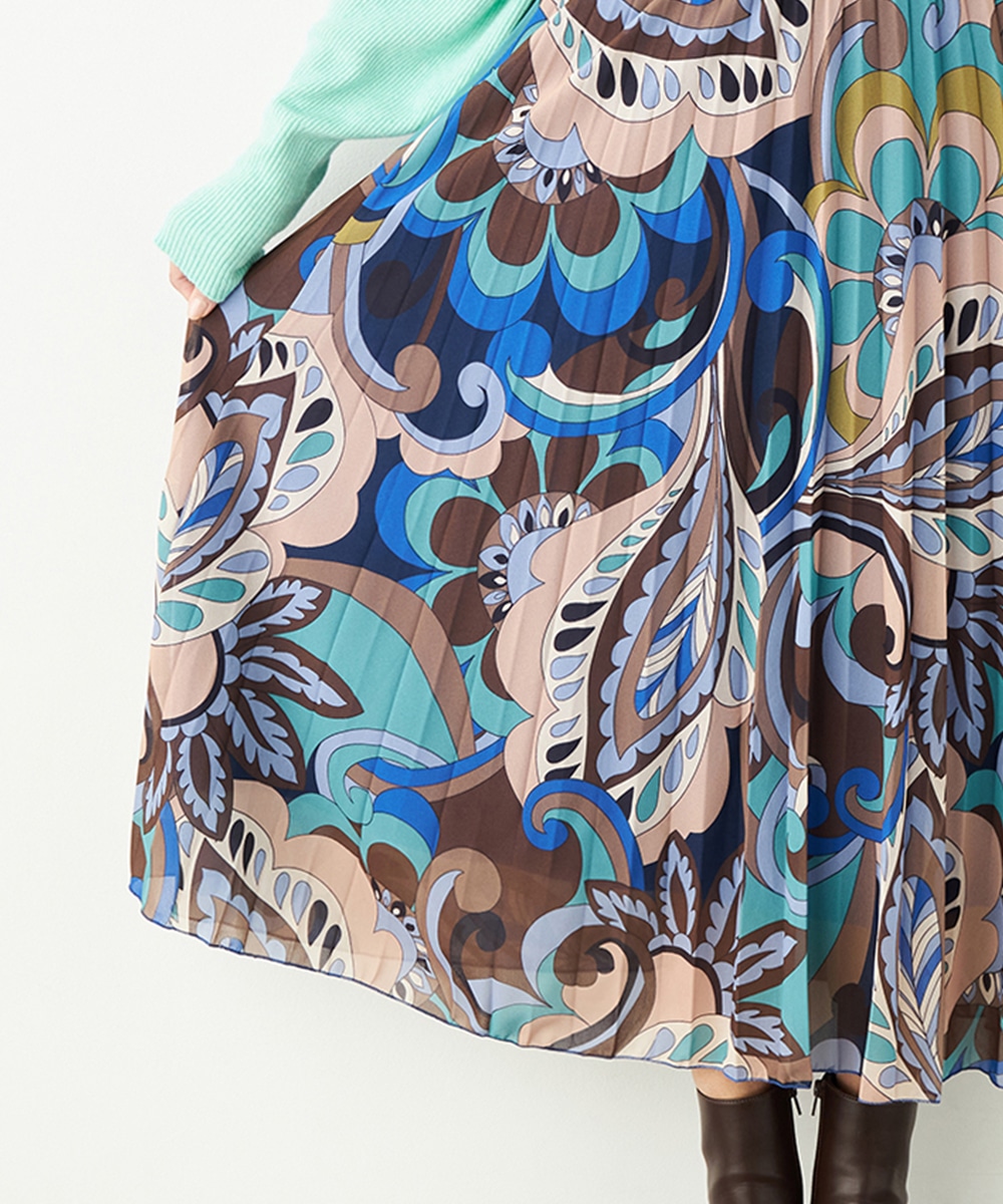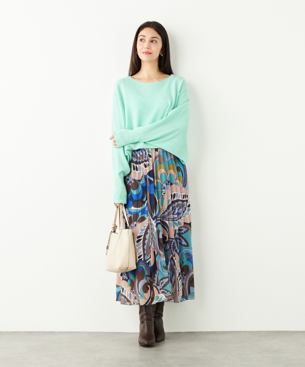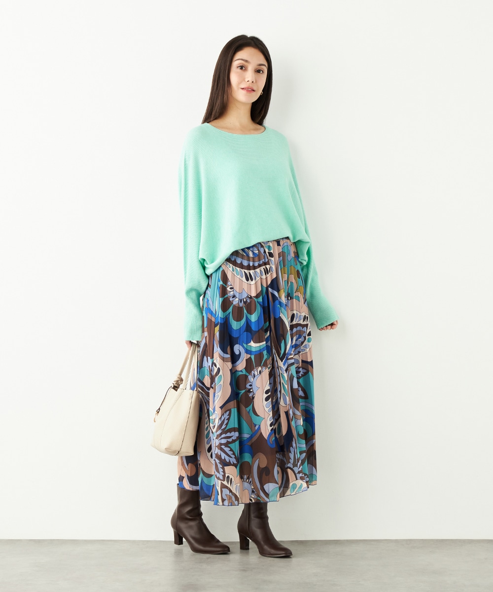 寒色系の大人っぽくクールなカラーリングでまとめています。細かなプリーツが施され、動いた際の揺れ感がエレガントな印象です。生地の繊細な風合いも魅力。上品に穿きこなせる長めの着丈です。ウエストは総ゴム仕様でフィット感良く着用できます。新色の春ニットと合わせるのもおすすめです。