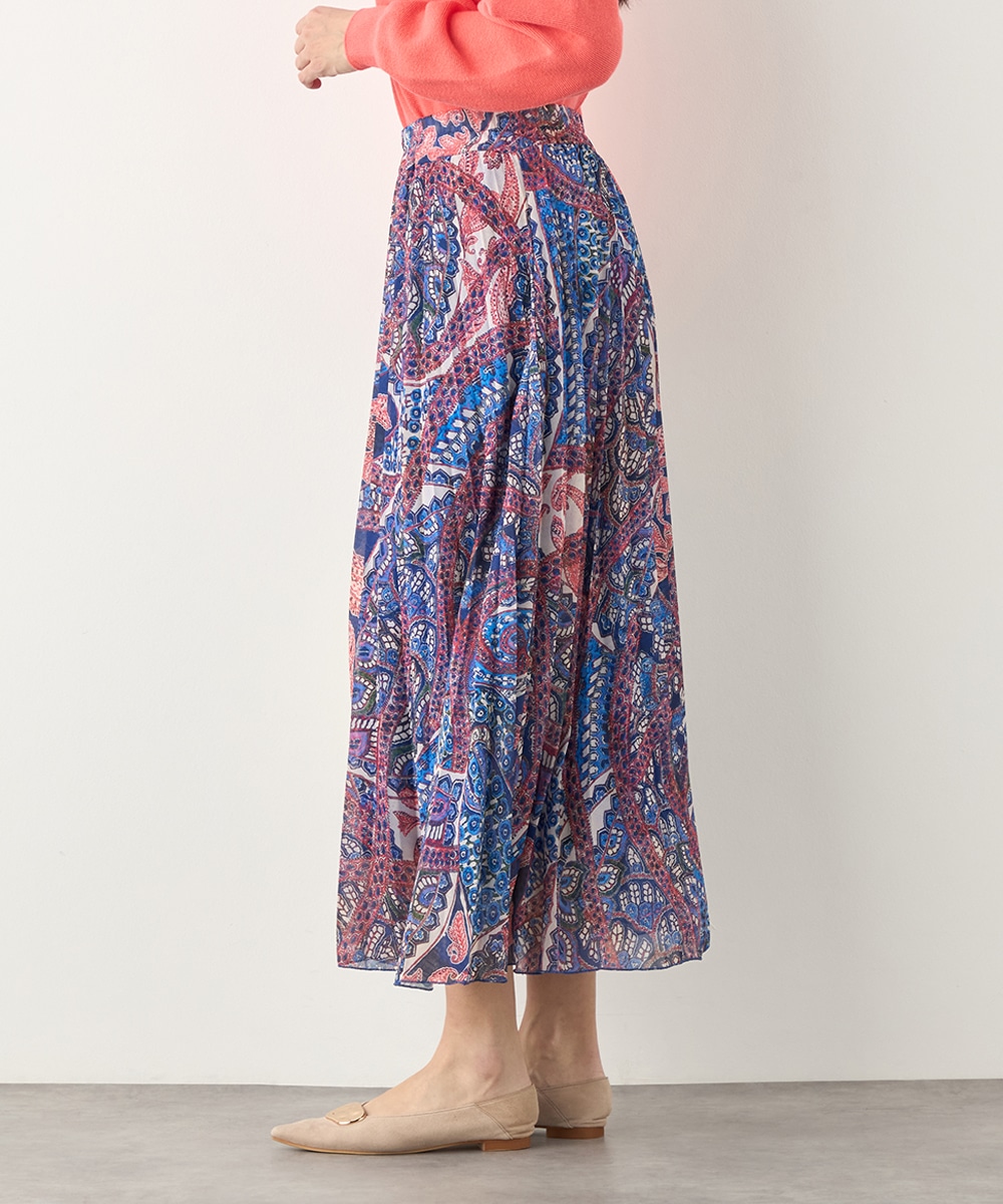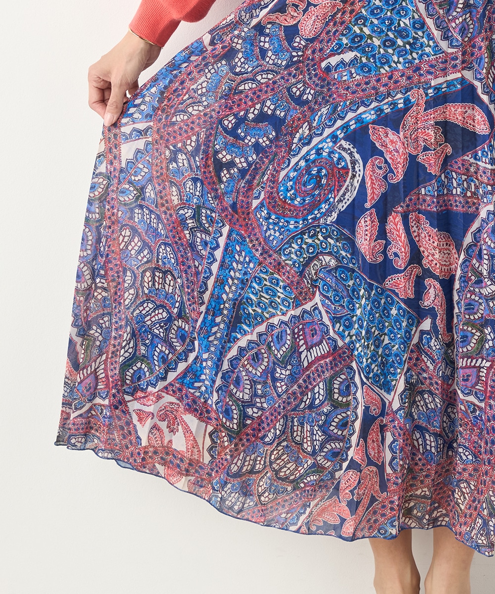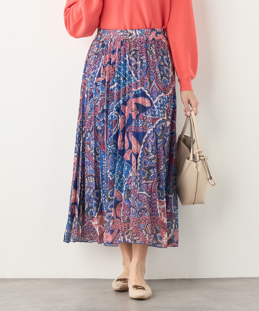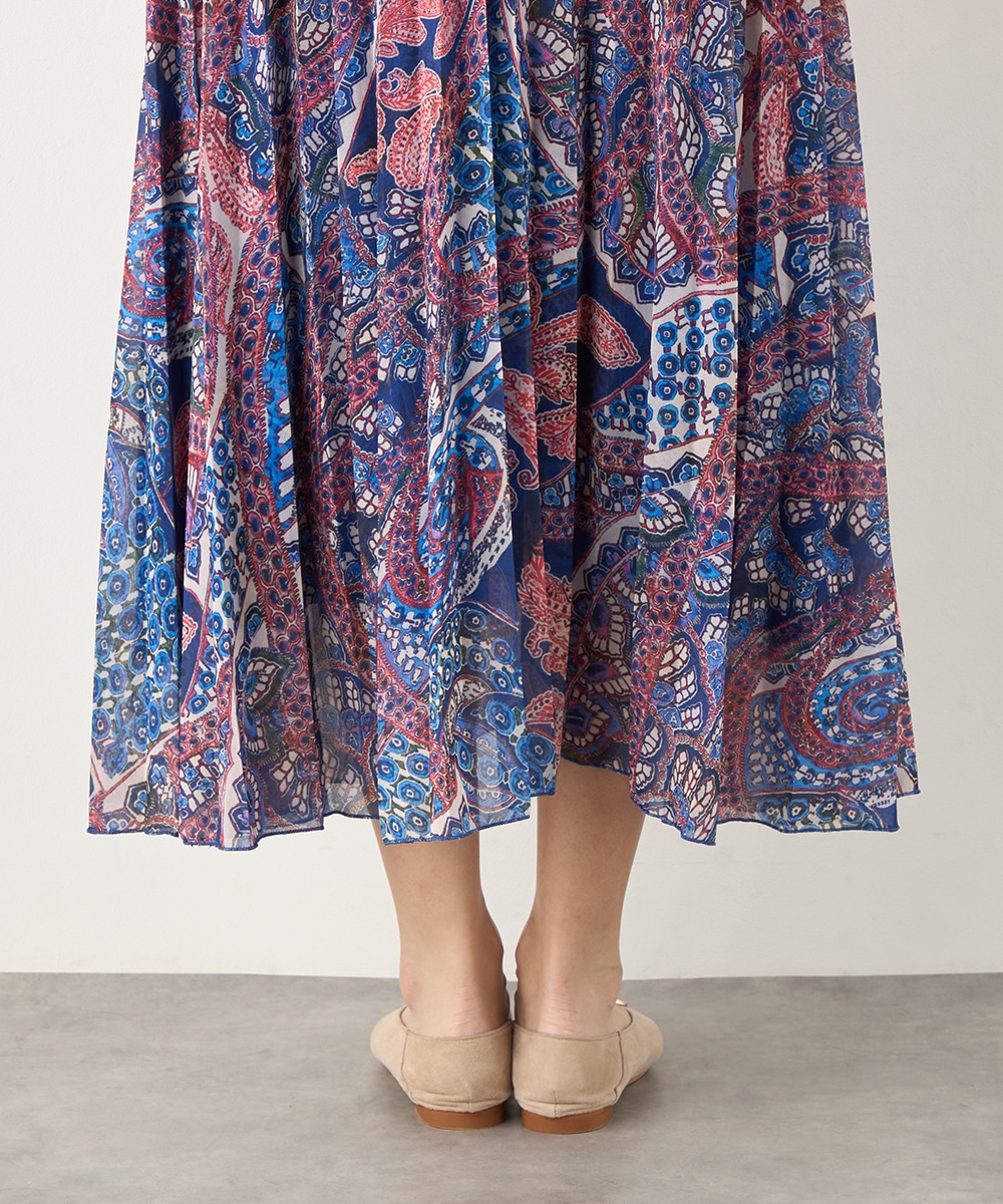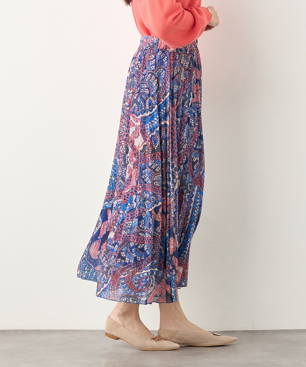 エスニックな雰囲気のタッチでボタニカル柄をデザインしています。細かなプリーツを施したことでエレガントさが増しているのもポイント。生地は薄手で繊細な透け感が見られ、女性らしさを印象付けます。上品に穿きこなせる長めの着丈です。ウエストはゴムが入ってフィット感良く着用できます。