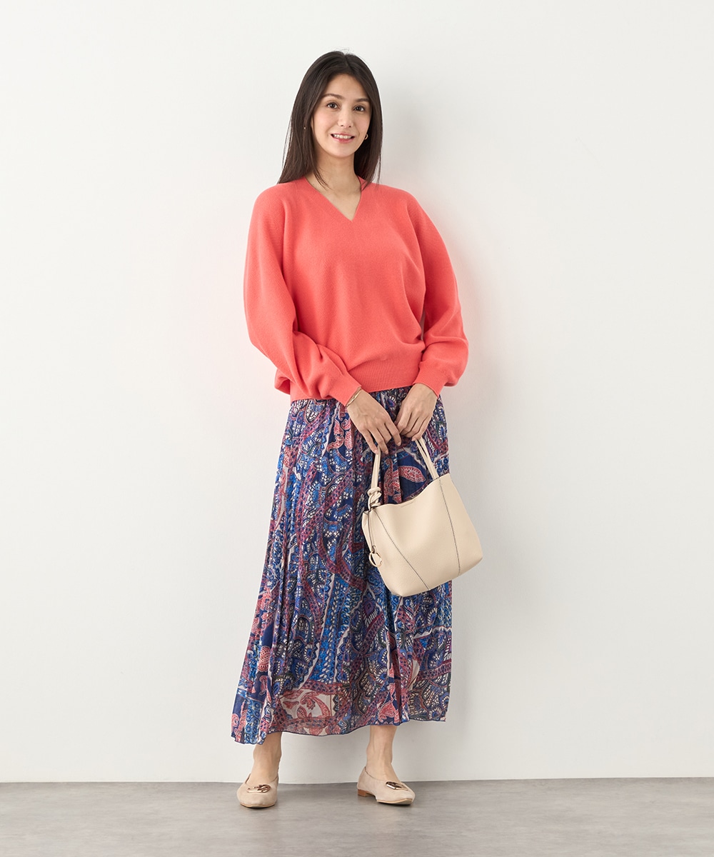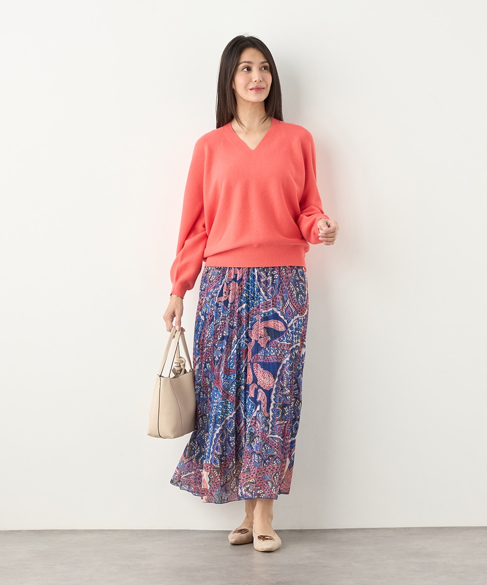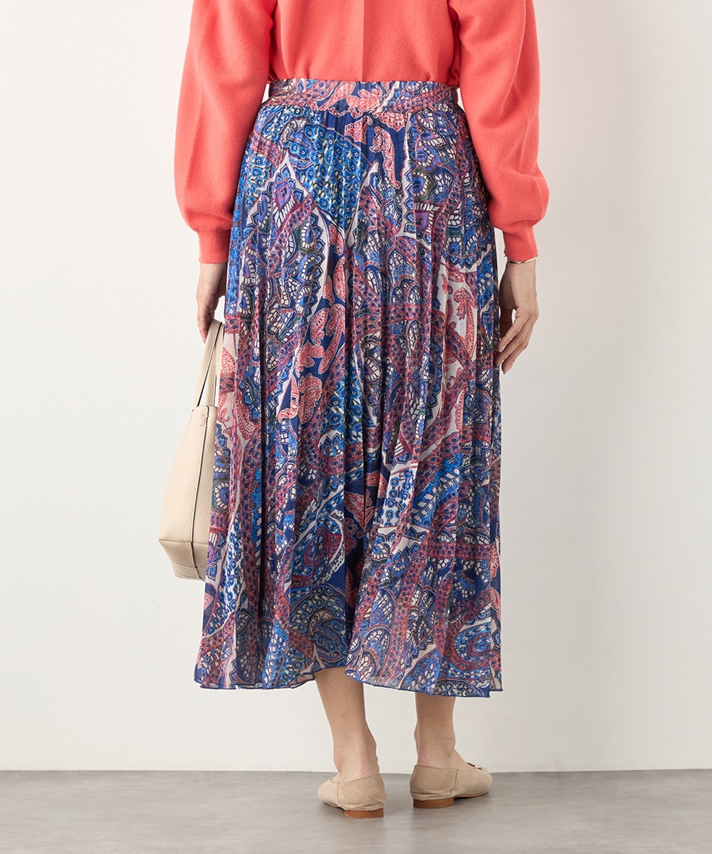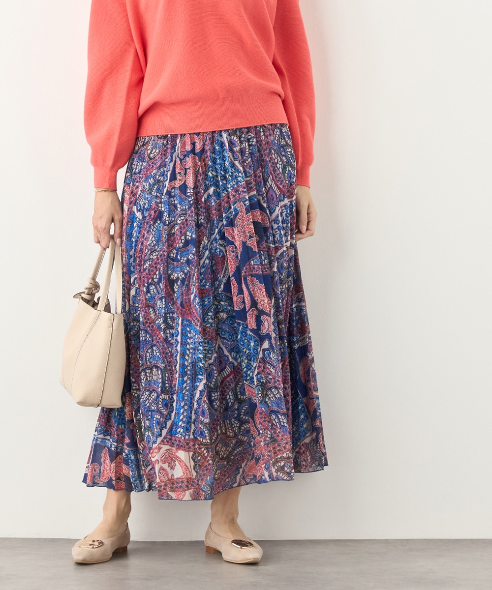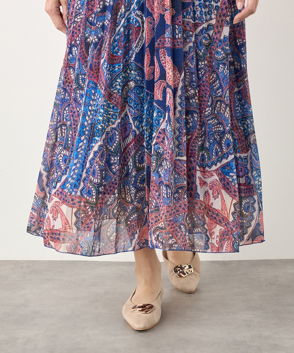 エスニックな雰囲気のタッチでボタニカル柄をデザインしています。細かなプリーツを施したことでエレガントさが増しているのもポイント。生地は薄手で繊細な透け感が見られ、女性らしさを印象付けます。上品に穿きこなせる長めの着丈です。ウエストはゴムが入ってフィット感良く着用できます。