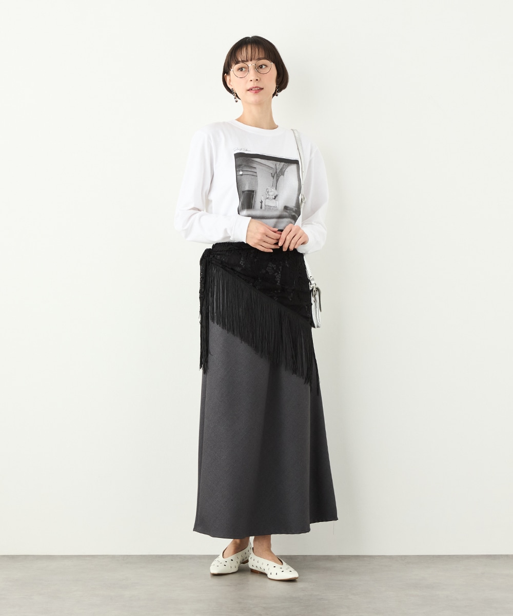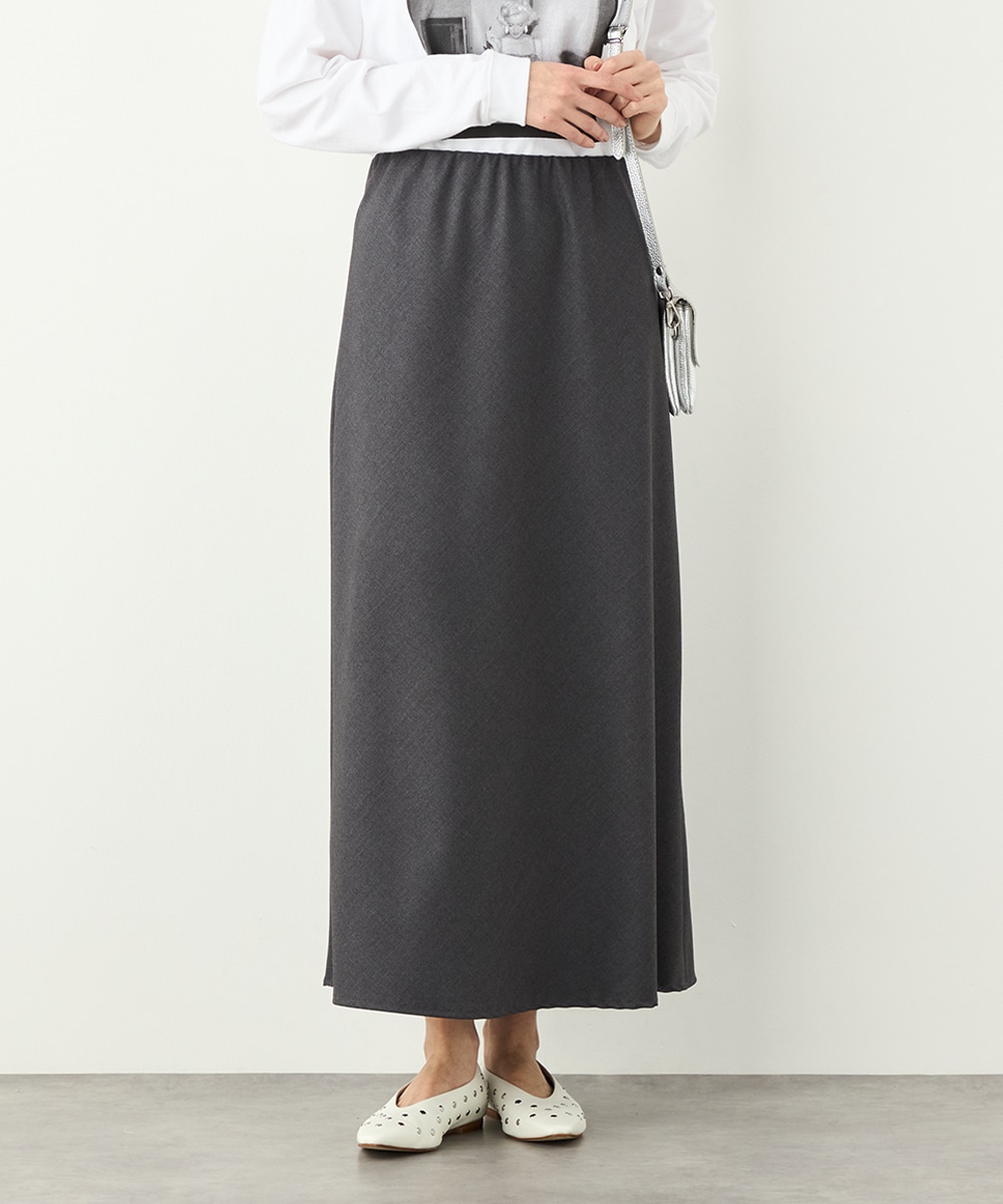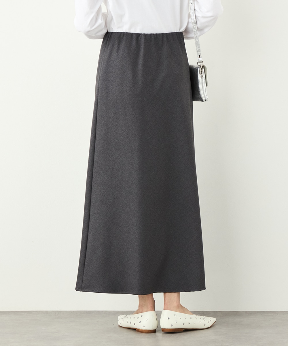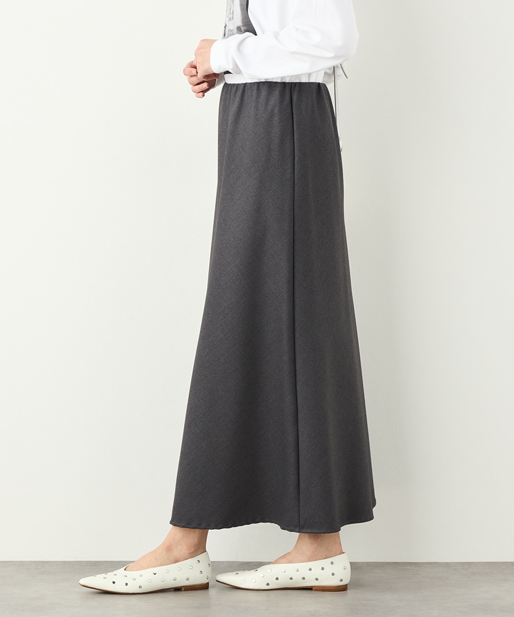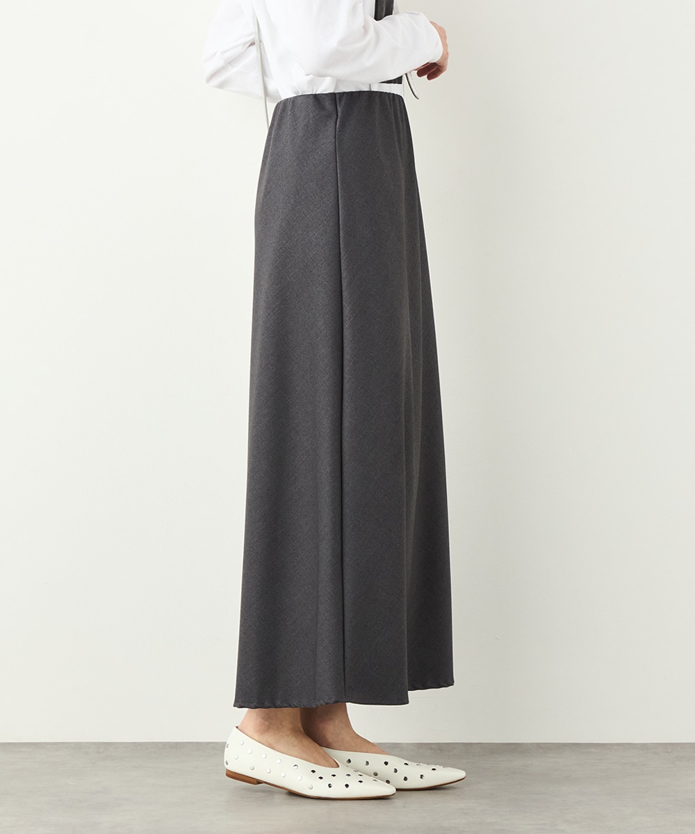広がりすぎない適度なフレア感とロング丈が大人っぽくエレガントな印象のコーディネートに導きます。ソフトな肌触りのカットソー素材にゴム仕様のウエストで穿き心地も快適です。付属のストールは三角形のシルエットで、シンプルに腰に巻くだけでもバランス良く決まります。