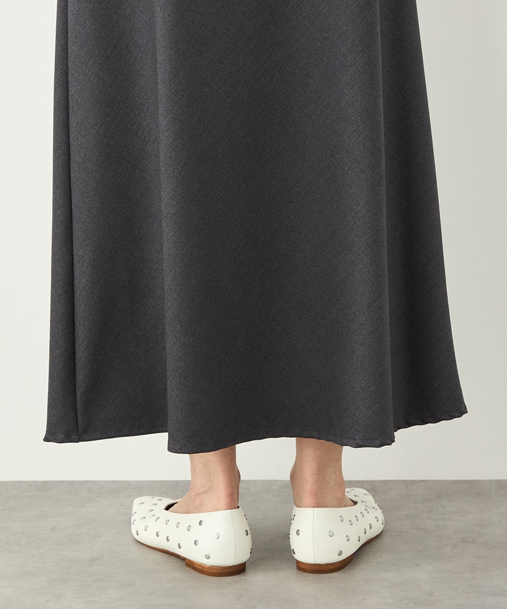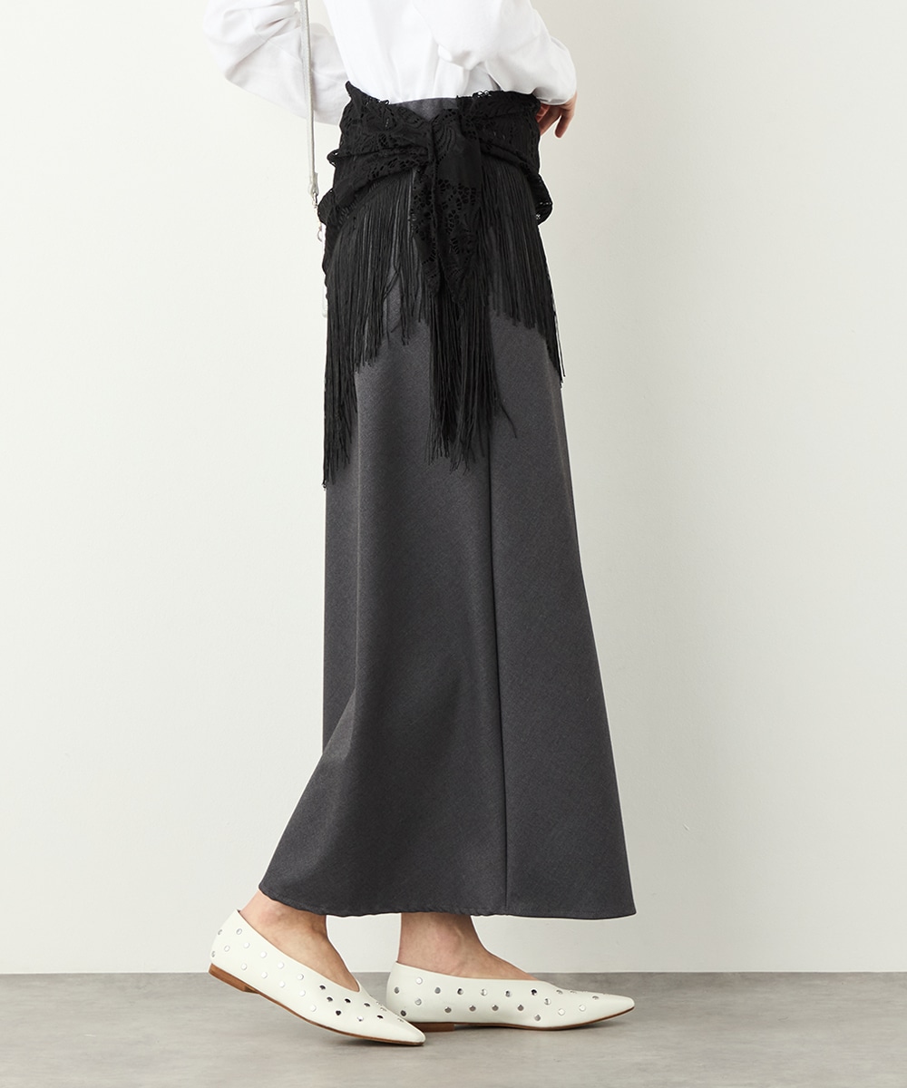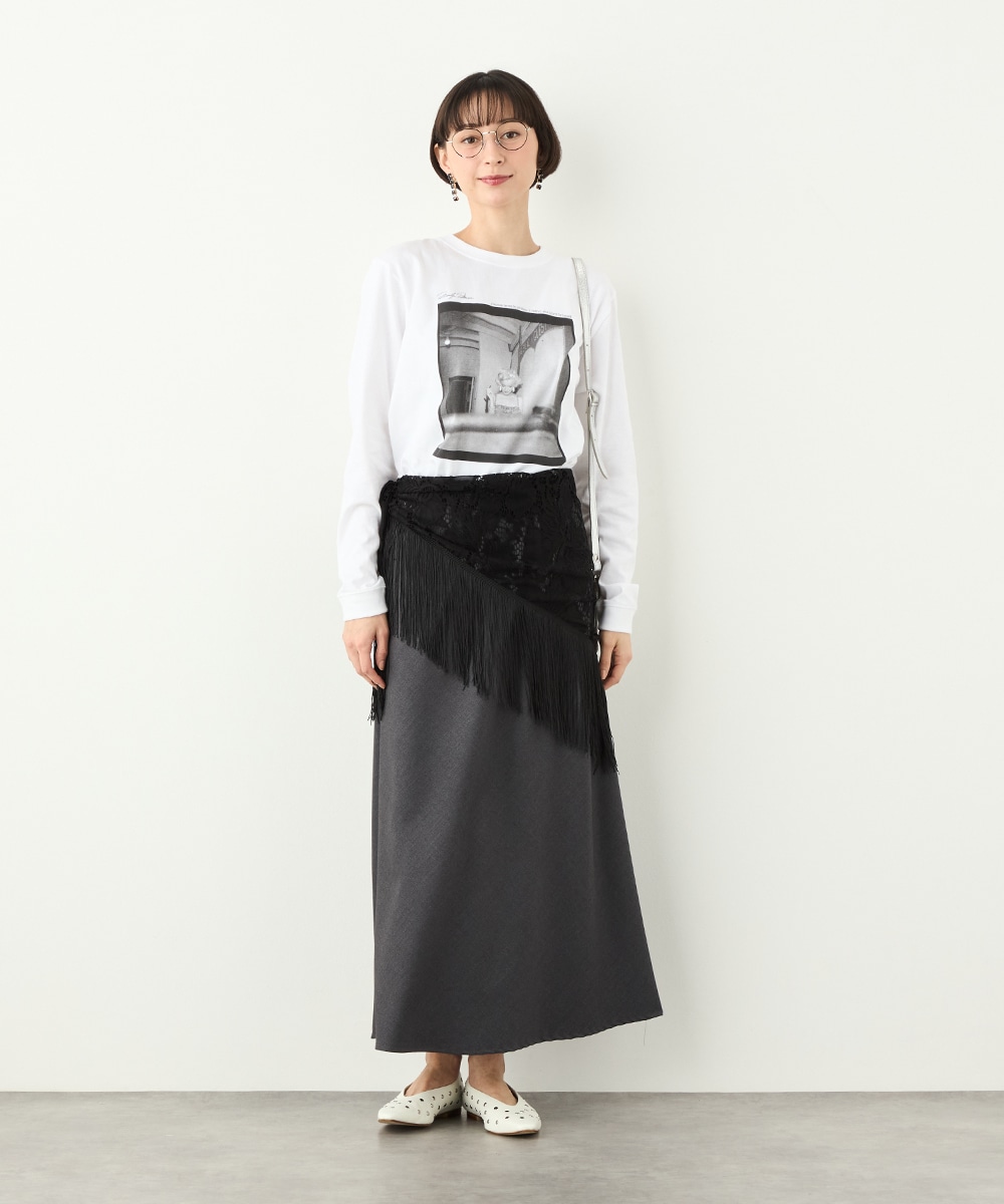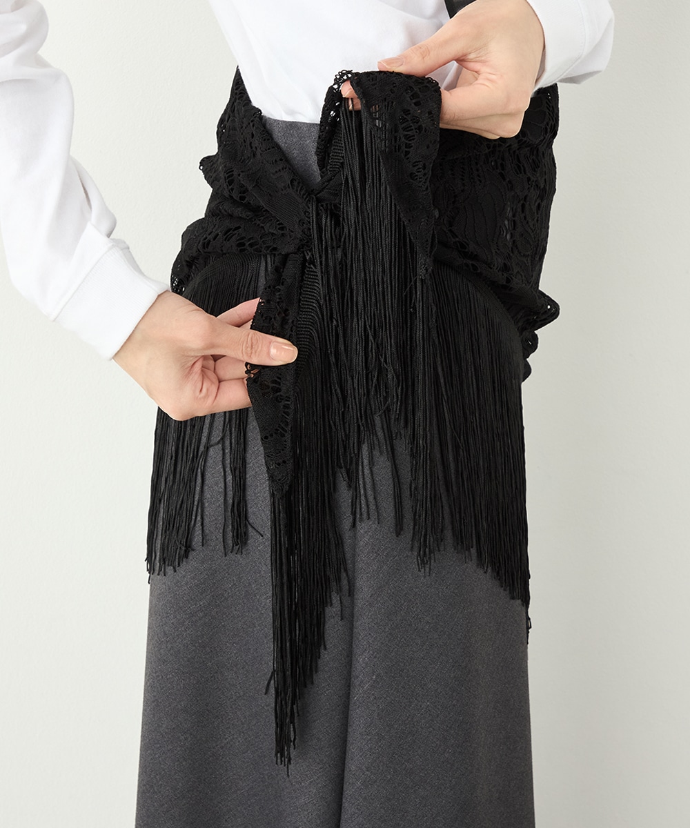 広がりすぎない適度なフレア感とロング丈が大人っぽくエレガントな印象のコーディネートに導きます。ソフトな肌触りのカットソー素材にゴム仕様のウエストで穿き心地も快適です。付属のストールは三角形のシルエットで、シンプルに腰に巻くだけでもバランス良く決まります。