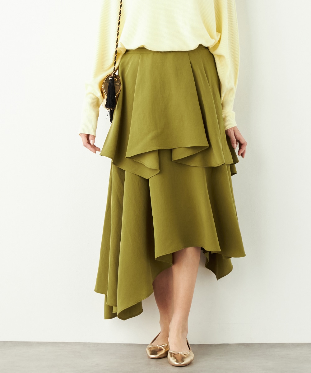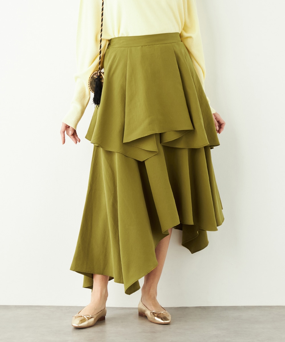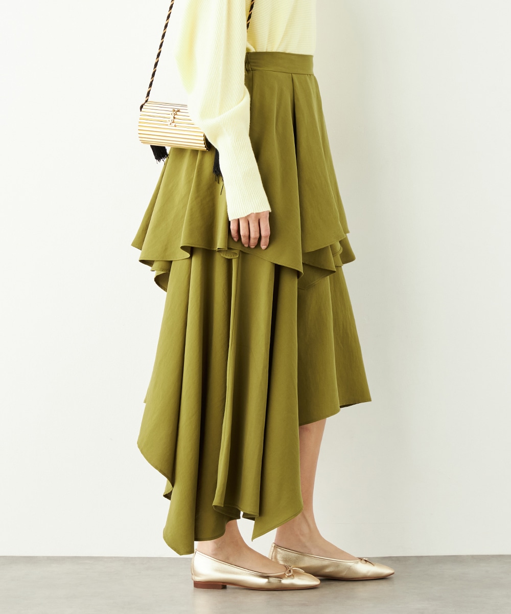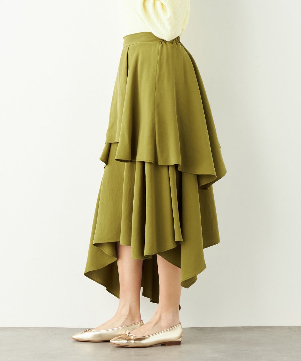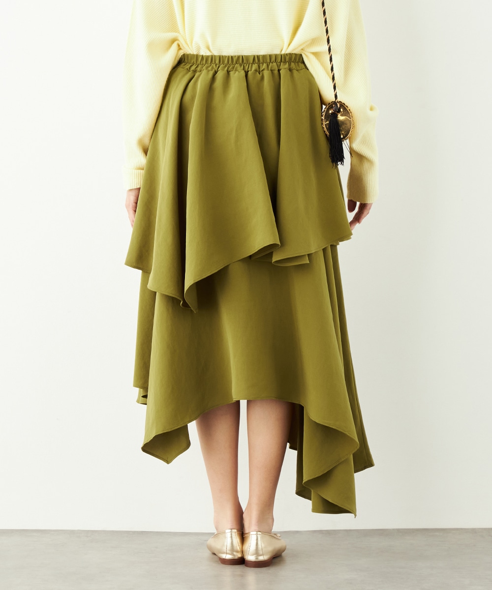 ガーリーなティアードデザインとアシンメトリーなヘムとのコンビネーションが新鮮な印象です。ベーシックな無地ながらも個性が感じられるアイテム。着丈は長めに仕上がり、上品さも併せ持ちます。後ろウエストにはゴムが入り、フィット感良く着用できるのも魅力です。