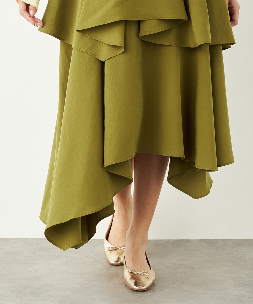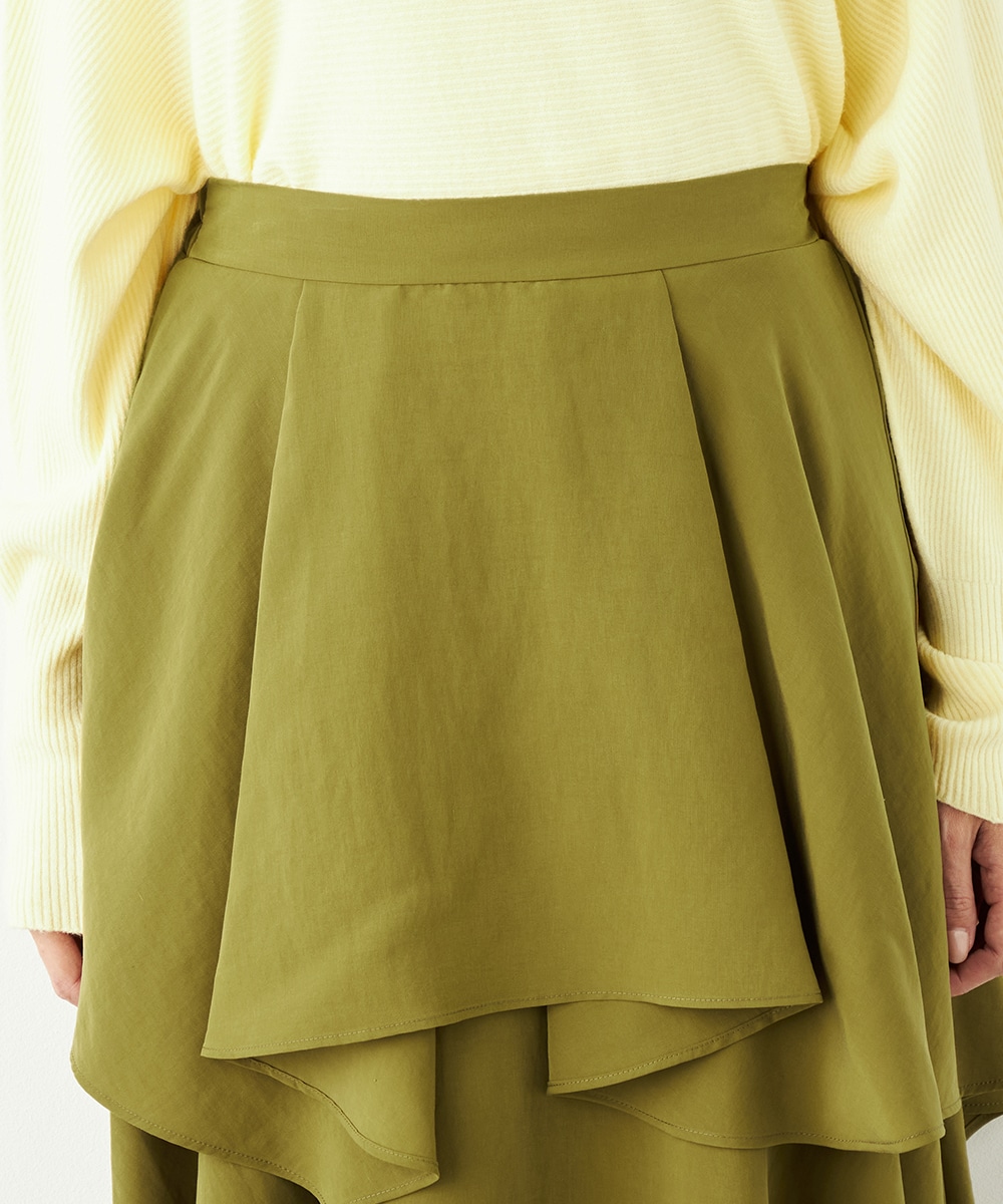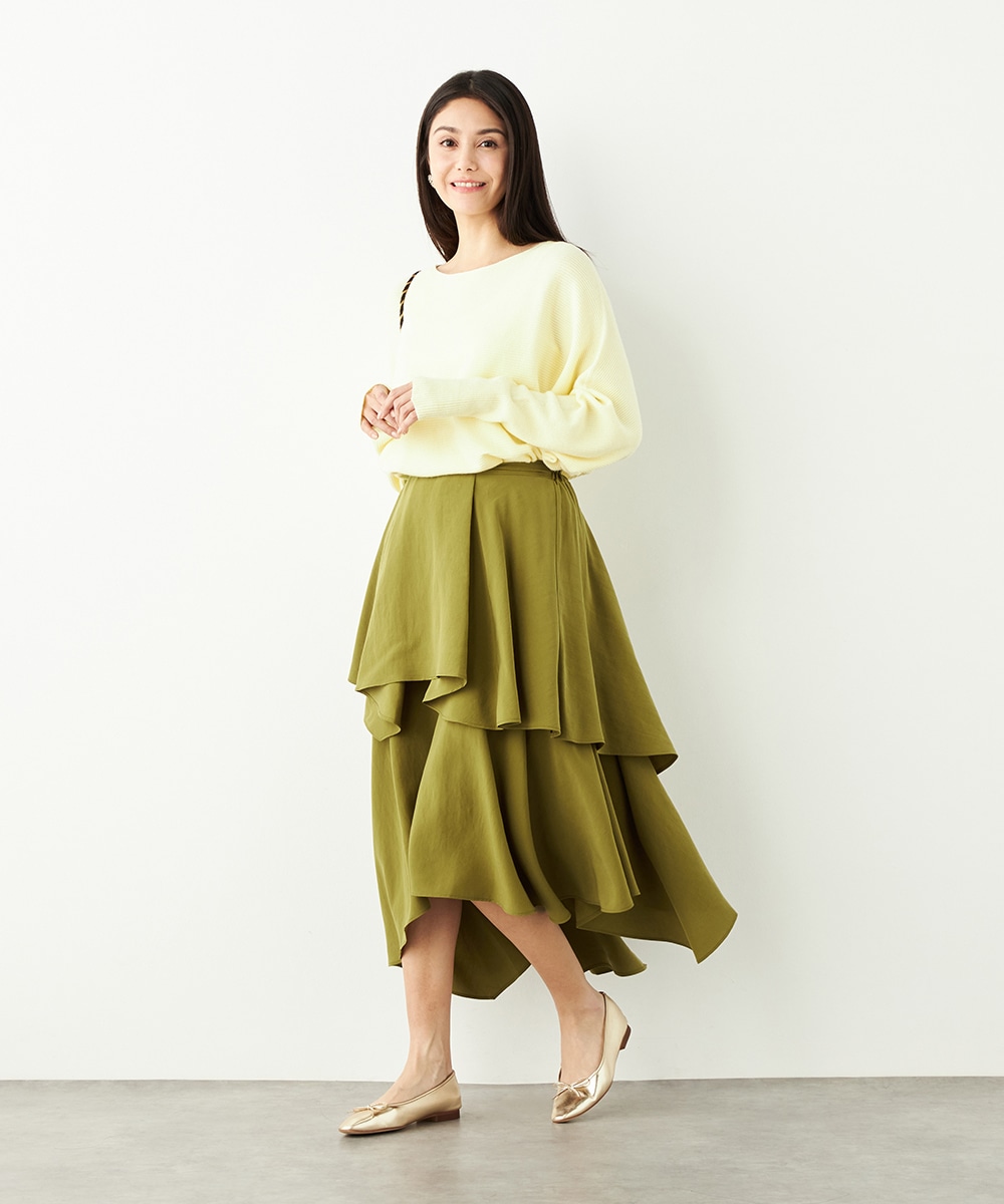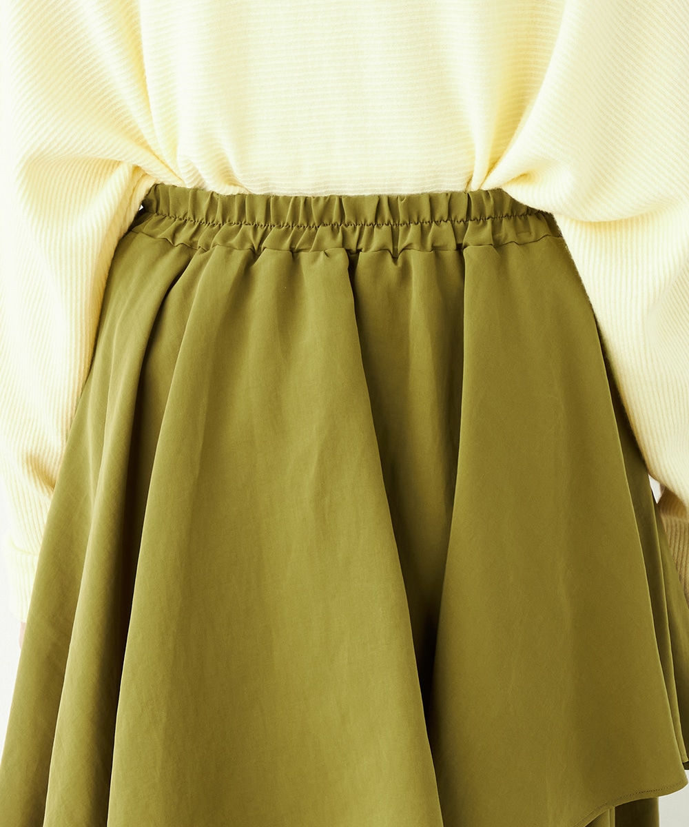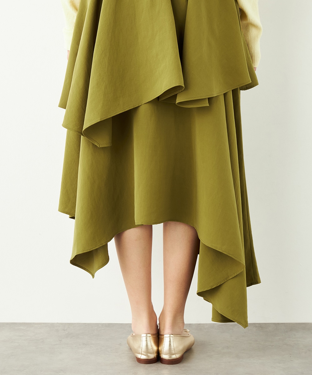 ガーリーなティアードデザインとアシンメトリーなヘムとのコンビネーションが新鮮な印象です。ベーシックな無地ながらも個性が感じられるアイテム。着丈は長めに仕上がり、上品さも併せ持ちます。後ろウエストにはゴムが入り、フィット感良く着用できるのも魅力です。