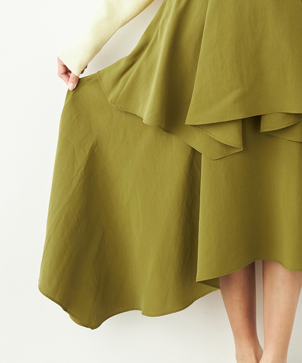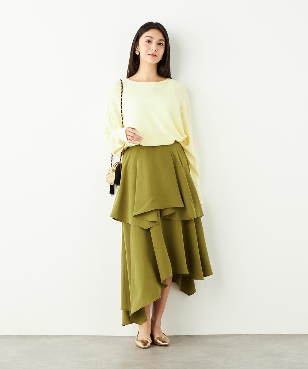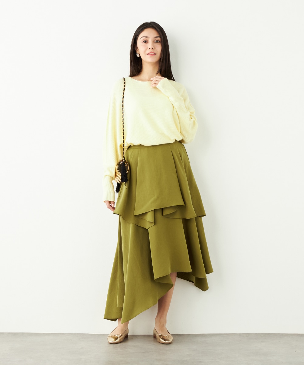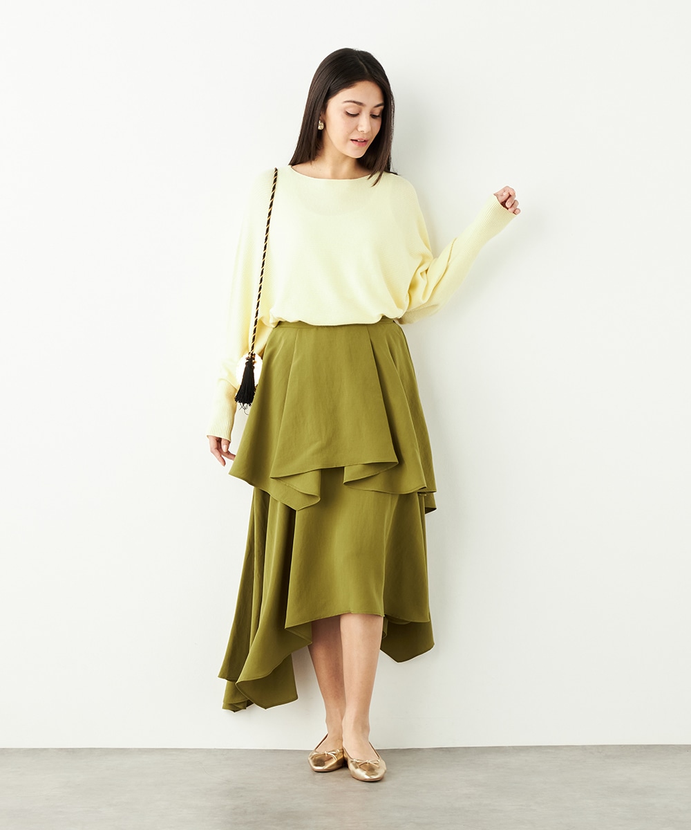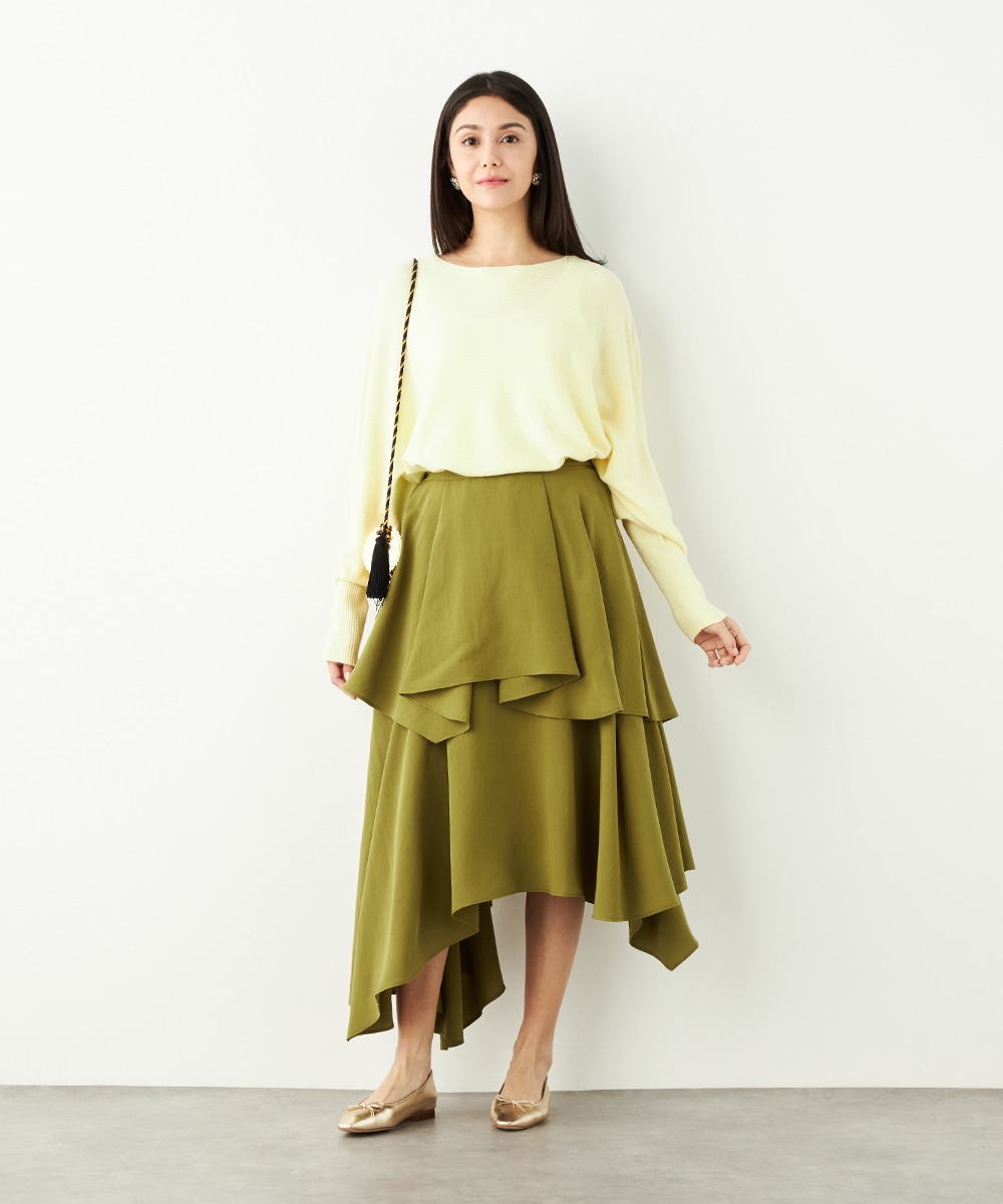 ガーリーなティアードデザインとアシンメトリーなヘムとのコンビネーションが新鮮な印象です。ベーシックな無地ながらも個性が感じられるアイテム。着丈は長めに仕上がり、上品さも併せ持ちます。後ろウエストにはゴムが入り、フィット感良く着用できるのも魅力です。