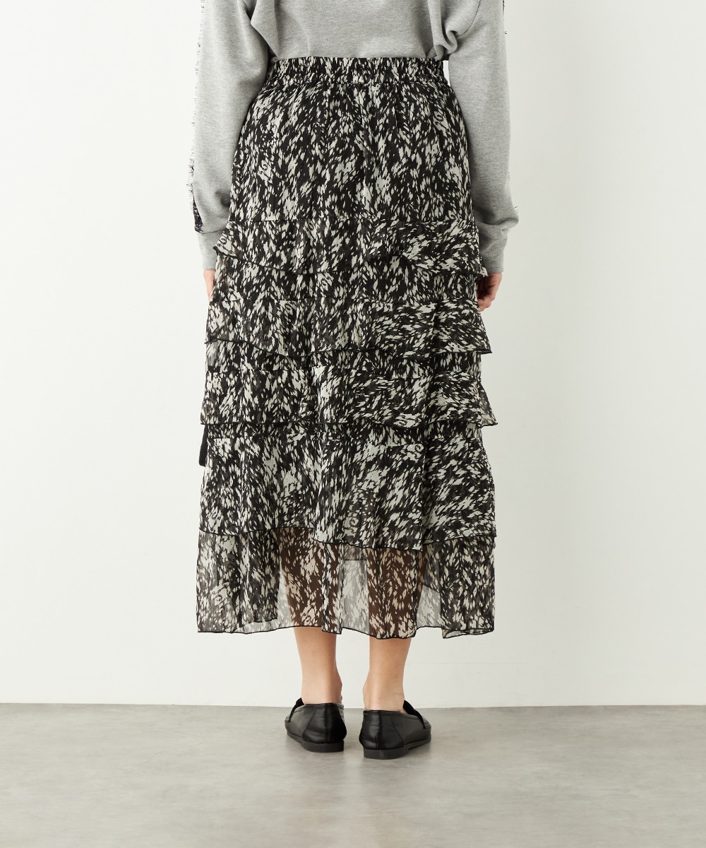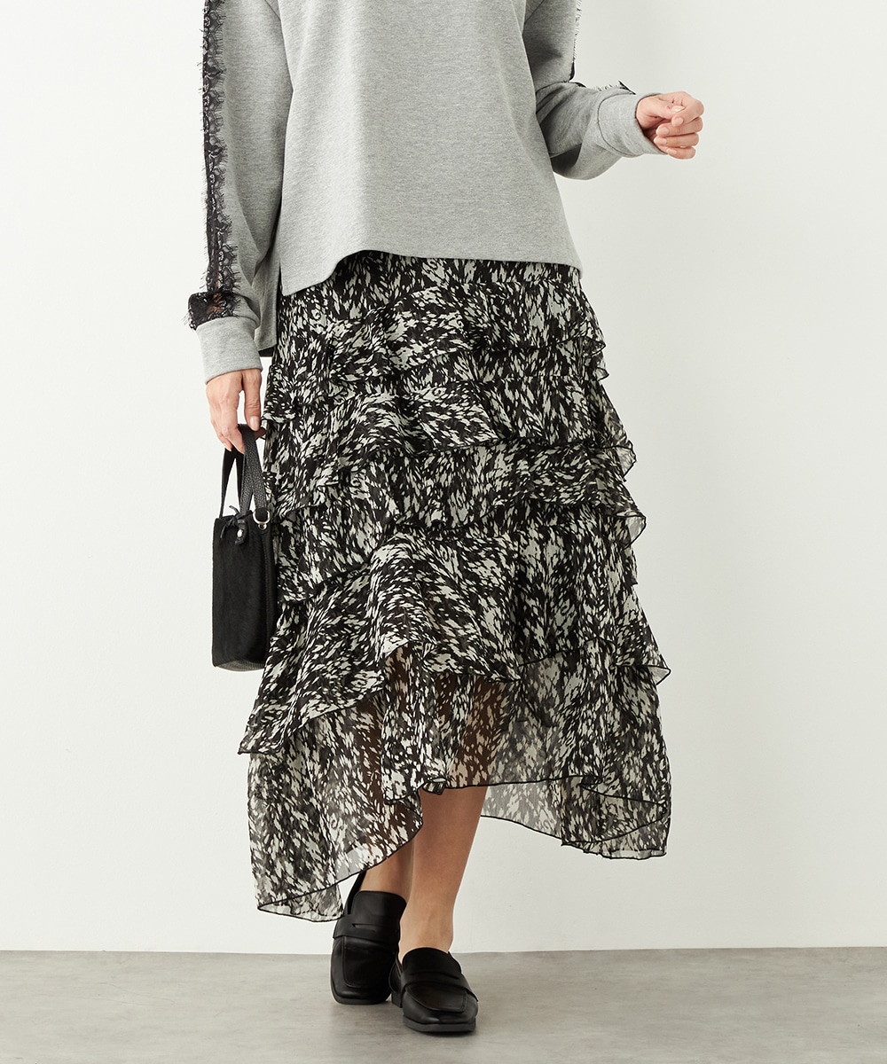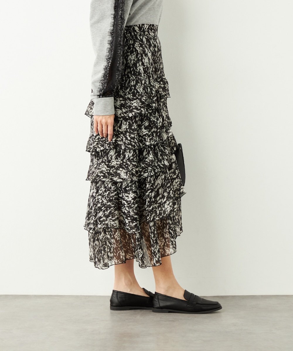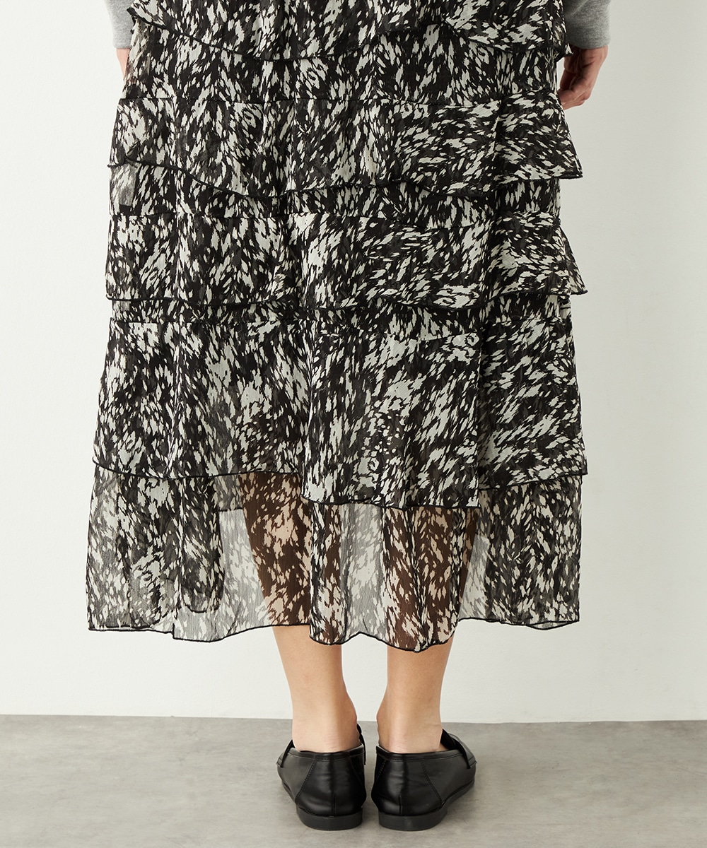 抽象的な柄やモノトーンカラーがシックな印象です。ボリュームのあるティアード切り替えながらも、甘くなりすぎず大人可愛く穿きこなせます。生地の繊細な透け感も魅力です。コーディネートが品良くまとまる長めの着丈を採用。後ろウエストにはゴムが入り、フィット感も快適です。