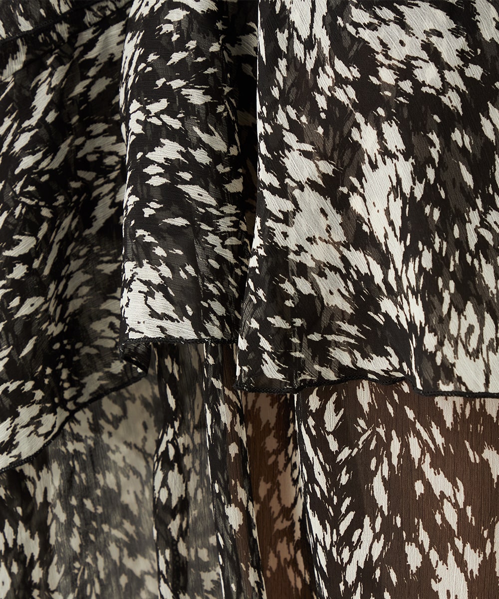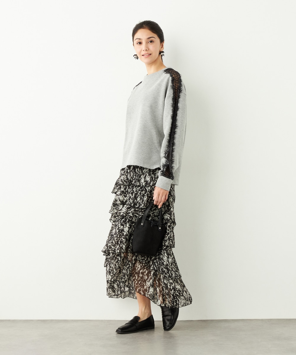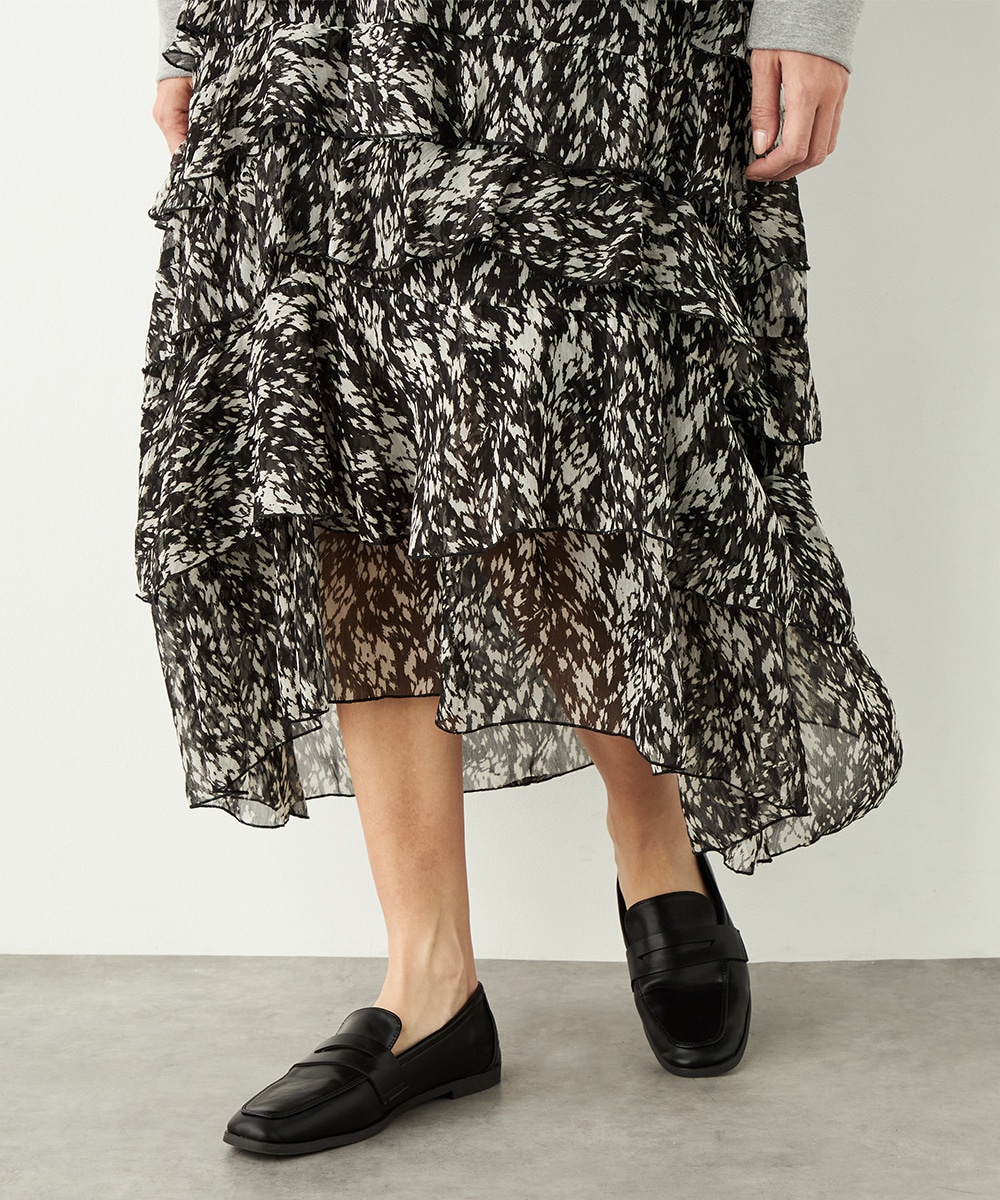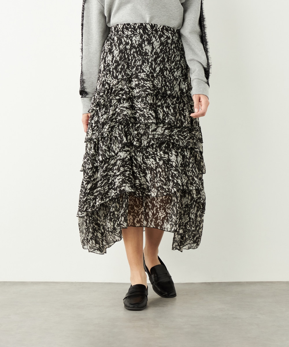 抽象的な柄やモノトーンカラーがシックな印象です。ボリュームのあるティアード切り替えながらも、甘くなりすぎず大人可愛く穿きこなせます。生地の繊細な透け感も魅力です。コーディネートが品良くまとまる長めの着丈を採用。後ろウエストにはゴムが入り、フィット感も快適です。