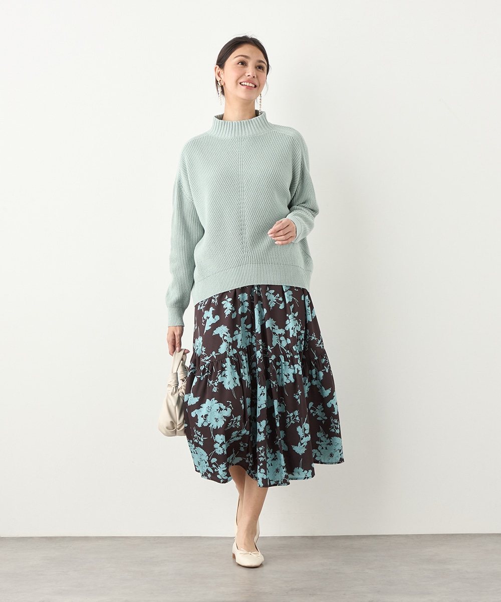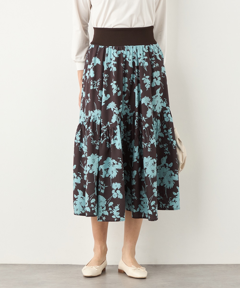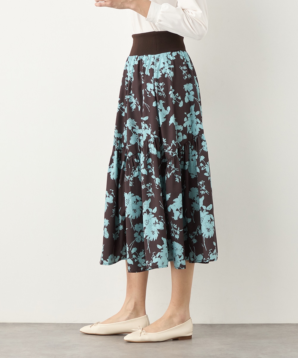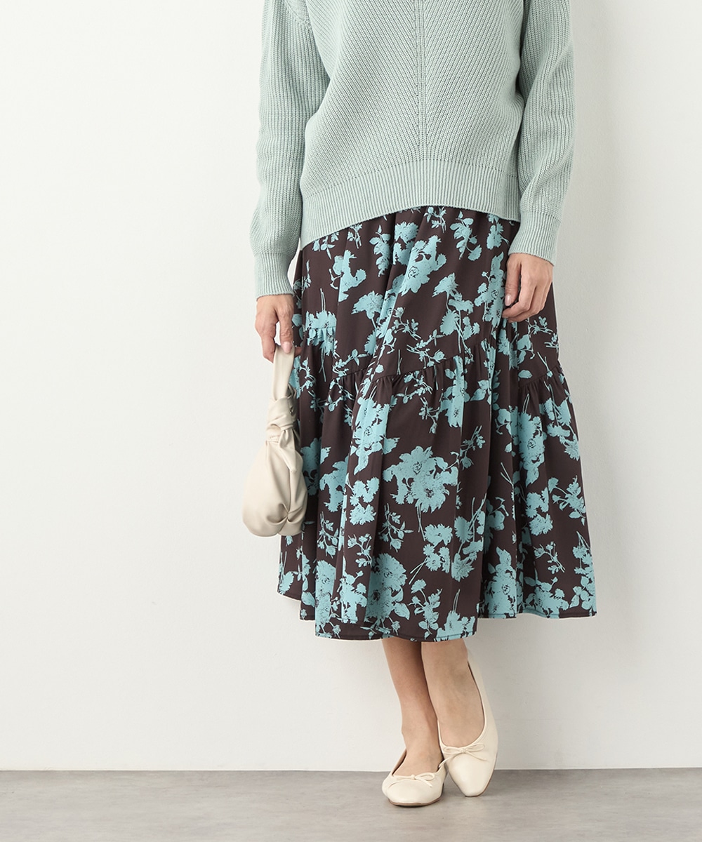 ほどよいボリュームのフラワーが上品な存在感を発揮しています。ふんわり感が愛らしい印象のティアードシルエット。切り替えを斜めにしているのもこだわりのポイントです。ウエストは太幅のリブ地を採用しており、スタイルのメリハリが強調されます。エレガントに穿ける長めの着丈です。