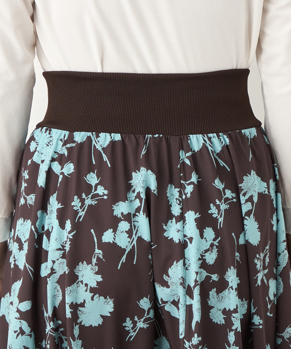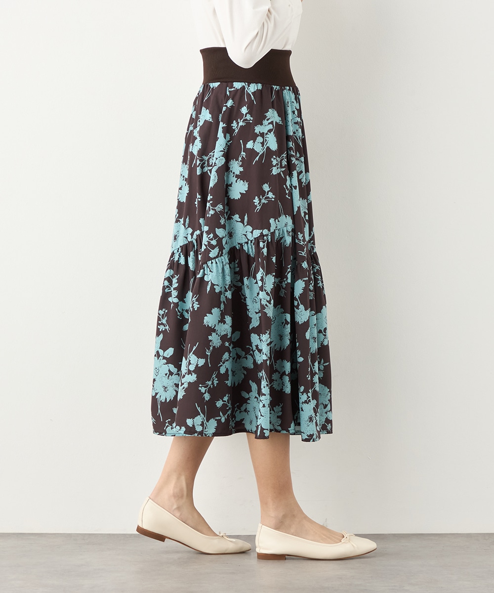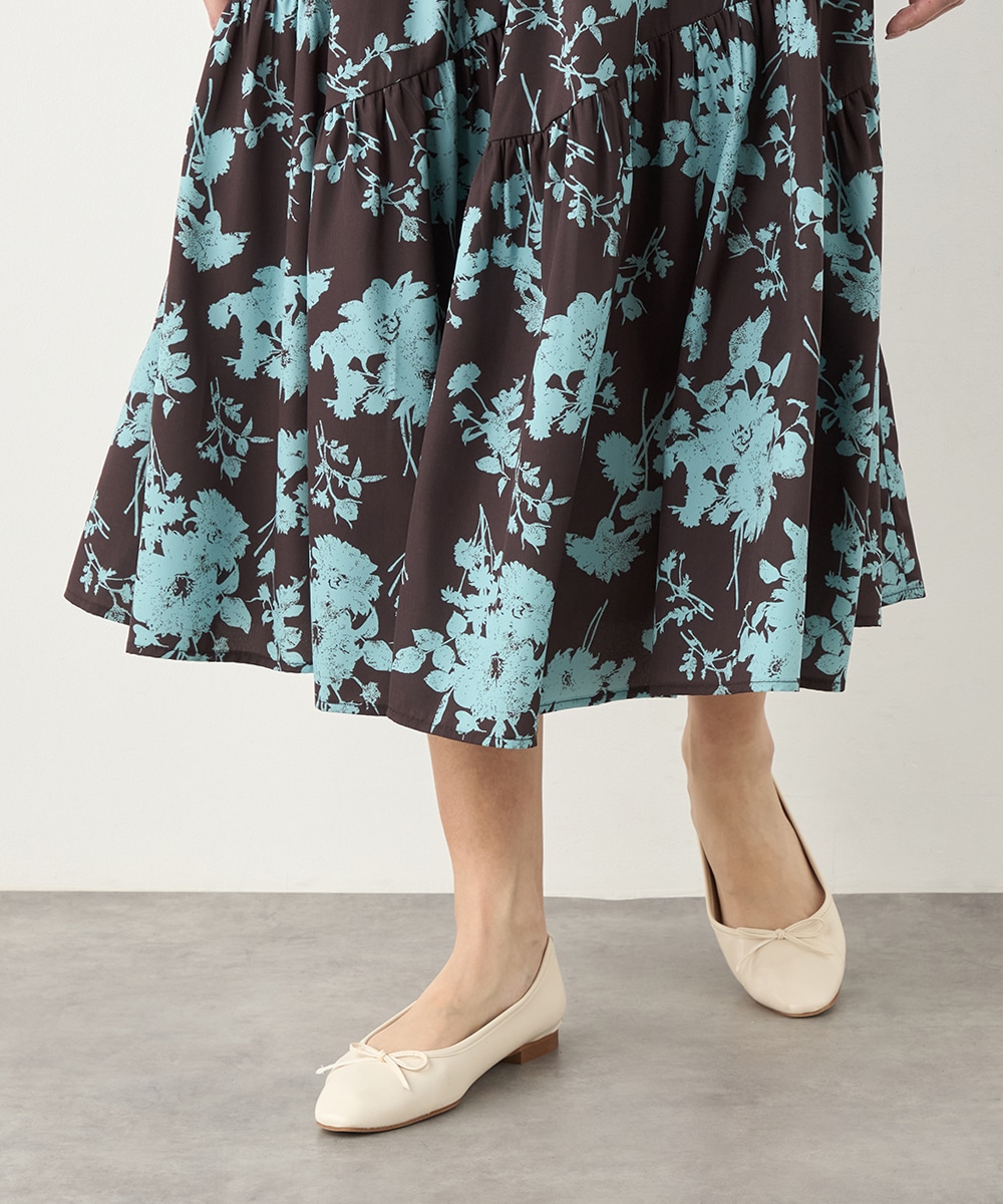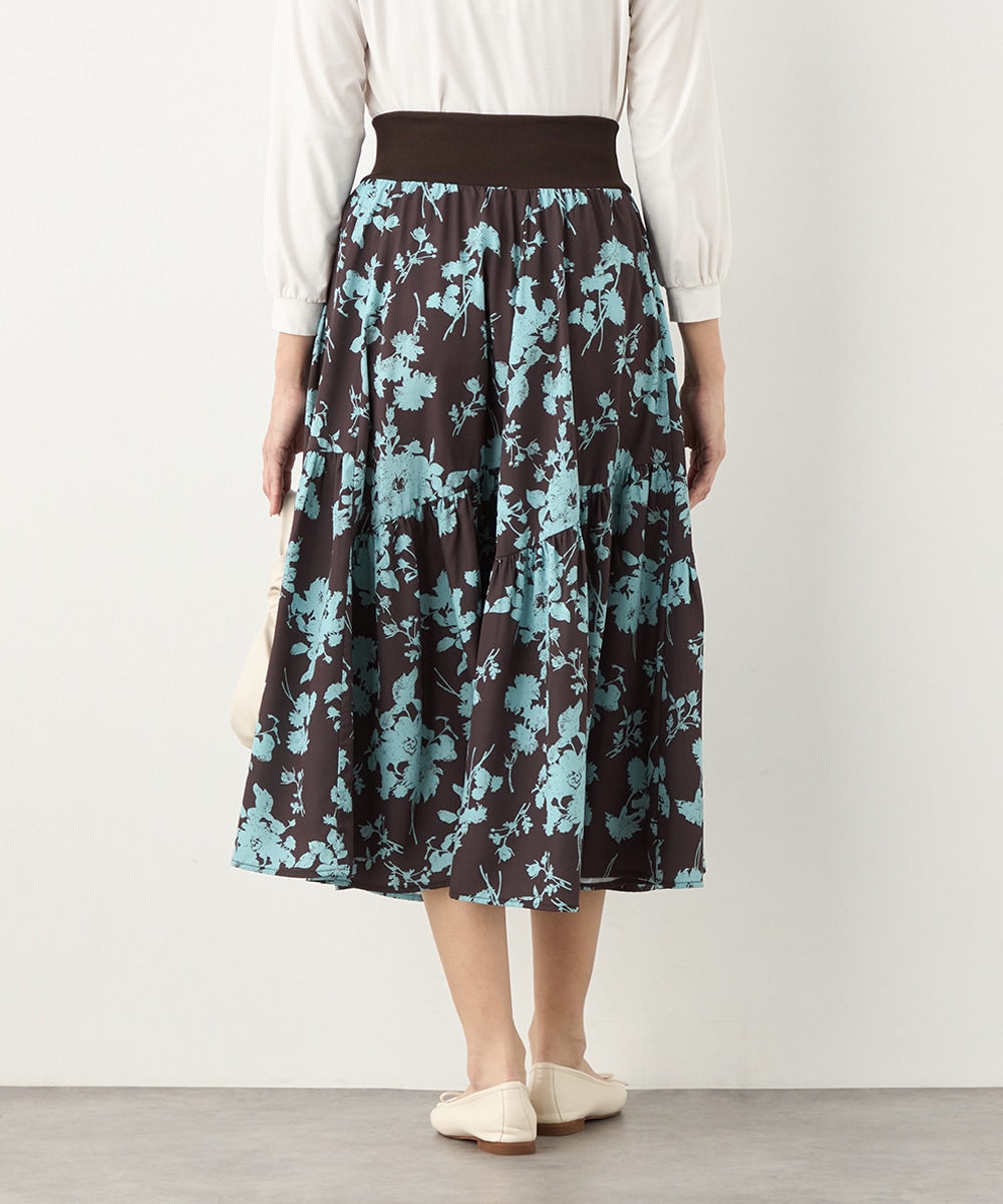 ほどよいボリュームのフラワーが上品な存在感を発揮しています。ふんわり感が愛らしい印象のティアードシルエット。切り替えを斜めにしているのもこだわりのポイントです。ウエストは太幅のリブ地を採用しており、スタイルのメリハリが強調されます。エレガントに穿ける長めの着丈です。