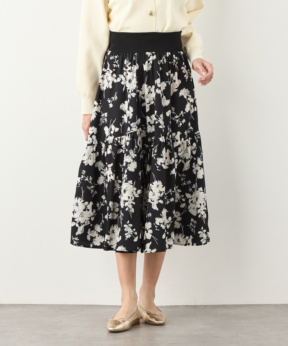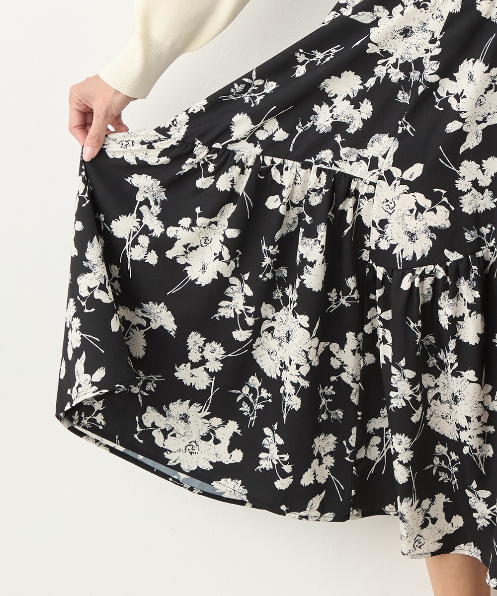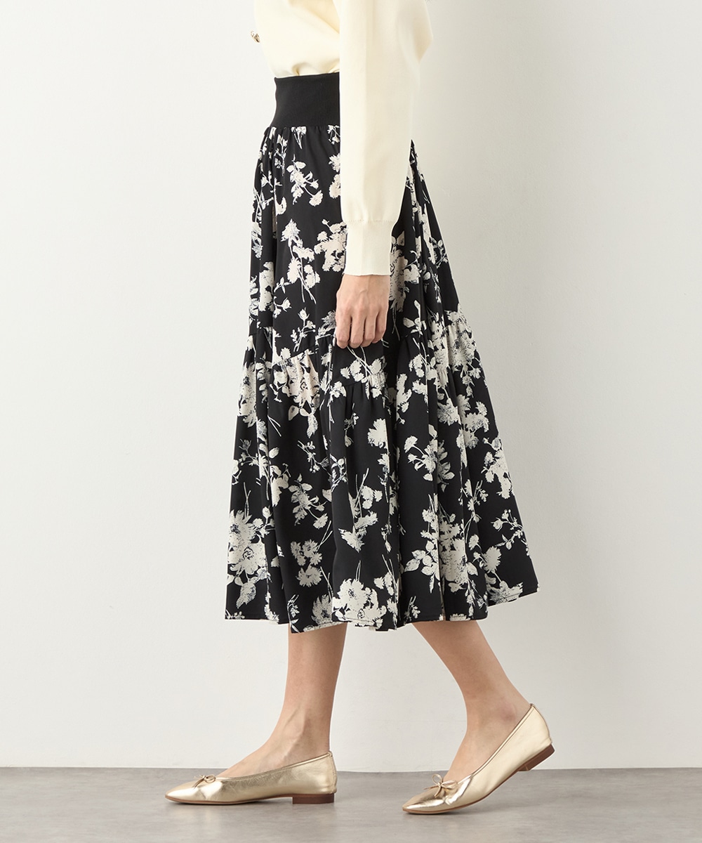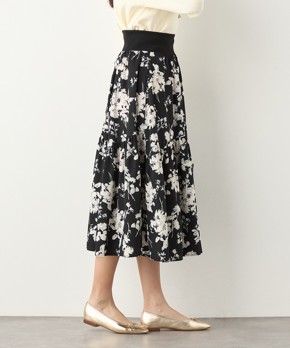 ほどよいボリュームのフラワーが上品な存在感を発揮しています。ふんわり感が愛らしい印象のティアードシルエット。切り替えを斜めにしているのもこだわりのポイントです。ウエストは太幅のリブ地を採用しており、スタイルのメリハリが強調されます。エレガントに穿ける長めの着丈です。
