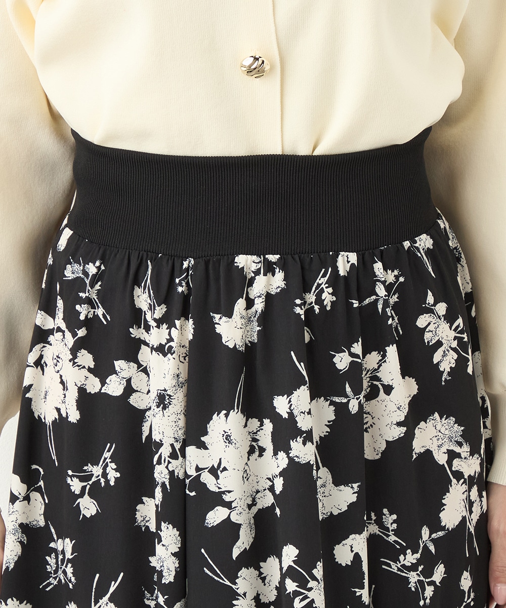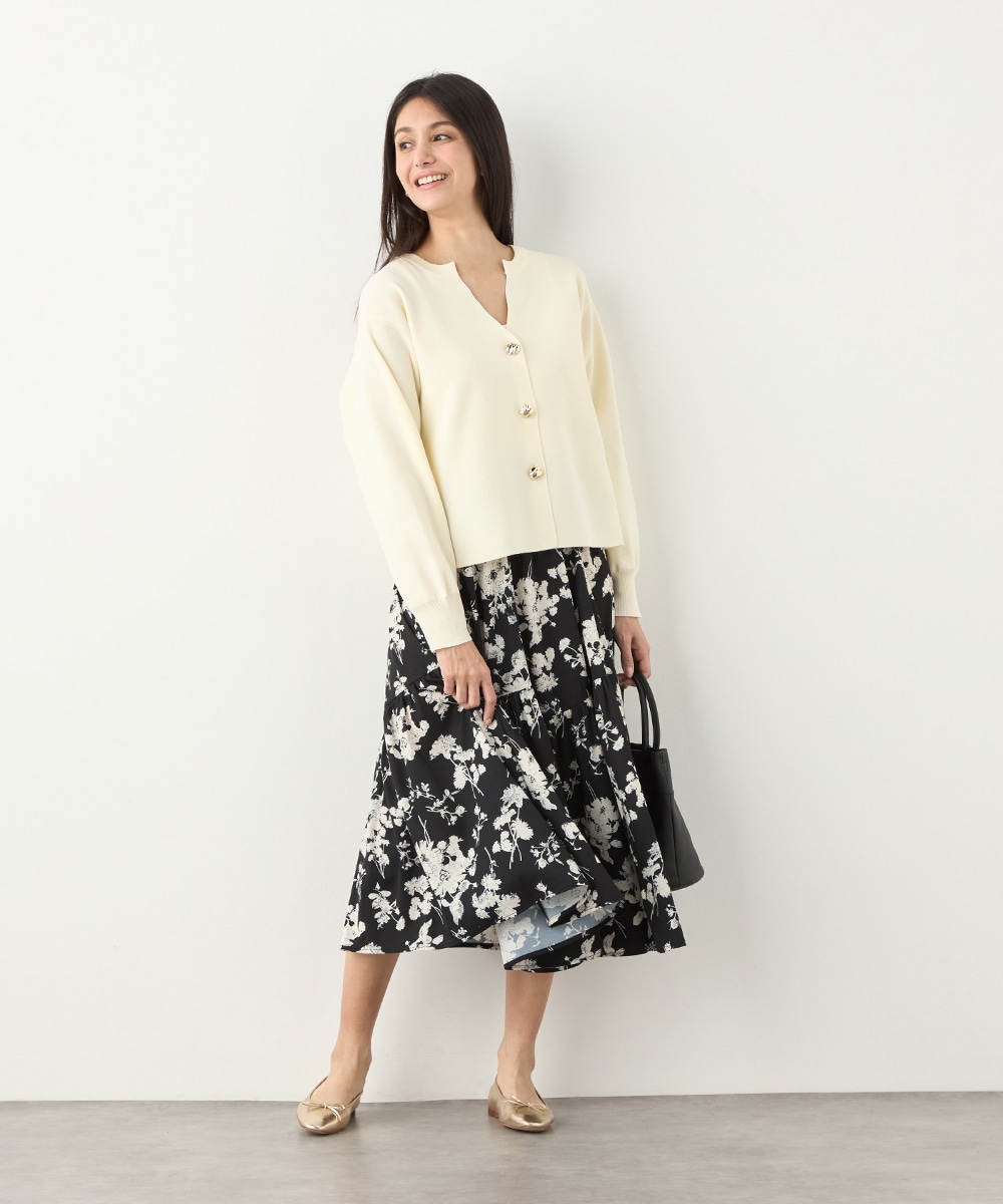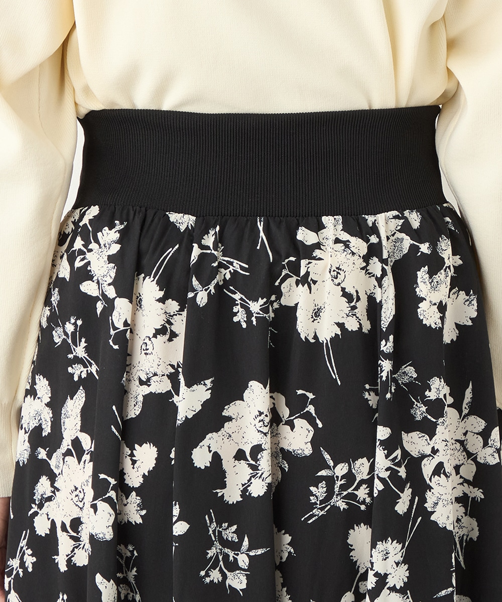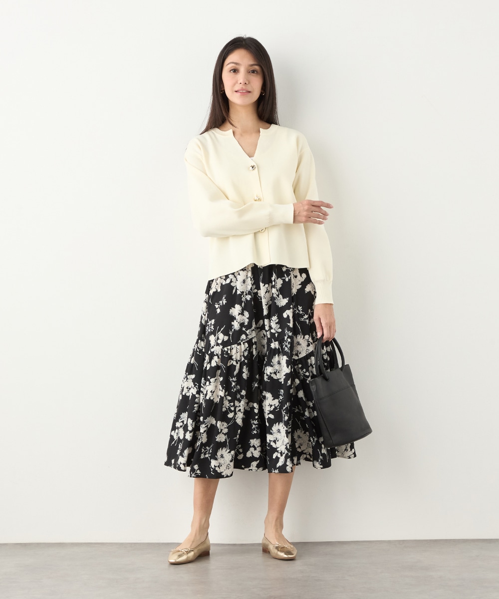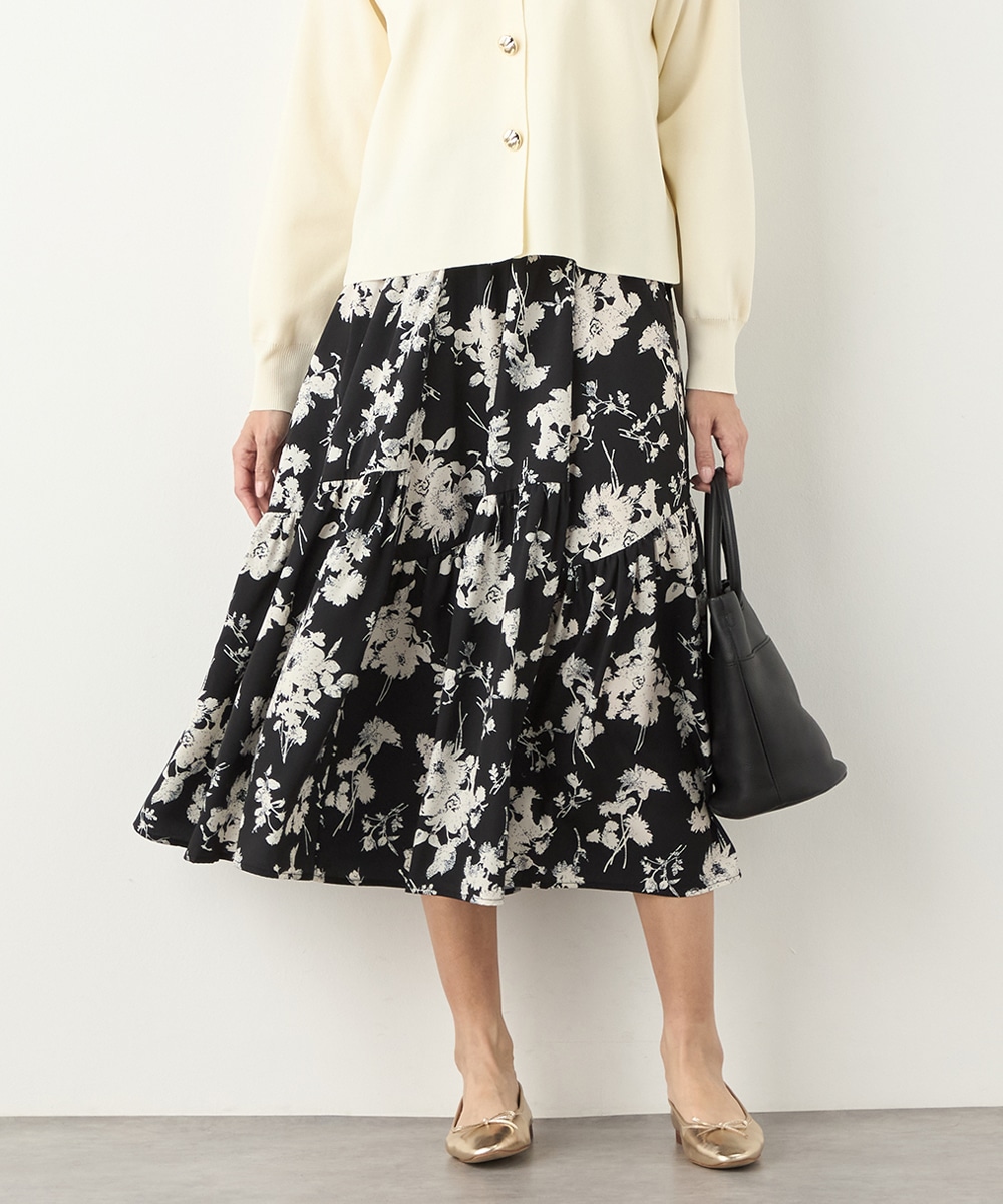 ほどよいボリュームのフラワーが上品な存在感を発揮しています。ふんわり感が愛らしい印象のティアードシルエット。切り替えを斜めにしているのもこだわりのポイントです。ウエストは太幅のリブ地を採用しており、スタイルのメリハリが強調されます。エレガントに穿ける長めの着丈です。