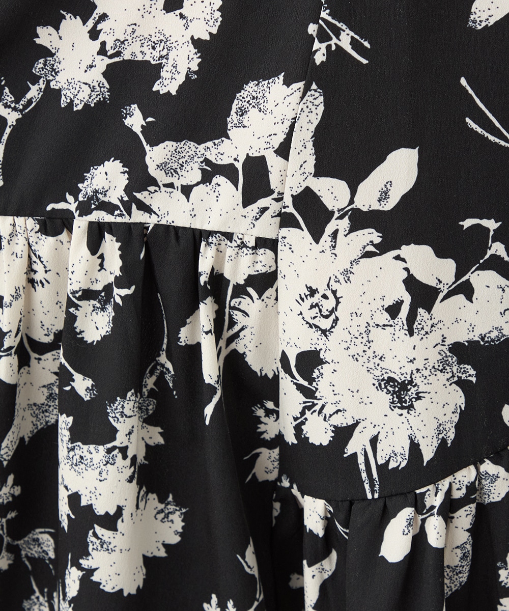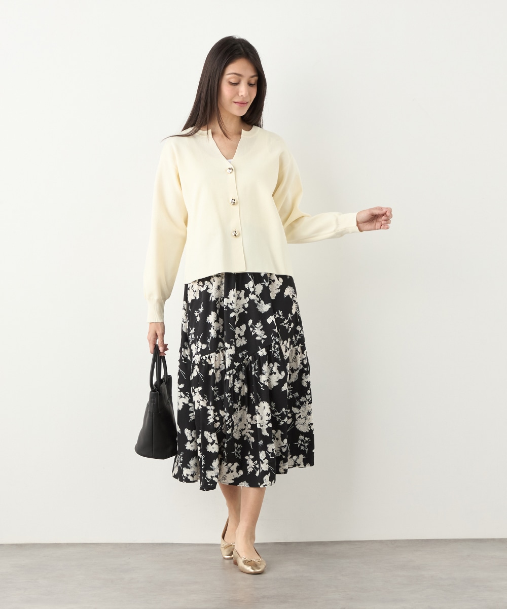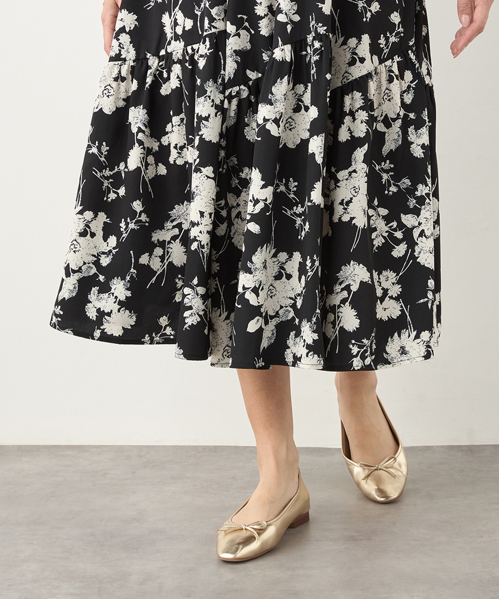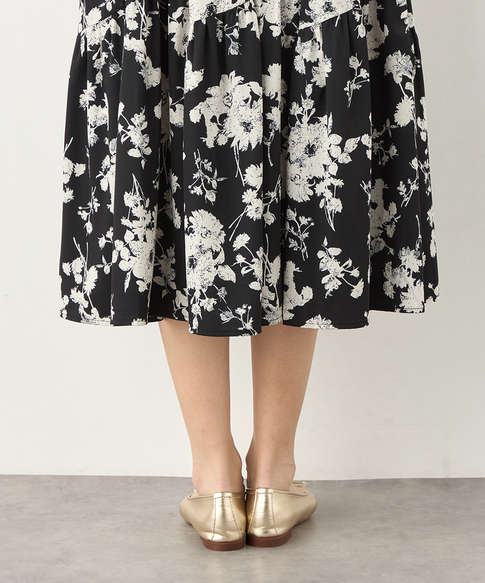 ほどよいボリュームのフラワーが上品な存在感を発揮しています。ふんわり感が愛らしい印象のティアードシルエット。切り替えを斜めにしているのもこだわりのポイントです。ウエストは太幅のリブ地を採用しており、スタイルのメリハリが強調されます。エレガントに穿ける長めの着丈です。