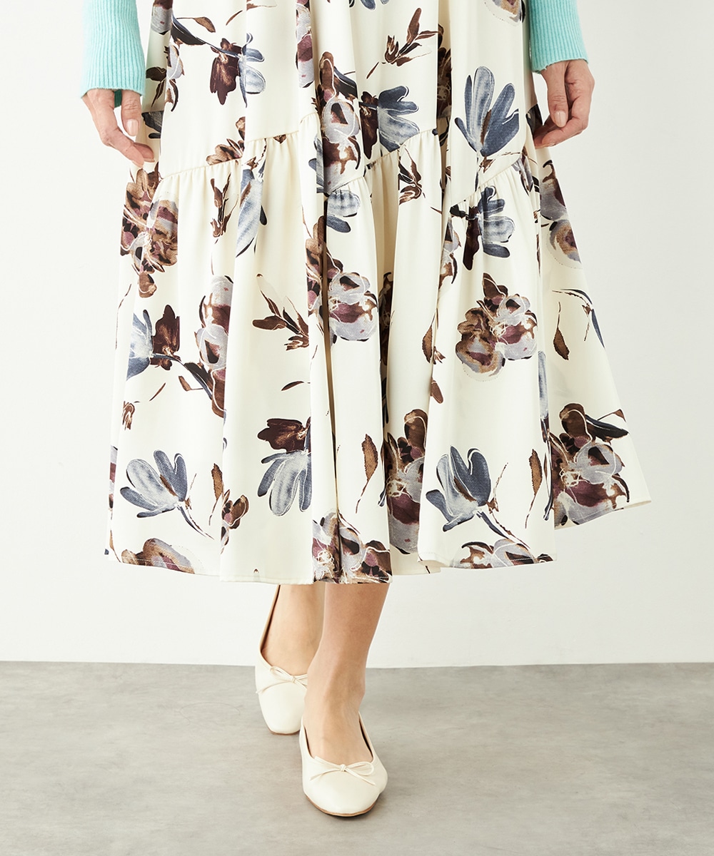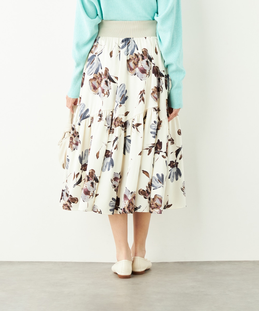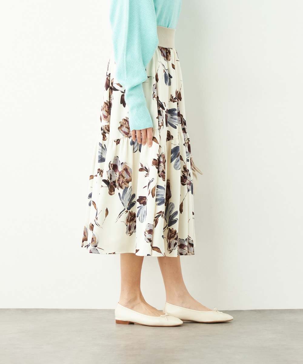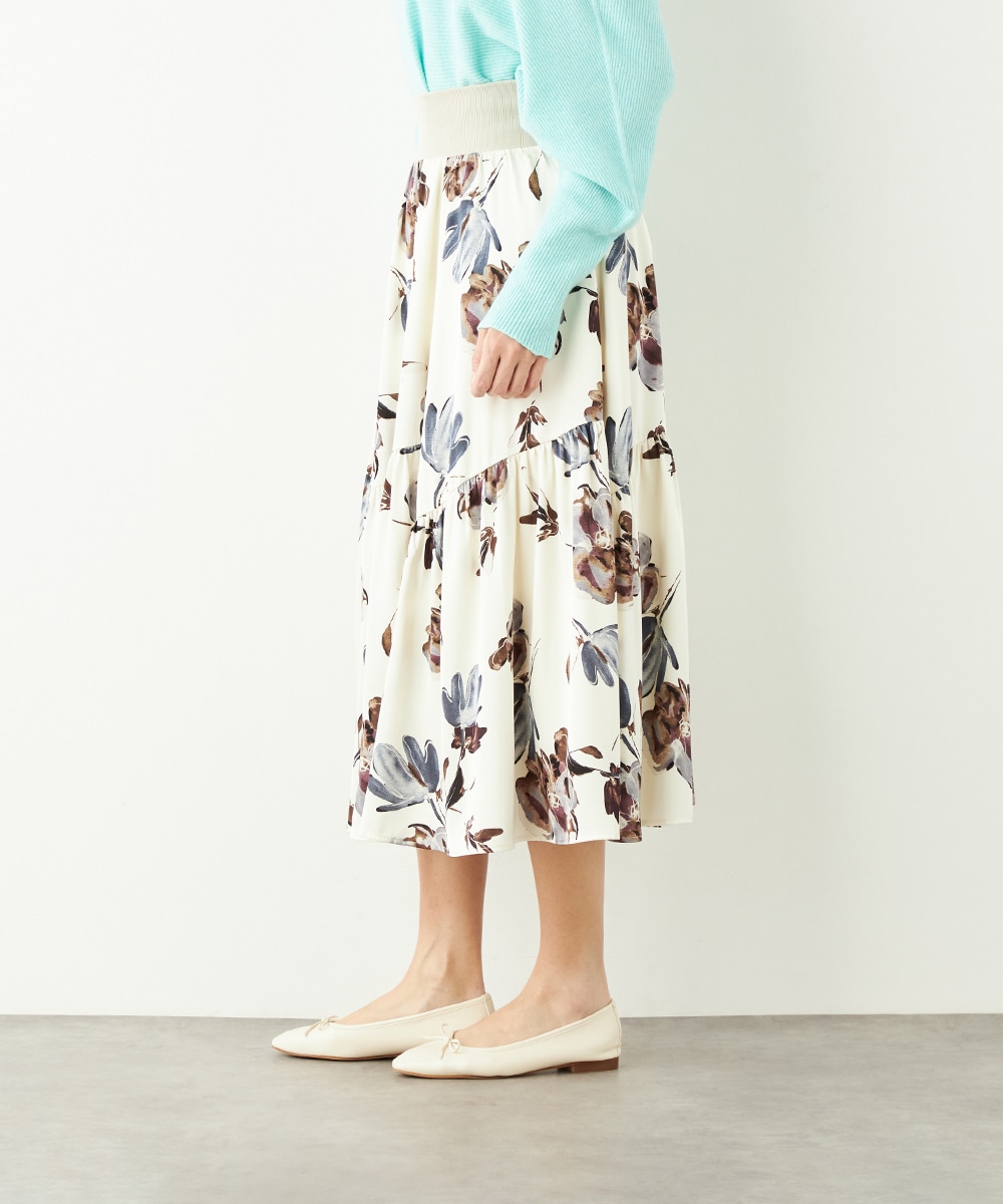 柄は手描き調のタッチでデザインされ、優しくナチュラルな雰囲気が魅力です。斜めにしたティアード切り替えがモード感をさりげなくプラスして、甘くなりすぎず大人可愛く穿きこなせます。品の良さが感じられるロング丈を採用。ウエストの太幅のリブ使いがスポーティなアクセントとしても効いています。