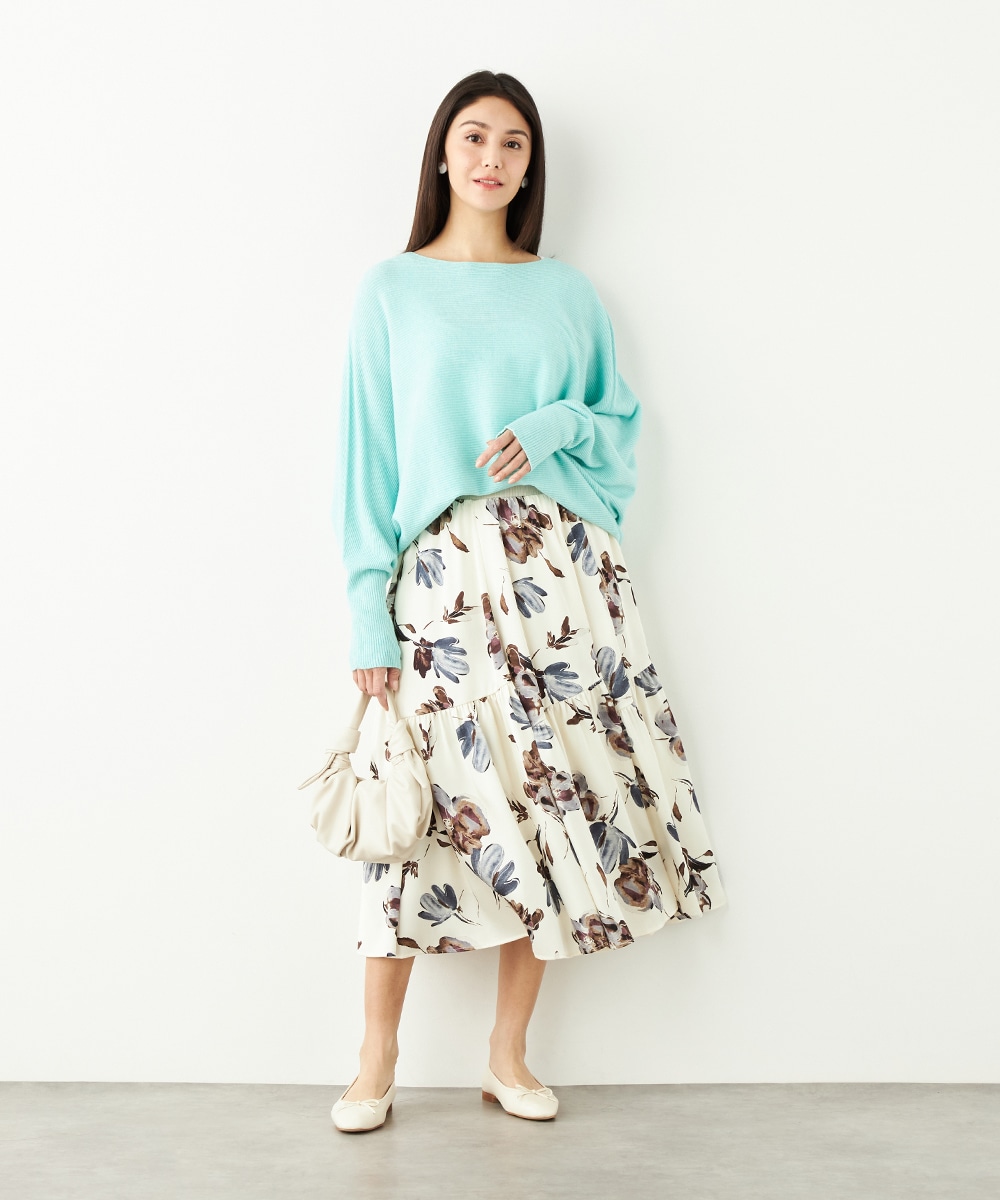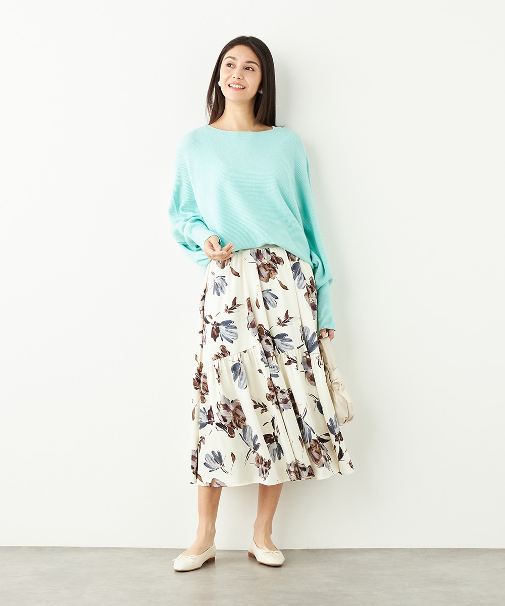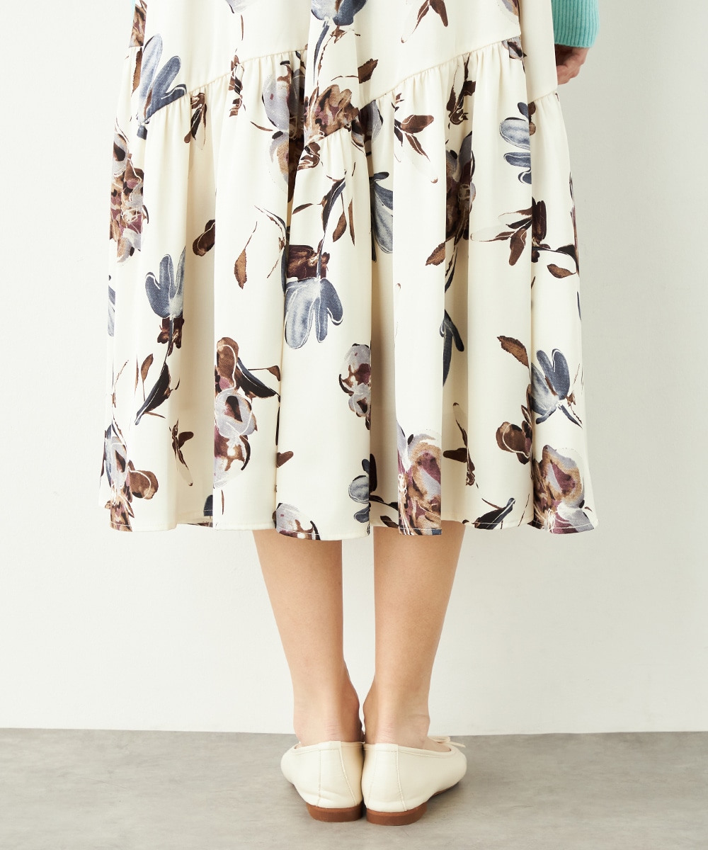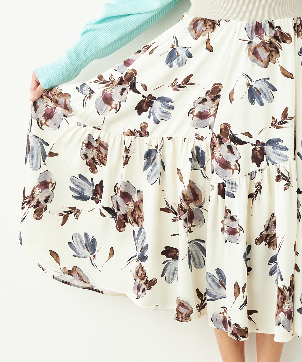 柄は手描き調のタッチでデザインされ、優しくナチュラルな雰囲気が魅力です。斜めにしたティアード切り替えがモード感をさりげなくプラスして、甘くなりすぎず大人可愛く穿きこなせます。品の良さが感じられるロング丈を採用。ウエストの太幅のリブ使いがスポーティなアクセントとしても効いています。