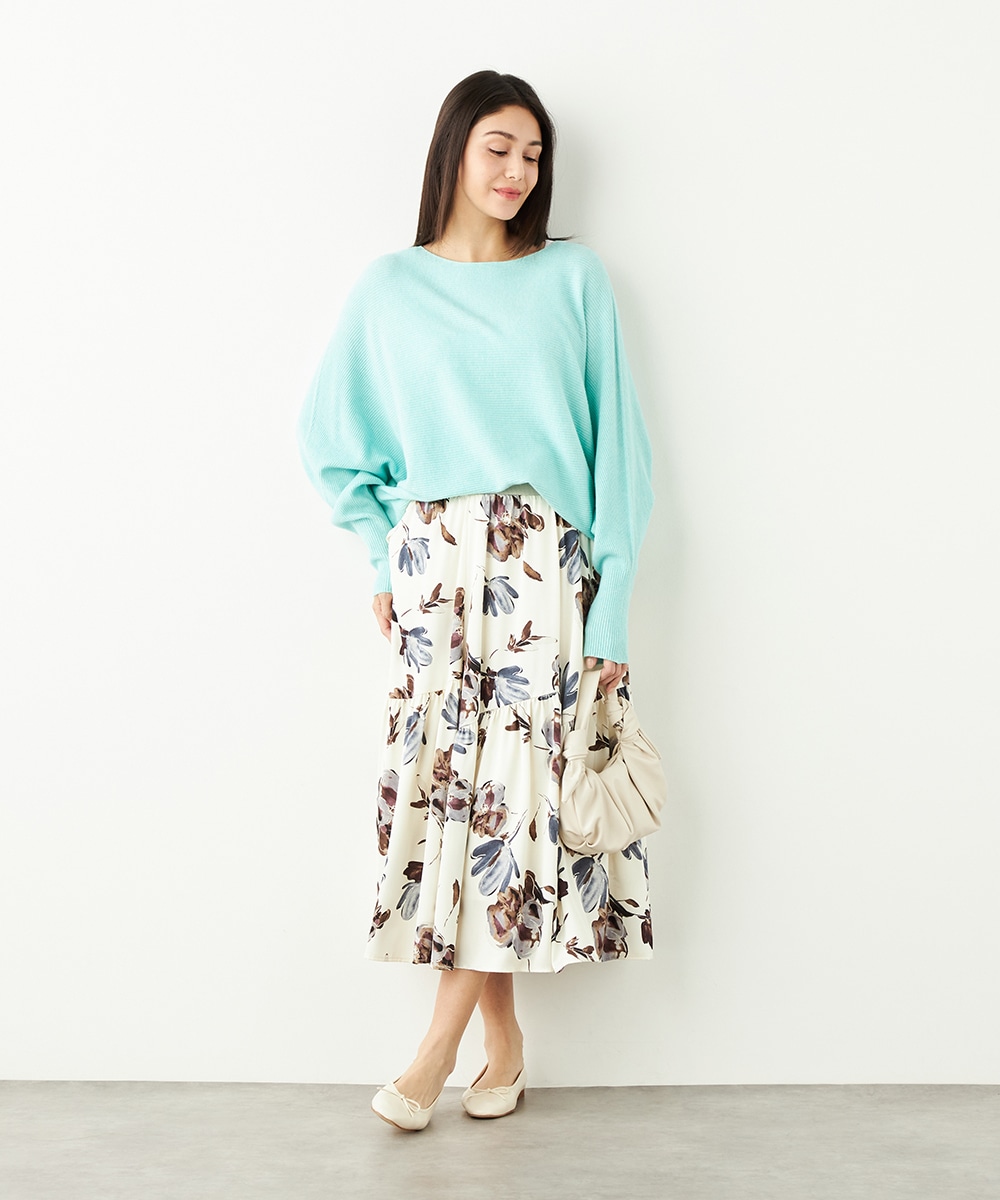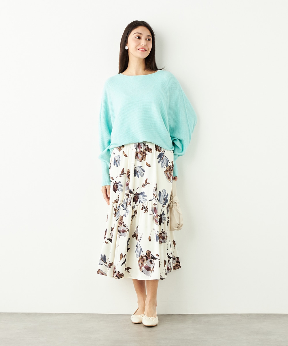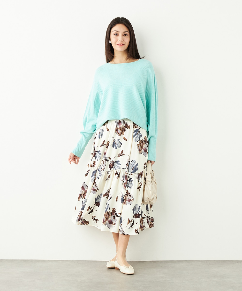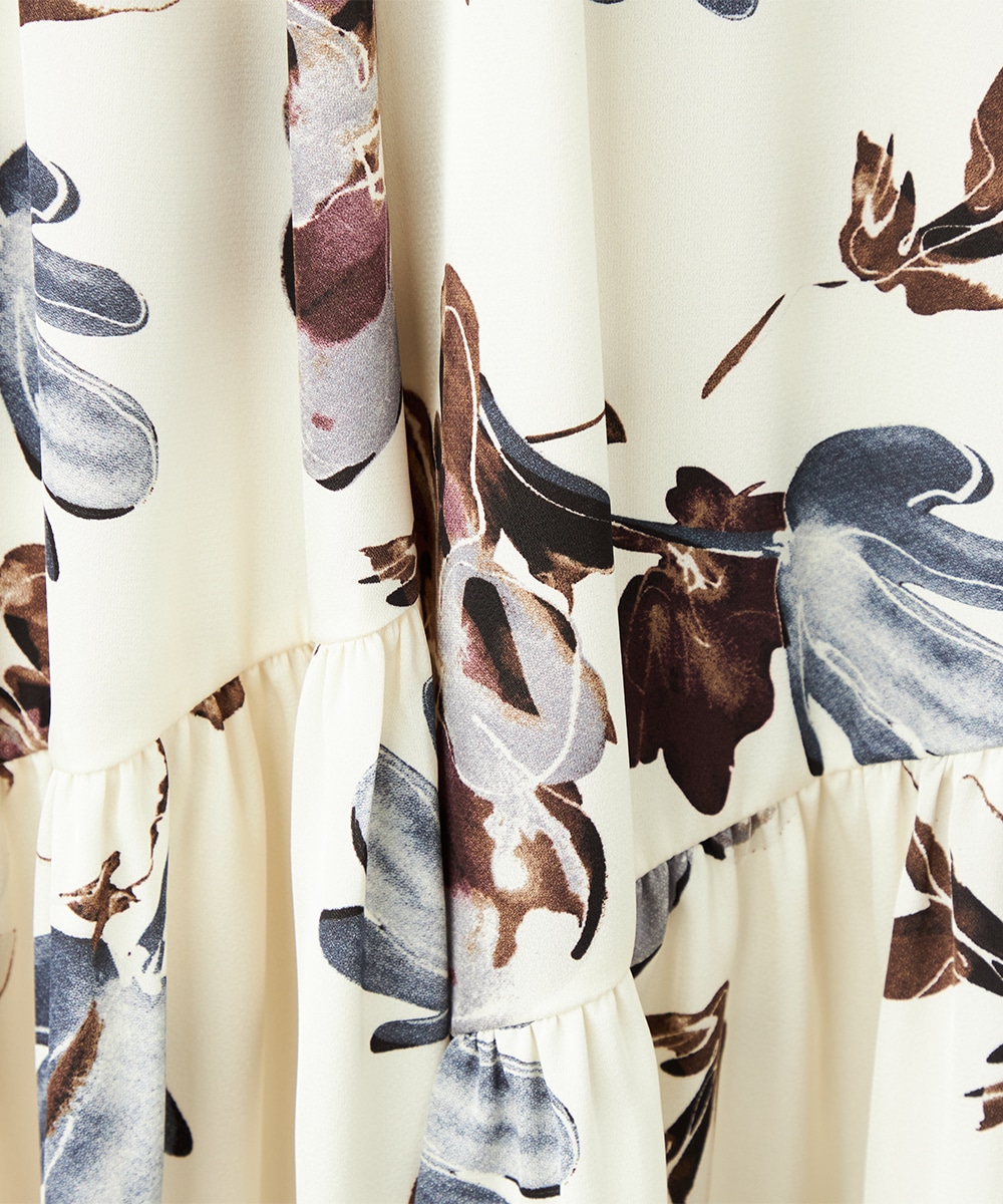 柄は手描き調のタッチでデザインされ、優しくナチュラルな雰囲気が魅力です。斜めにしたティアード切り替えがモード感をさりげなくプラスして、甘くなりすぎず大人可愛く穿きこなせます。品の良さが感じられるロング丈を採用。ウエストの太幅のリブ使いがスポーティなアクセントとしても効いています。