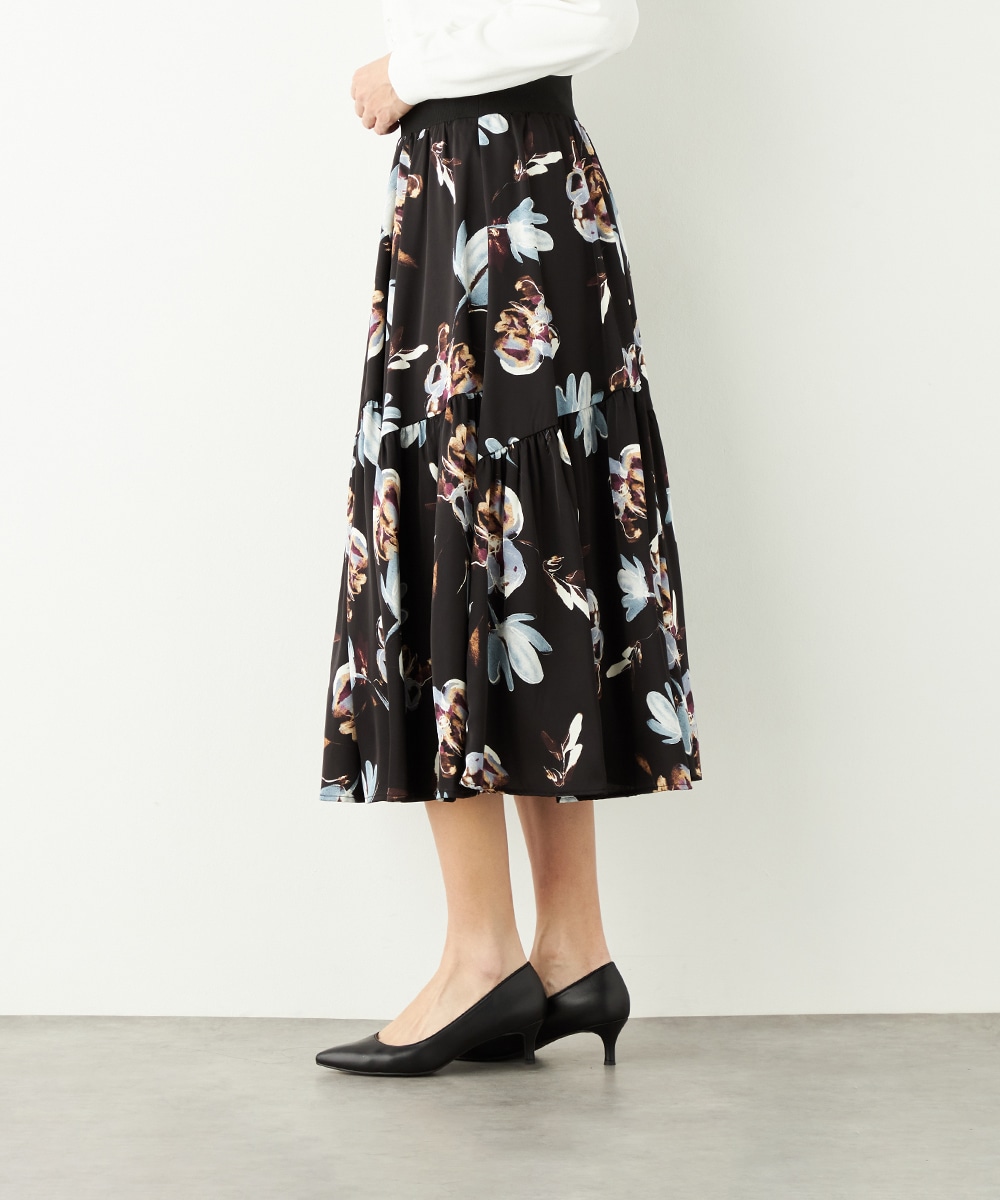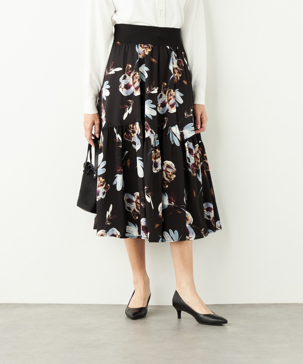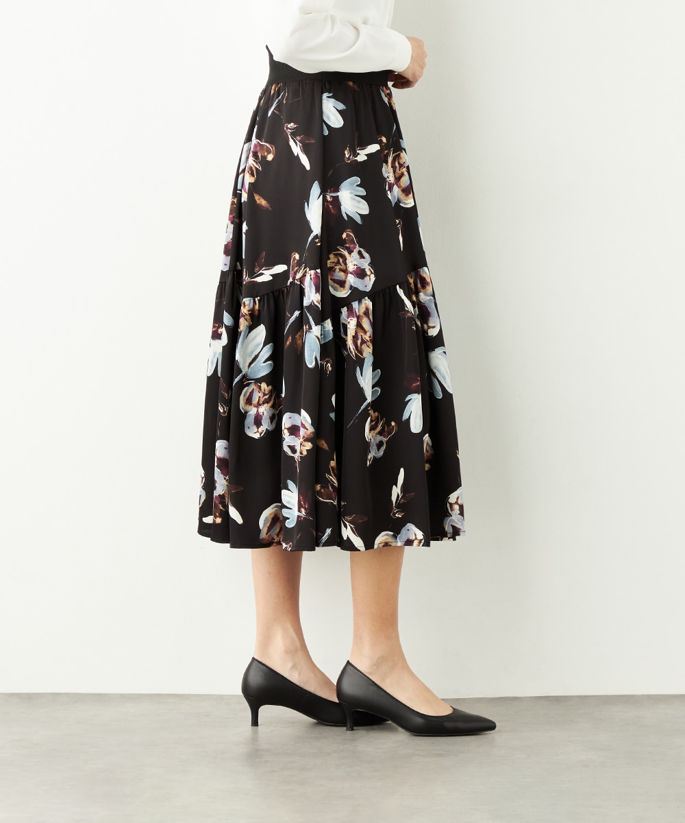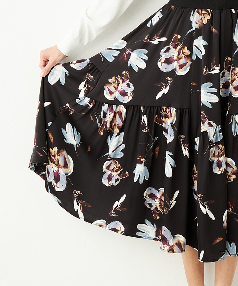 柄は手描き調のタッチでデザインされ、優しくナチュラルな雰囲気が魅力です。斜めにしたティアード切り替えがモード感をさりげなくプラスして、甘くなりすぎず大人可愛く穿きこなせます。品の良さが感じられるロング丈を採用。ウエストの太幅のリブ使いがスポーティなアクセントとしても効いています。