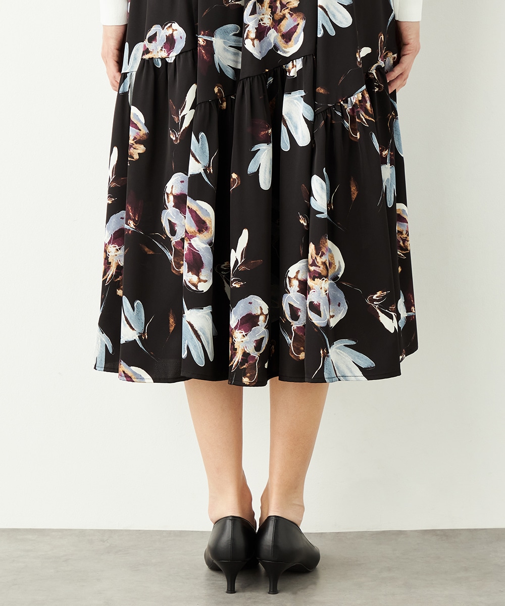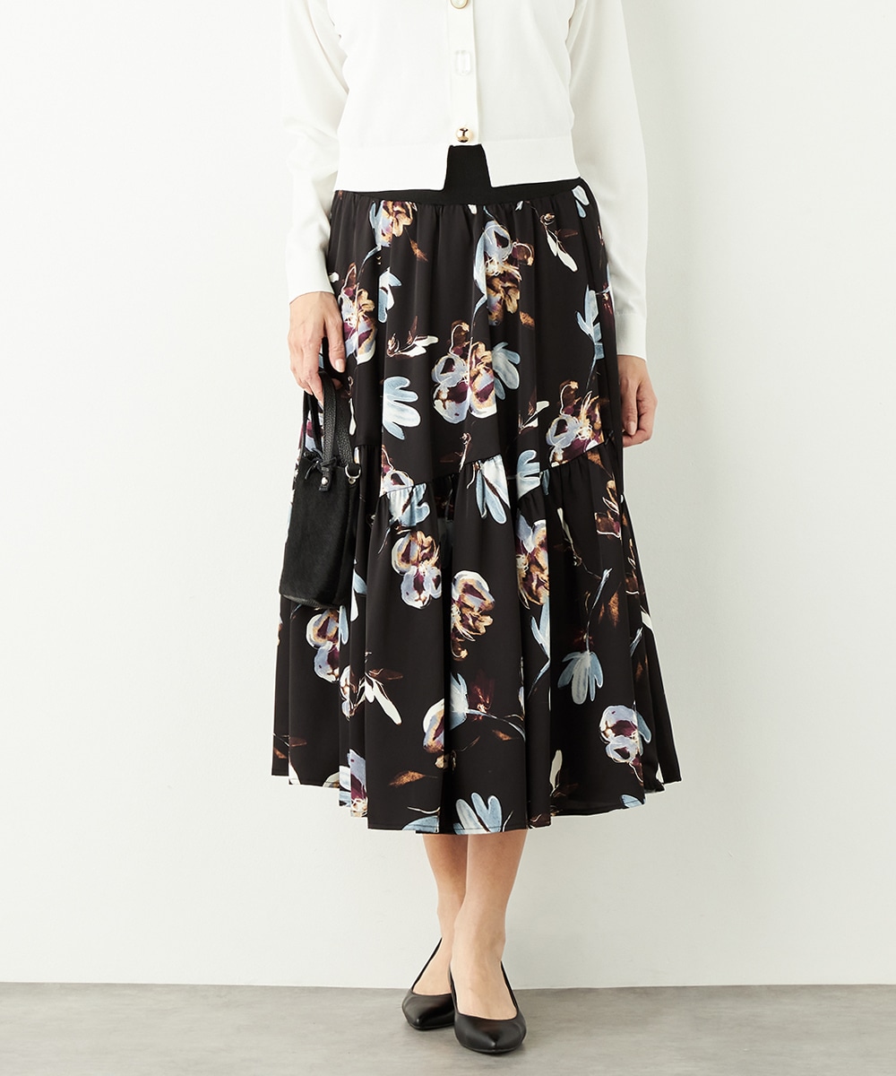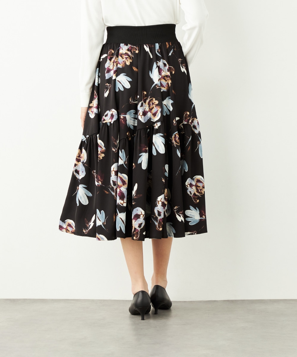 柄は手描き調のタッチでデザインされ、優しくナチュラルな雰囲気が魅力です。斜めにしたティアード切り替えがモード感をさりげなくプラスして、甘くなりすぎず大人可愛く穿きこなせます。品の良さが感じられるロング丈を採用。ウエストの太幅のリブ使いがスポーティなアクセントとしても効いています。