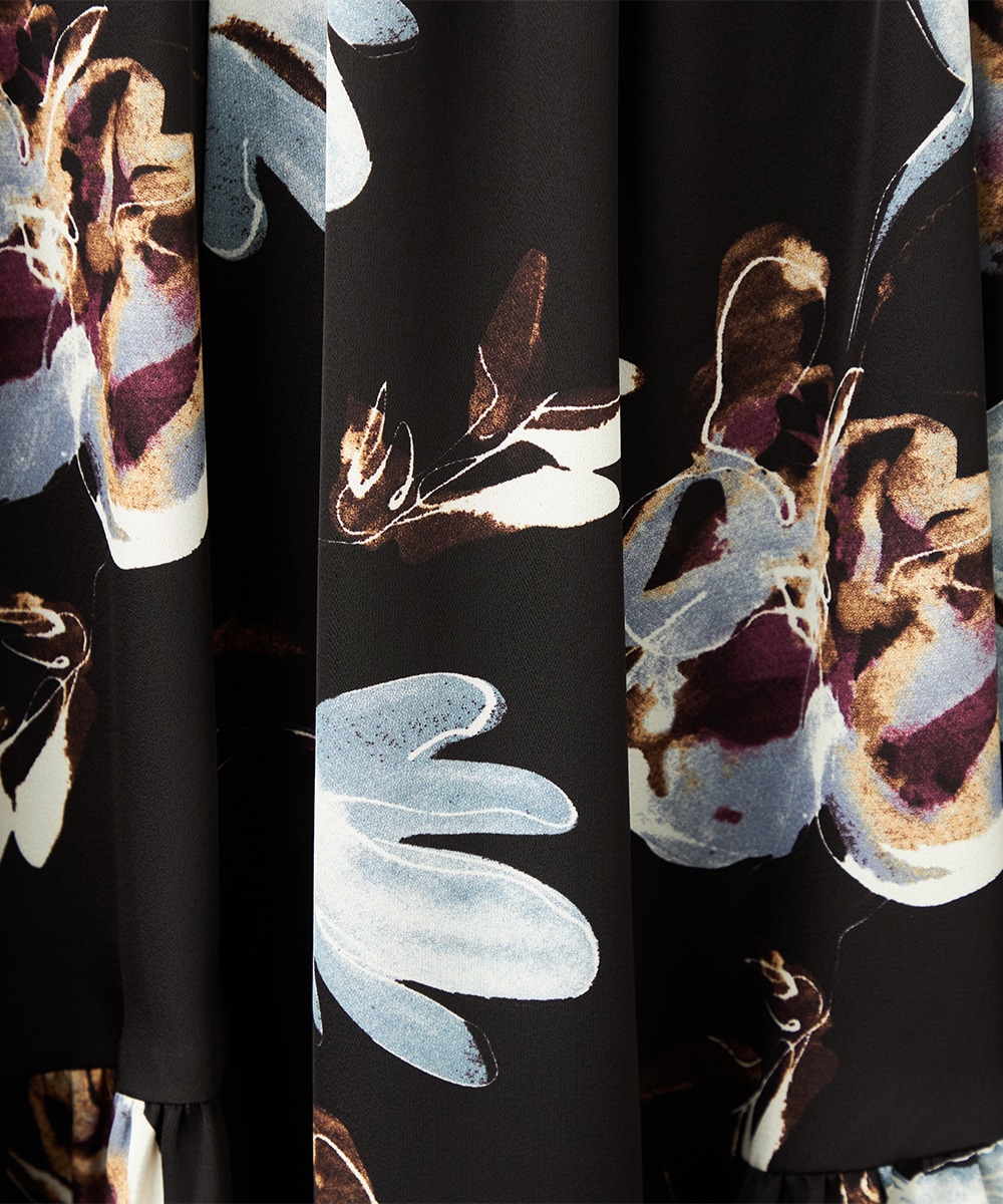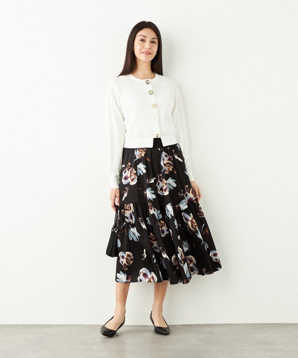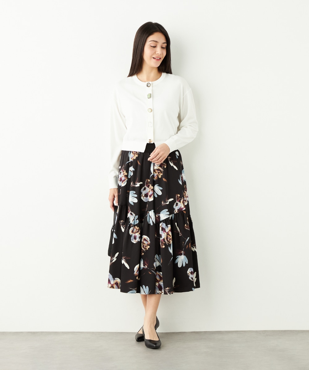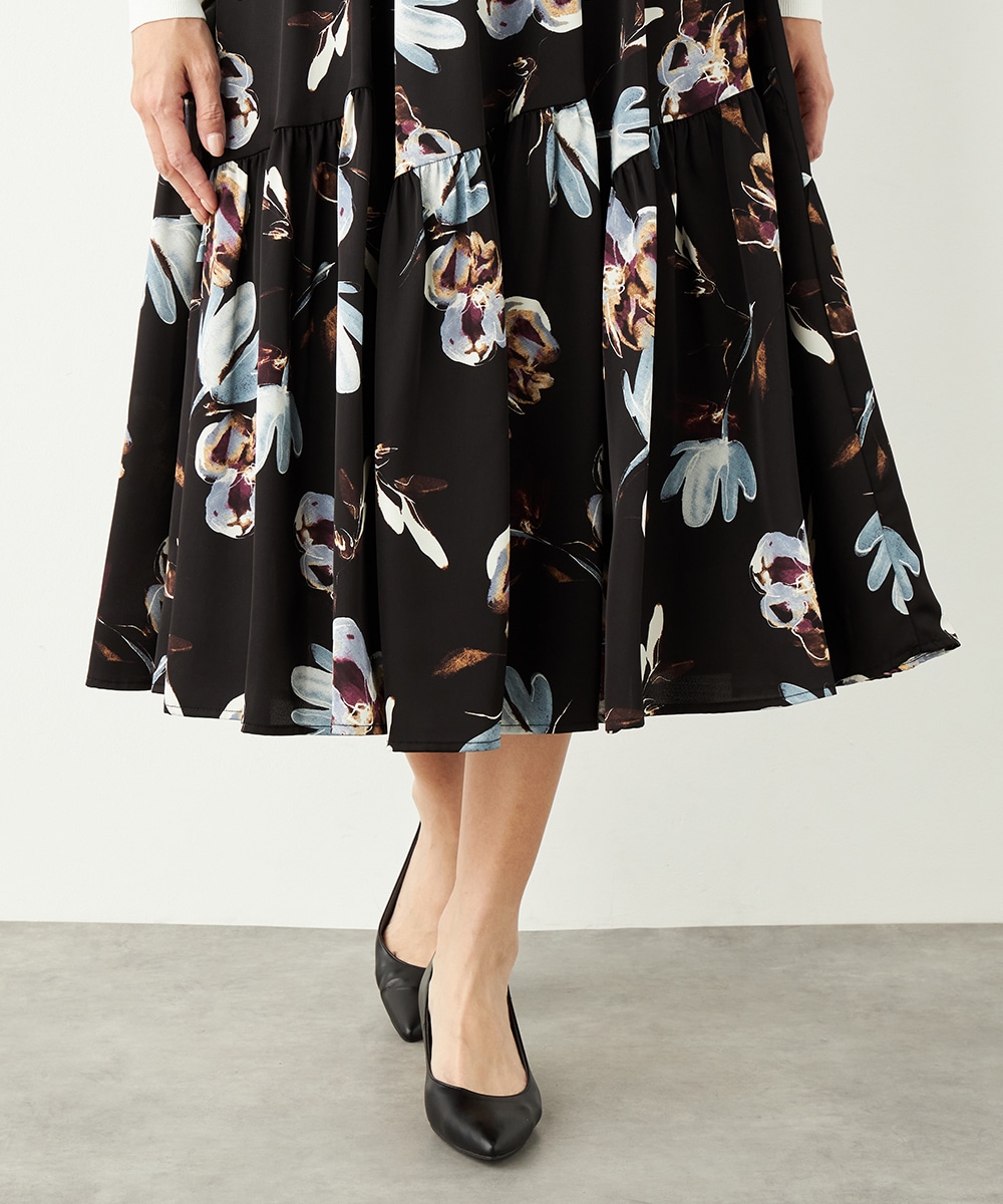 柄は手描き調のタッチでデザインされ、優しくナチュラルな雰囲気が魅力です。斜めにしたティアード切り替えがモード感をさりげなくプラスして、甘くなりすぎず大人可愛く穿きこなせます。品の良さが感じられるロング丈を採用。ウエストの太幅のリブ使いがスポーティなアクセントとしても効いています。