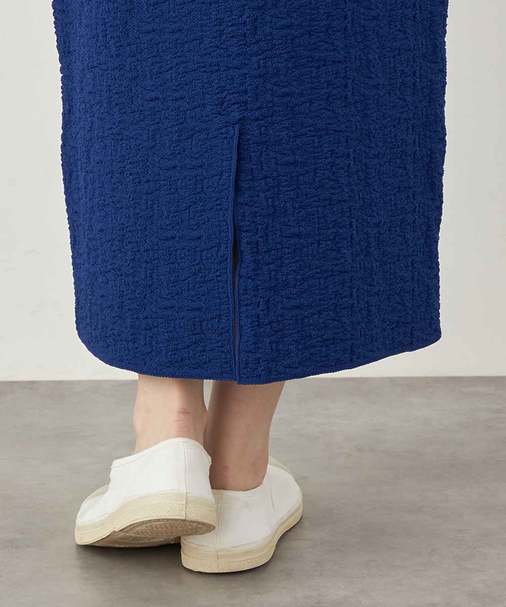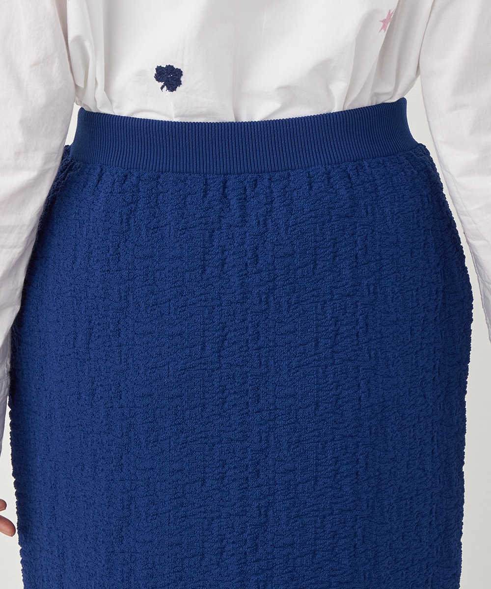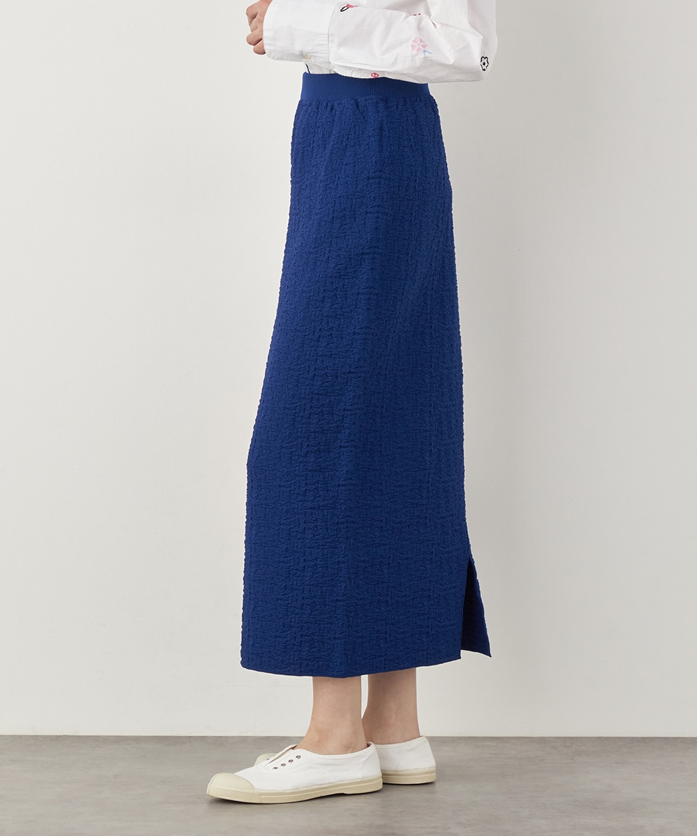 穿き心地が良く、デイリーにもぴったりな1枚です。ウエストのリブ切り替えがアクセントとしても効いています。後ろ中心には足さばきを良くするスリットをデザイン。魚沼産の柔らかな風合いのニット素材です。リサイクルポリエステルであるECOPETを使用して、環境にも配慮しています。